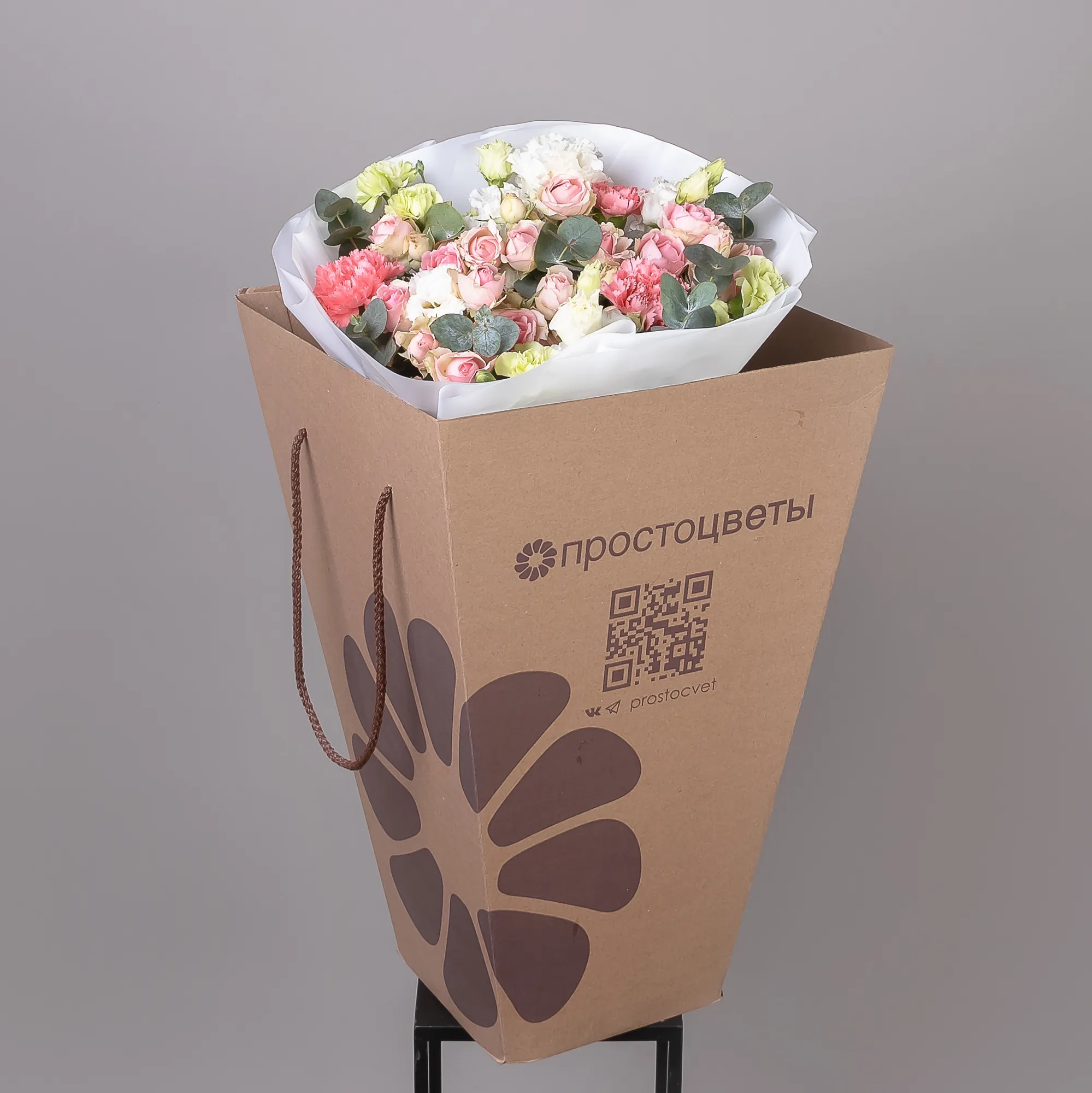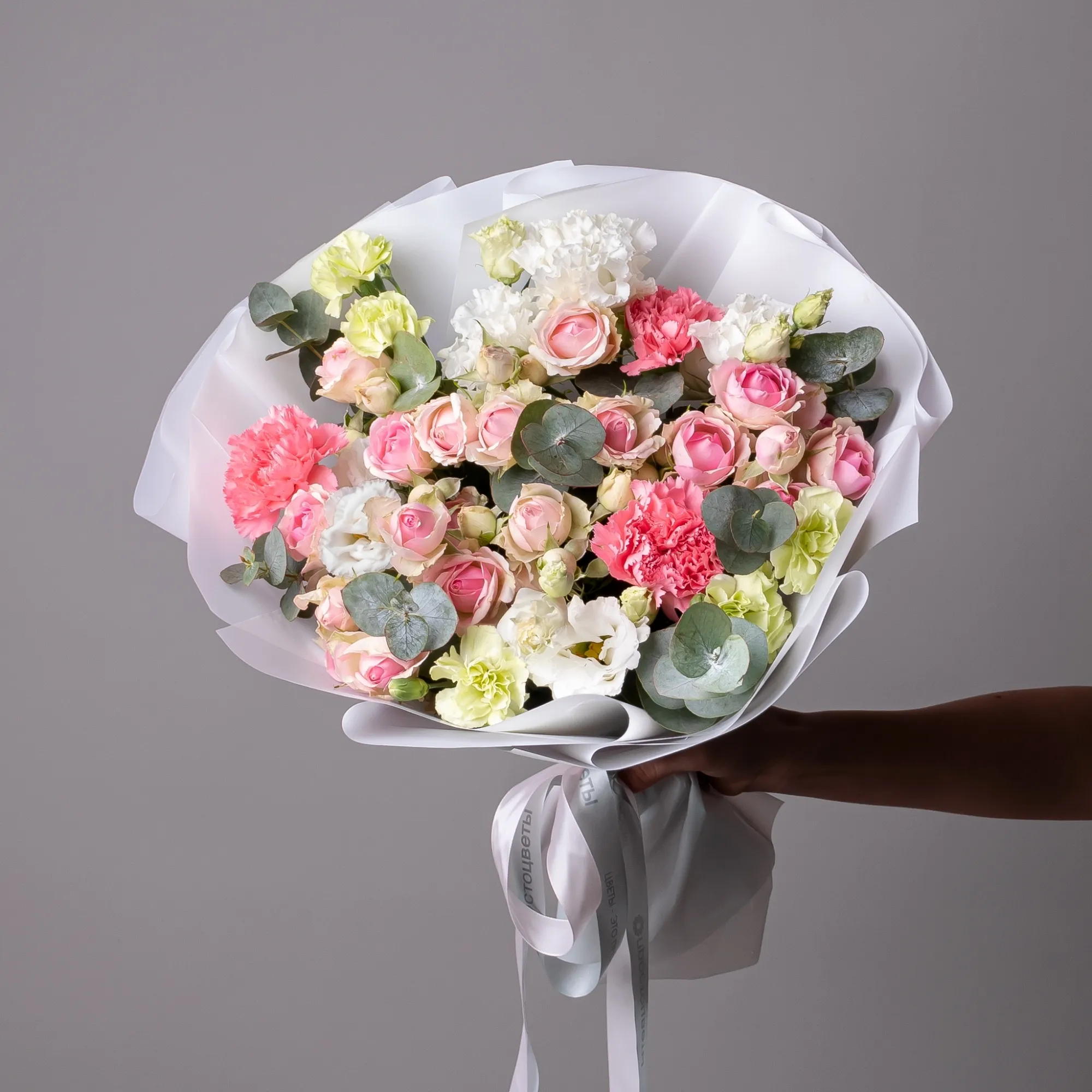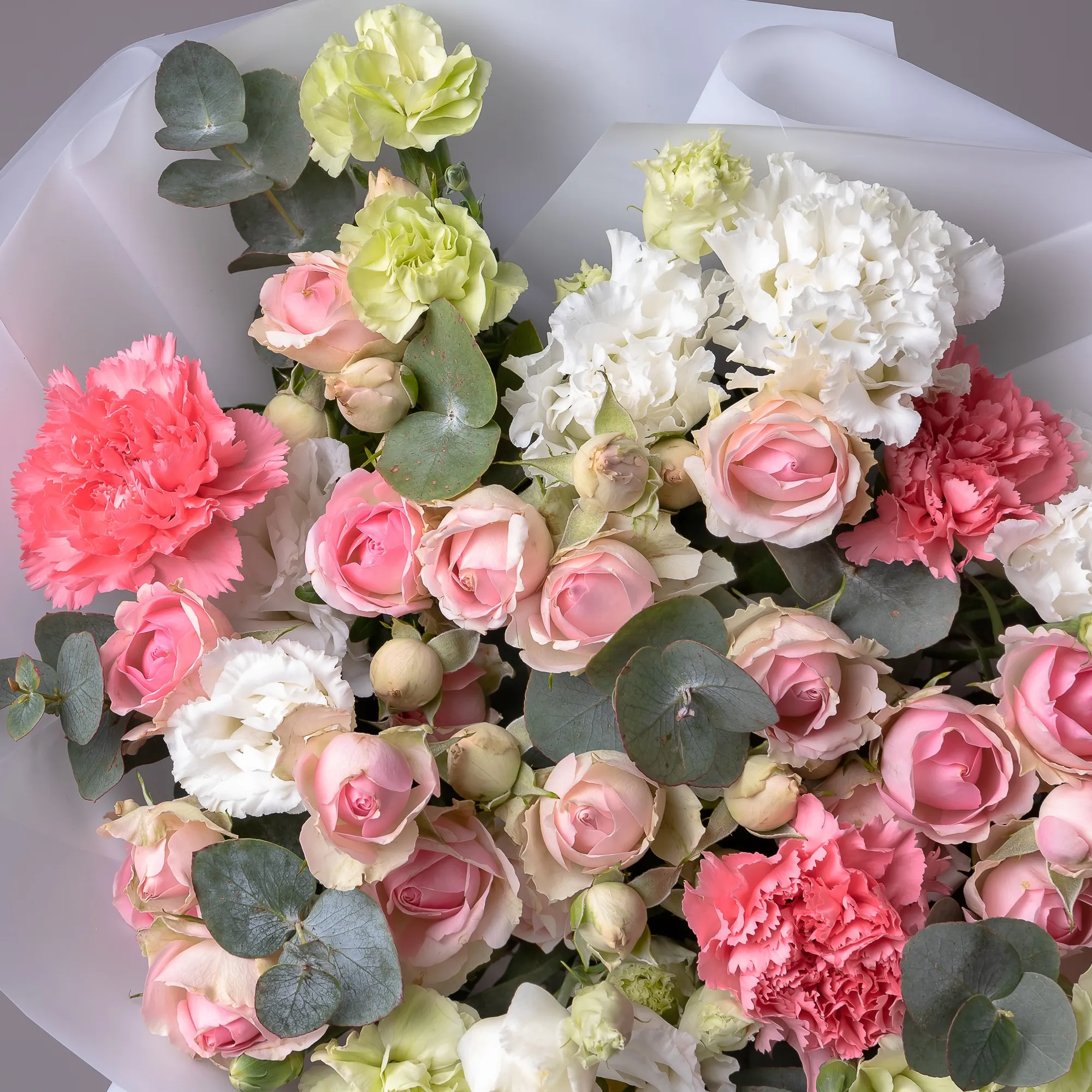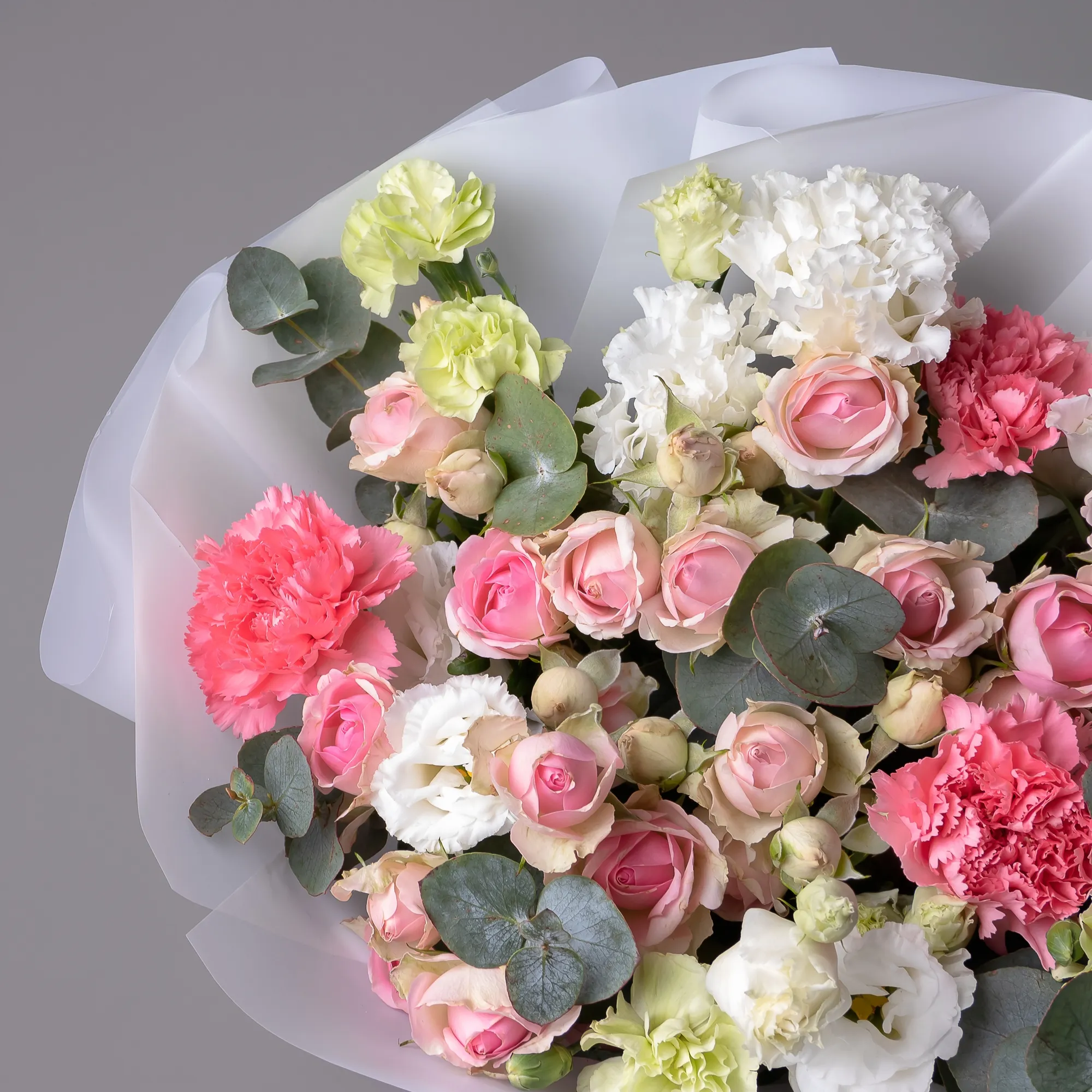 Гвоздика, Роза, Эустома, Листья фисташки, Листья эвкалипта