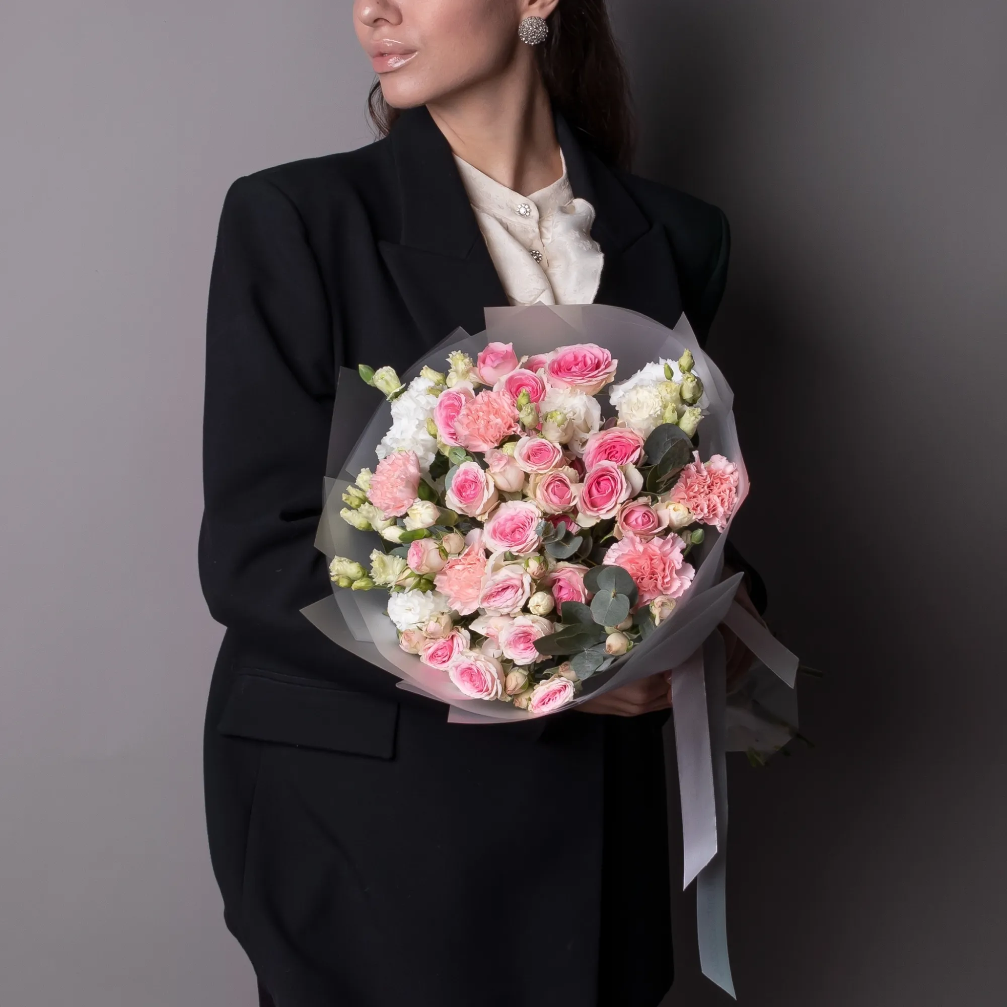 Гвоздика, Роза, Эустома, Листья фисташки, Листья эвкалипта