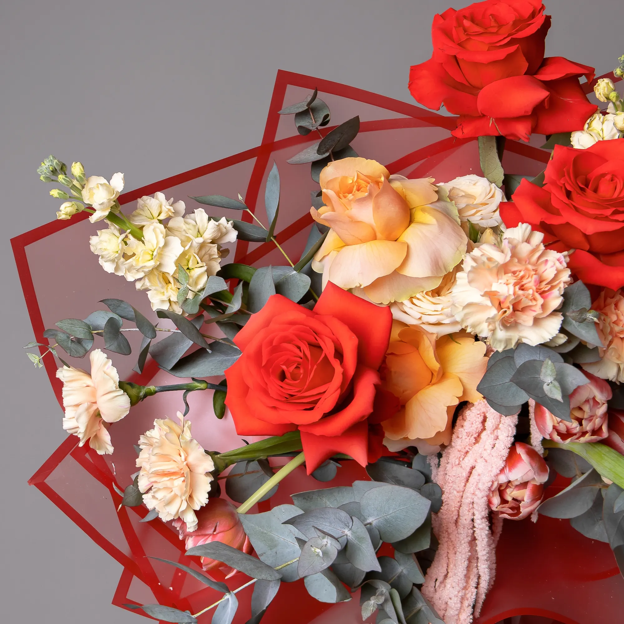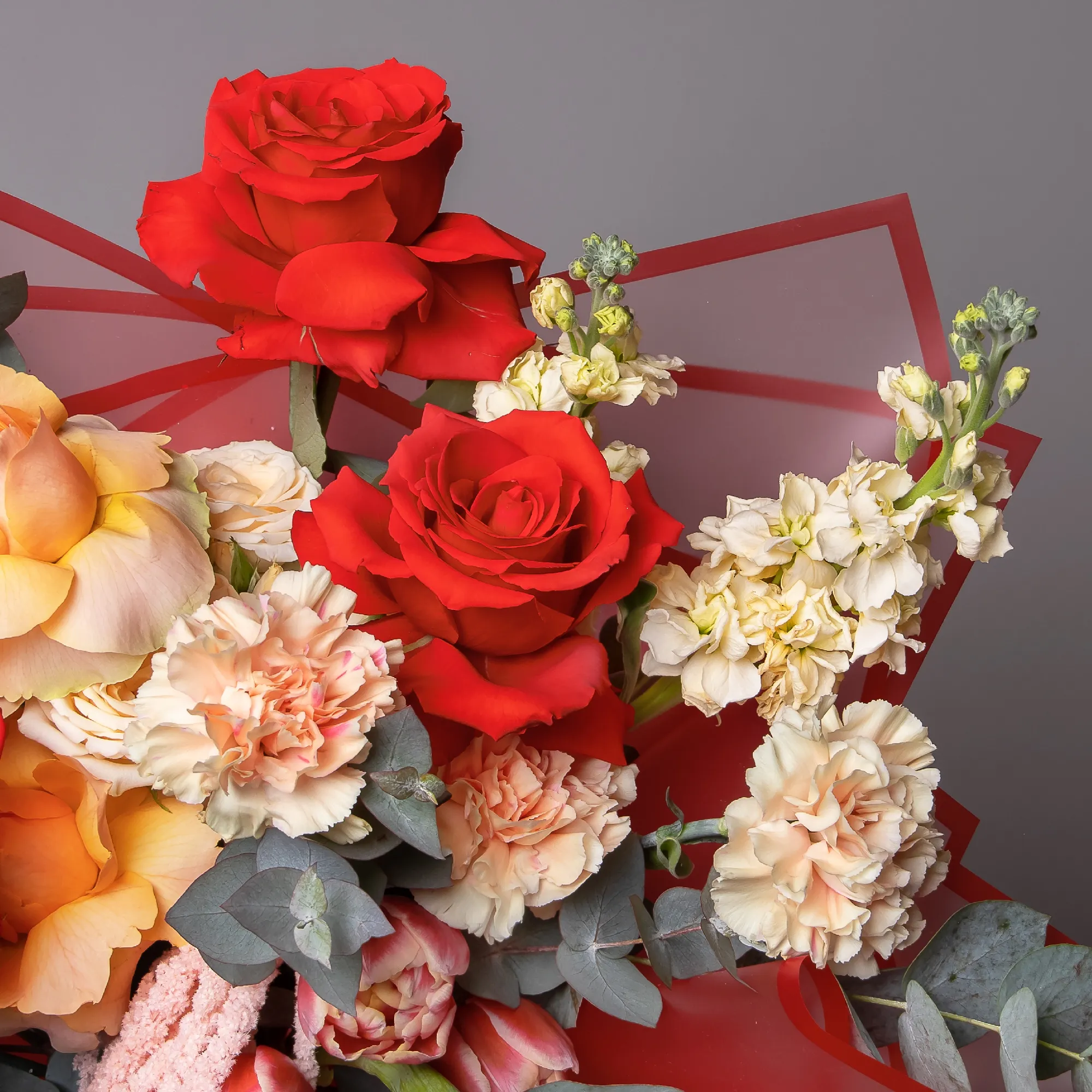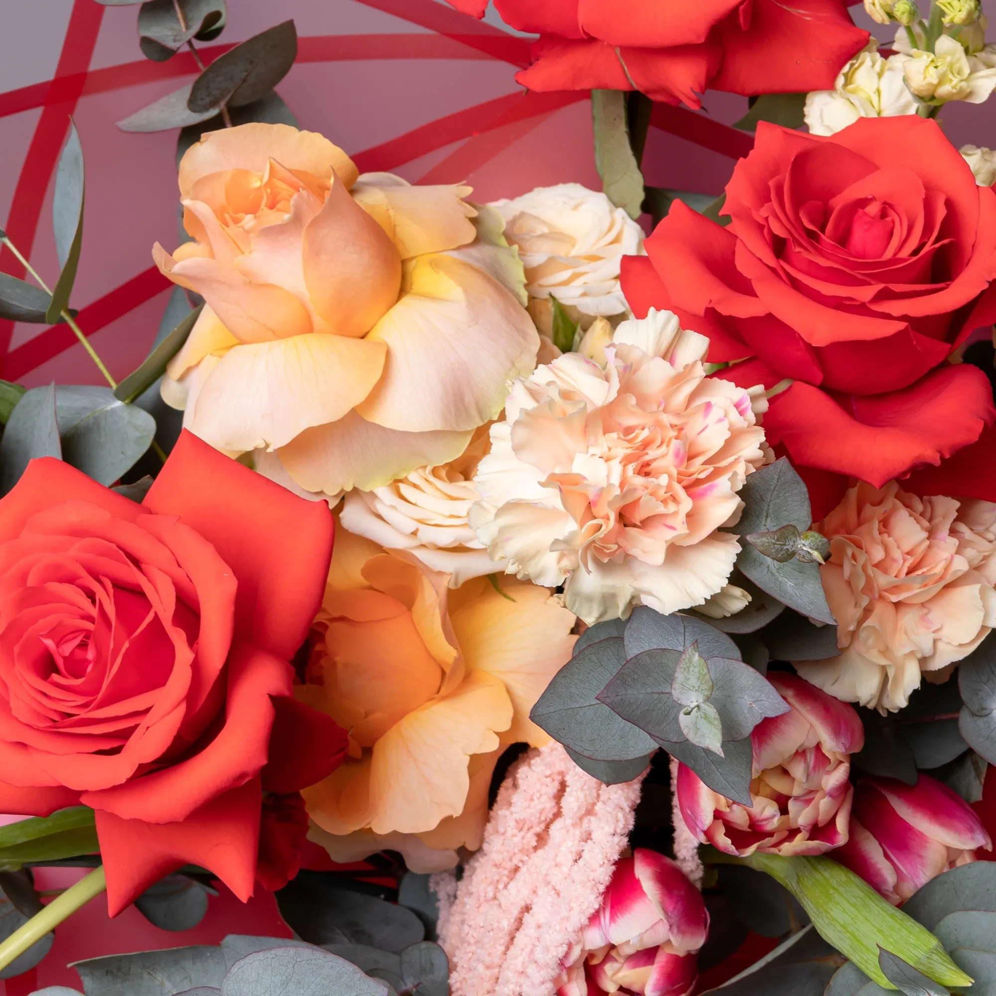 Гвоздика-5, Роза-5, Тюльпан-5, Маттиола-3, Роза кустовая-1, Листья эвкалипта-5