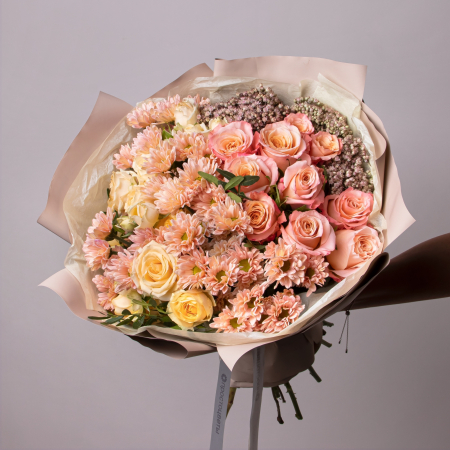 Букет Серенада - собрание из роз и хризантемы нежных красок, элегантно дополненное литьями фисташки, напоминает знаменитые картины русских классиков и чувство ностальгии. Такой букет не оставит равнодушным к случаю юбилея, романтической встрече в просторных залах галереи, а также на профессиональный праздник.