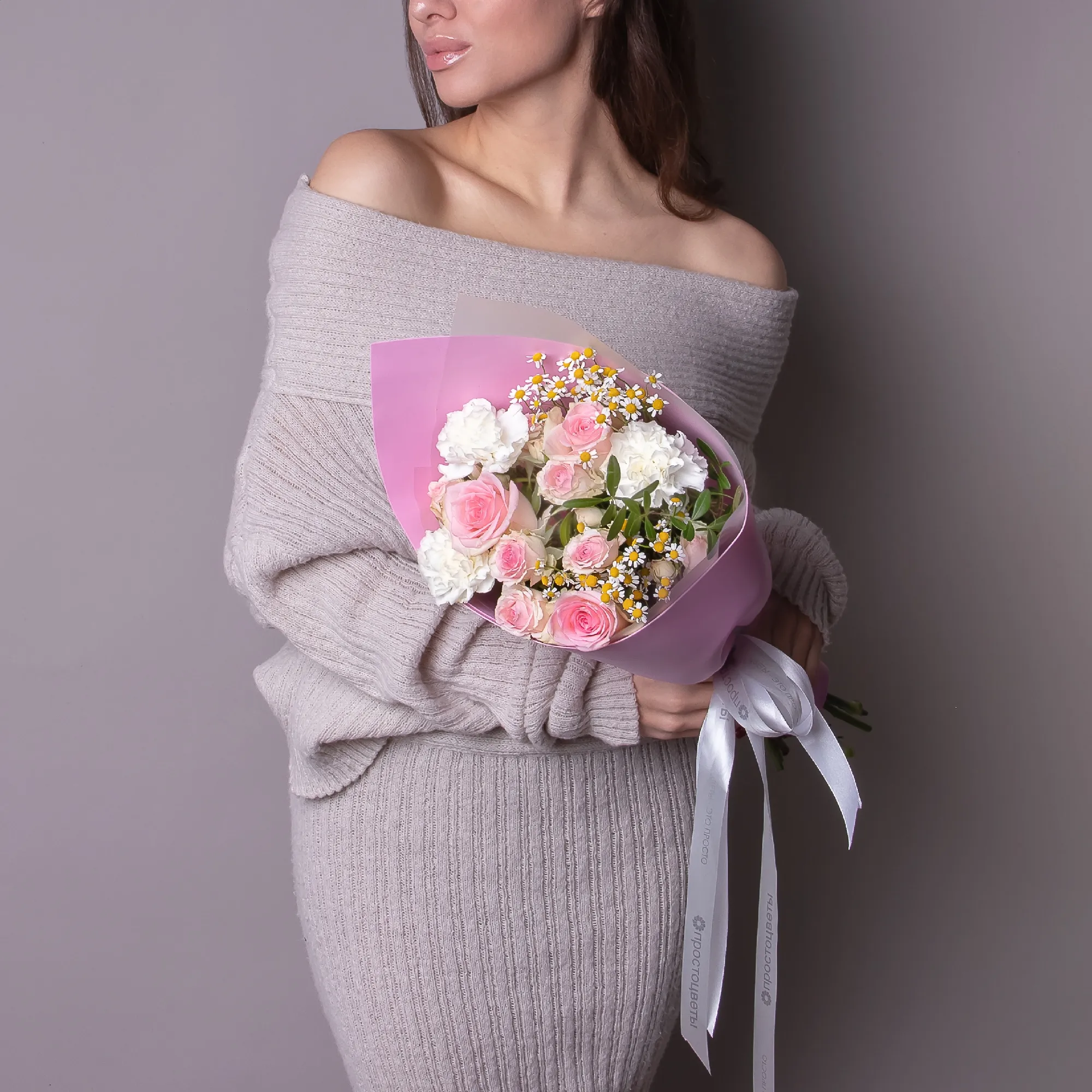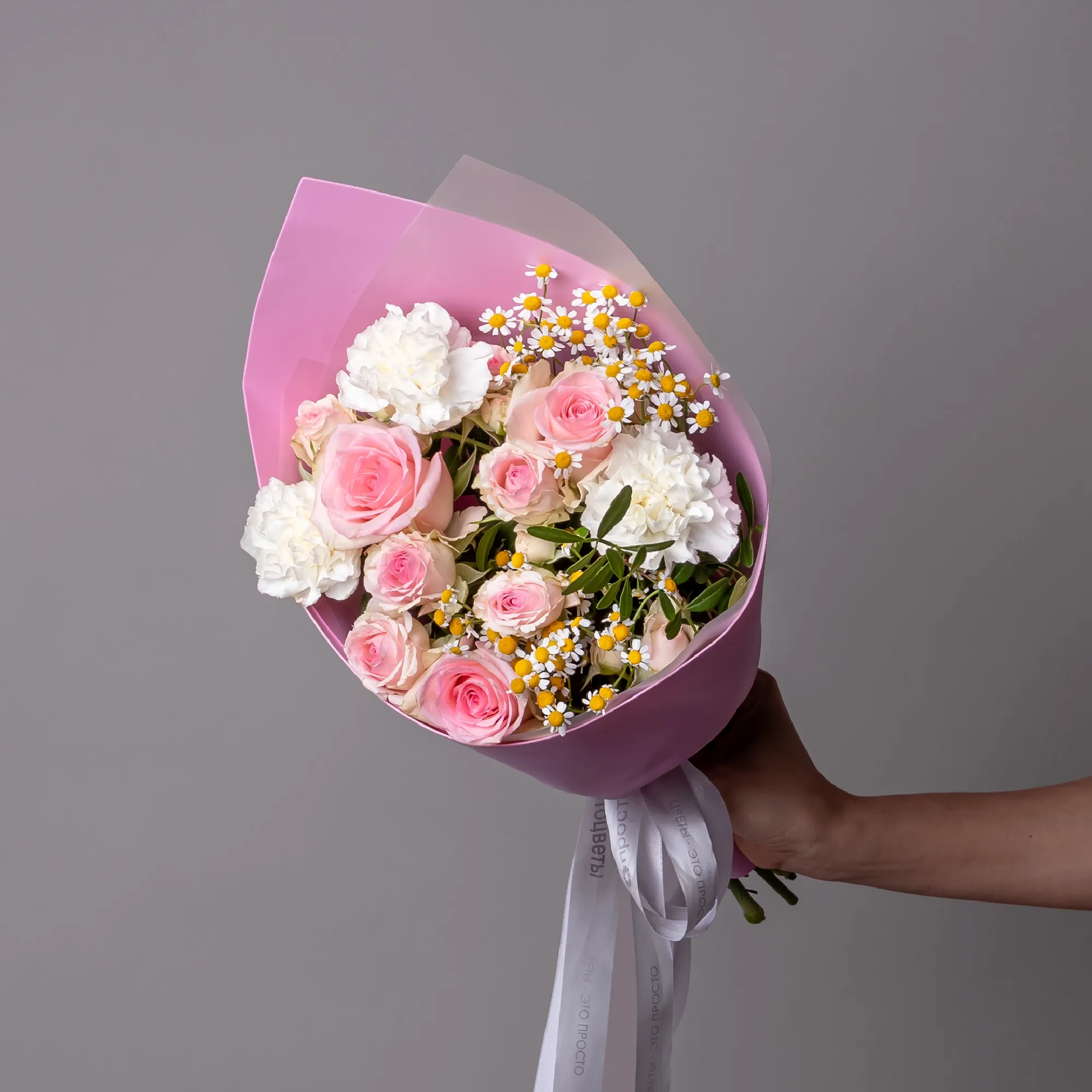 В составе букета "Шарлотта" в размере S кустовая роза "Динара", белая гвоздика, розовая роза сорта "Фламинго" и белая матрикария. Идеально подойдет для романтической прогулки или первого свидания, расскажет о нежных чувствах или только зарождающейся симпатии.