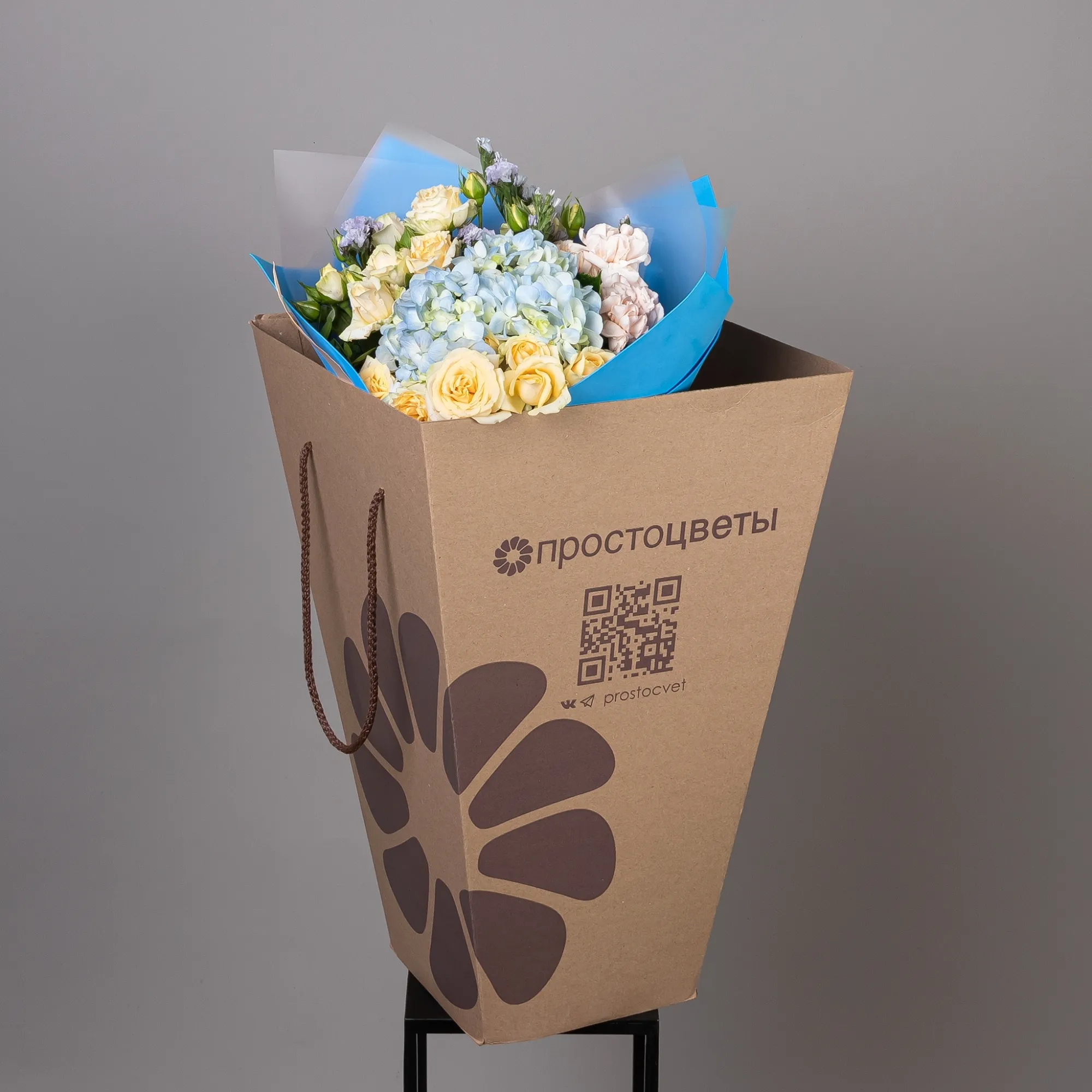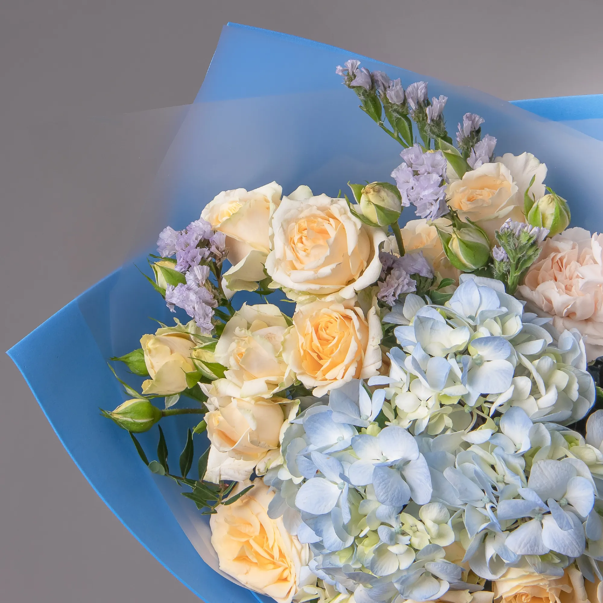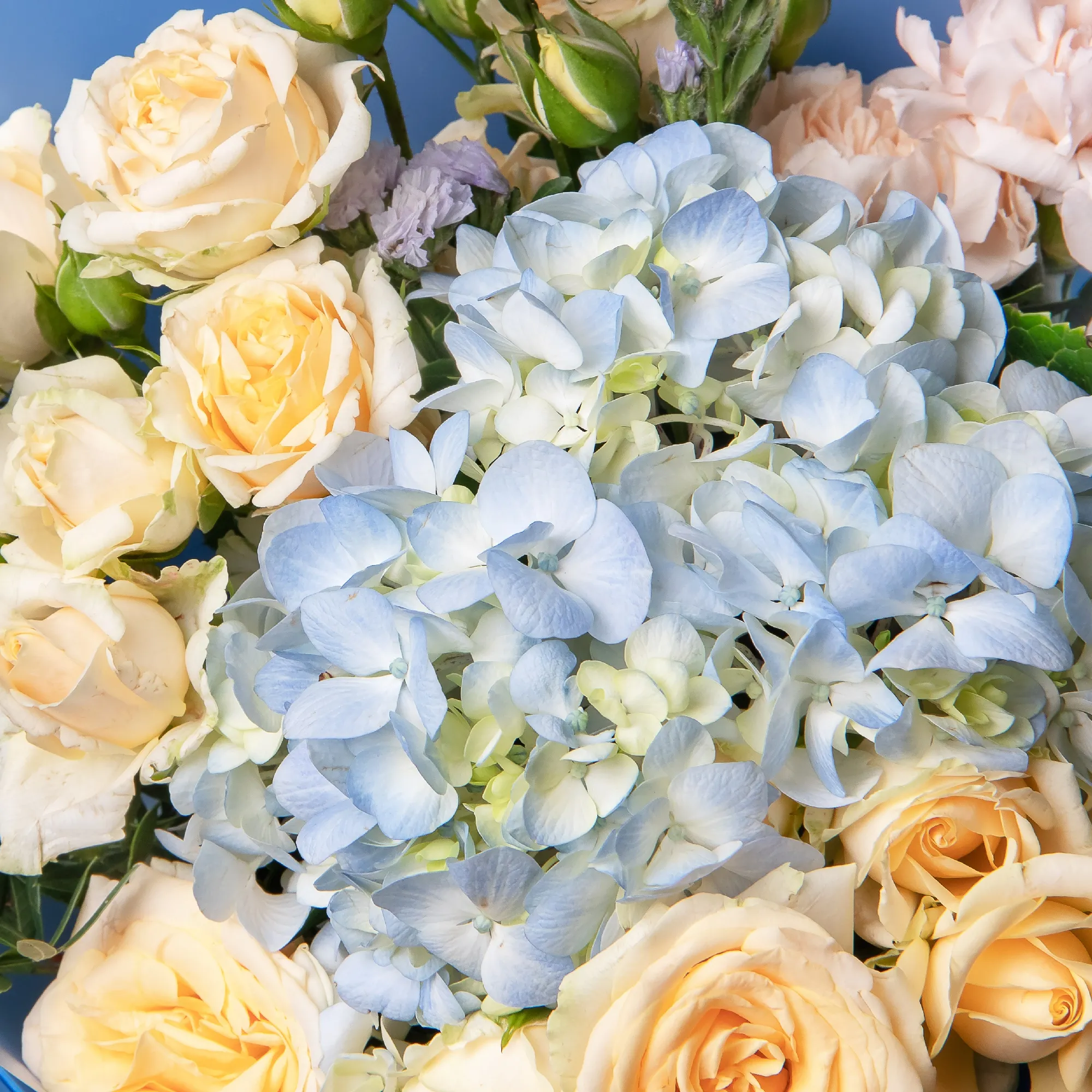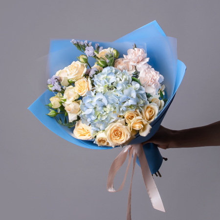 В составе букета "Синяя гармония S" кустовая роза "Солинеро", сиреневая статица, голубая гидрангия, персиковая гвоздика, дополнен листьями фисташки. Этот букет идеально подойдёт для следующих случаев: *Поздравление с годовщиной отношений - нежные голубые и сиреневые оттенки символизируют верность и постоянство, а персиковые акценты добавляют теплоты и интимности. Такой букет станет идеальным способом выразить глубокие чувства и подчеркнуть значимость отношений между партнерами. *Подарок для творческой личности - необычная цветовая гамма и сочетание разных текстур цветов (кустовая роза, гидрангия, гвоздика) создают оригинальное решение, которое обязательно оценит человек с художественным вкусом, этот букет подчеркнет индивидуальность получателя и станет источником вдохновения. Закажите букет с доставкой или заберите самовывозом. И помните, что цветы - это просто.