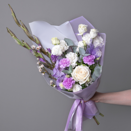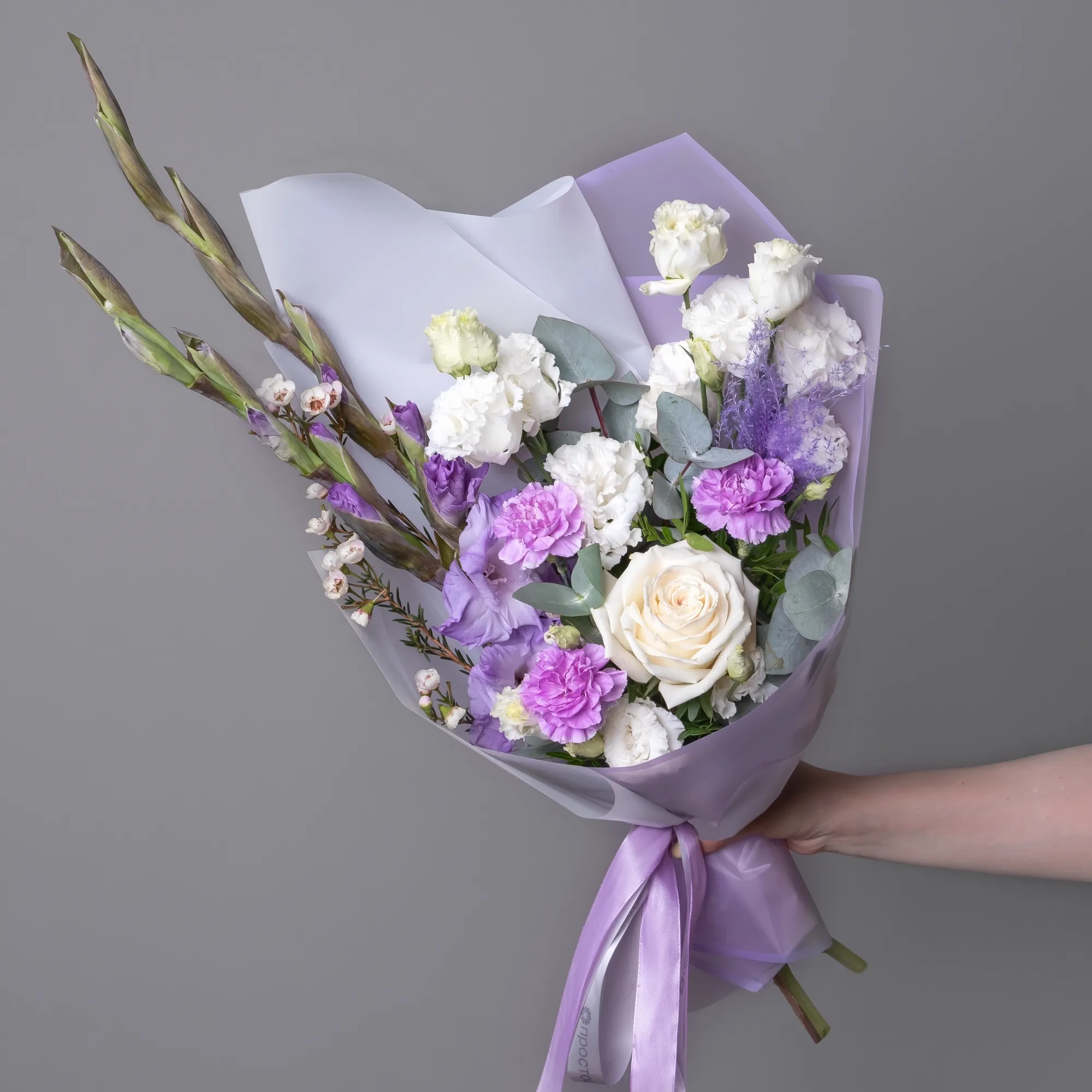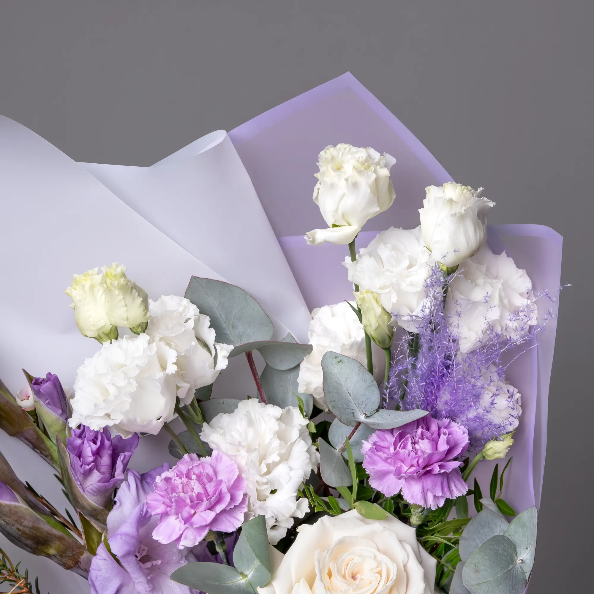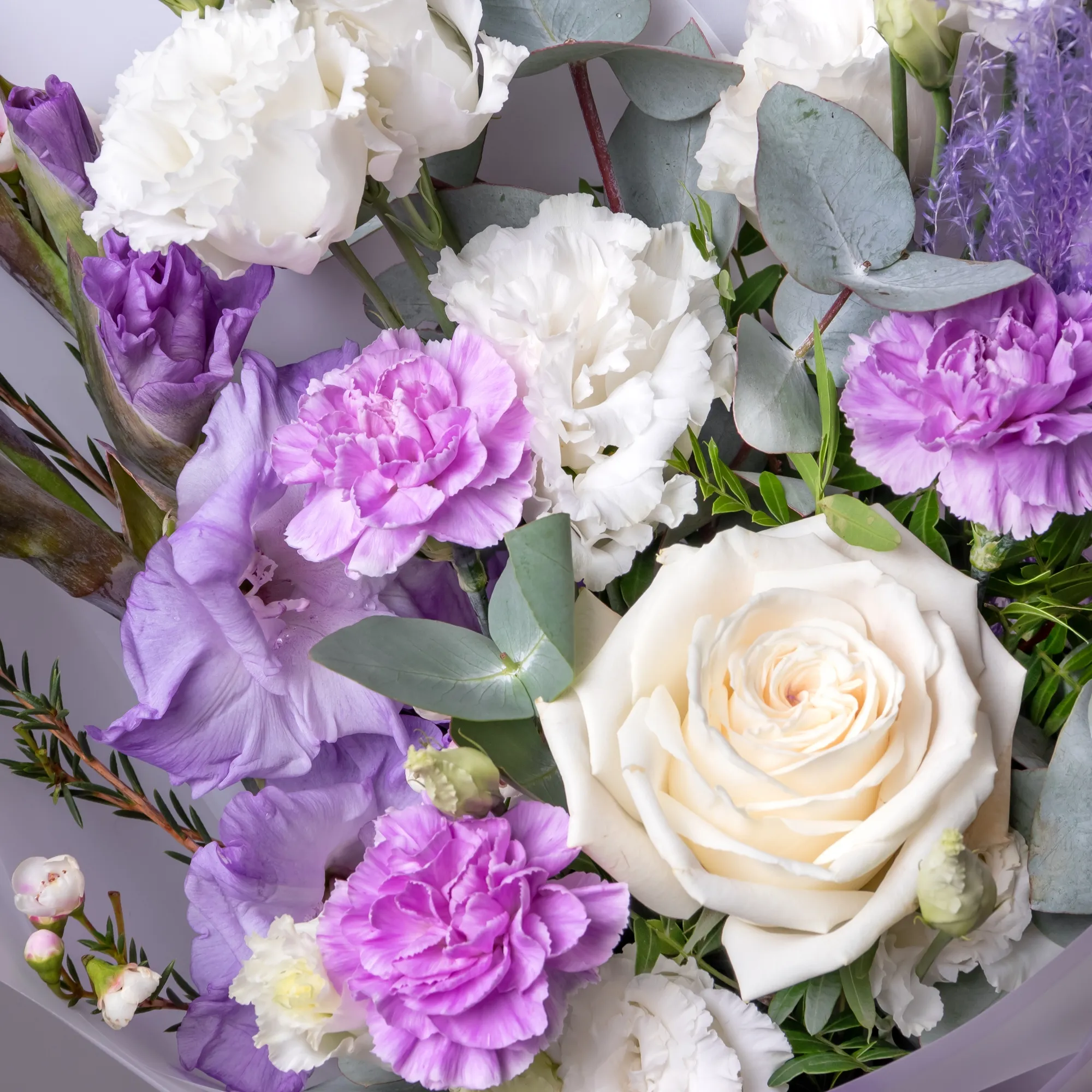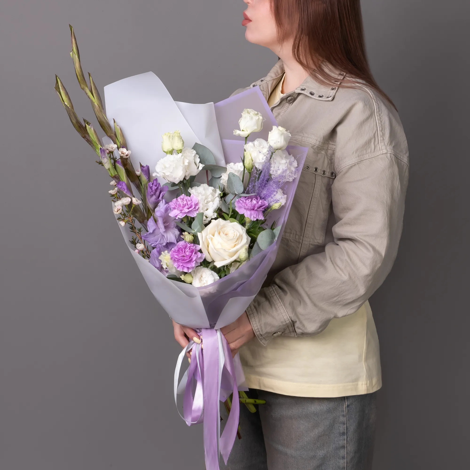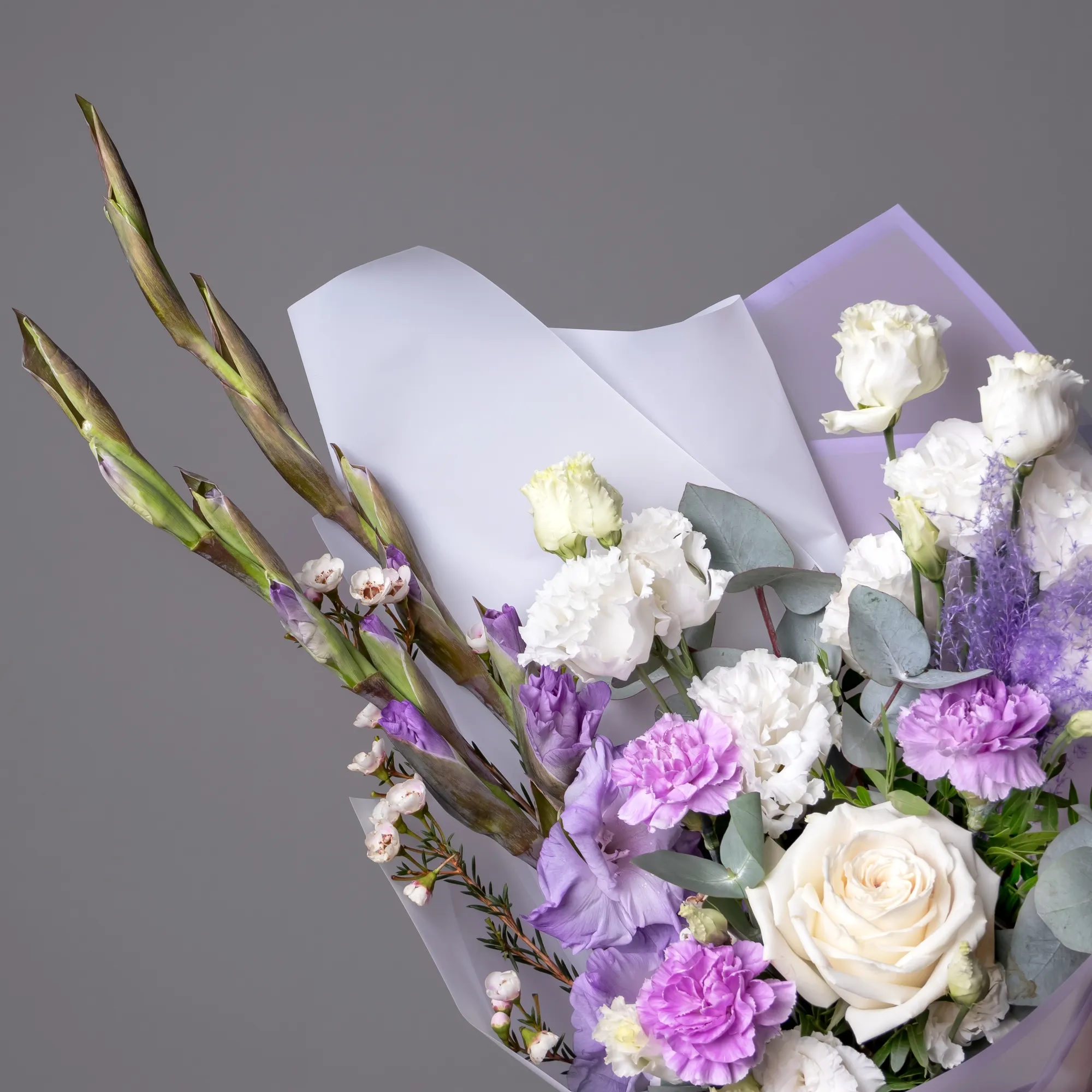 Гладиолус-2, Гвоздика-3, Роза-1, Эустома-2, Листья эвкалипта-3