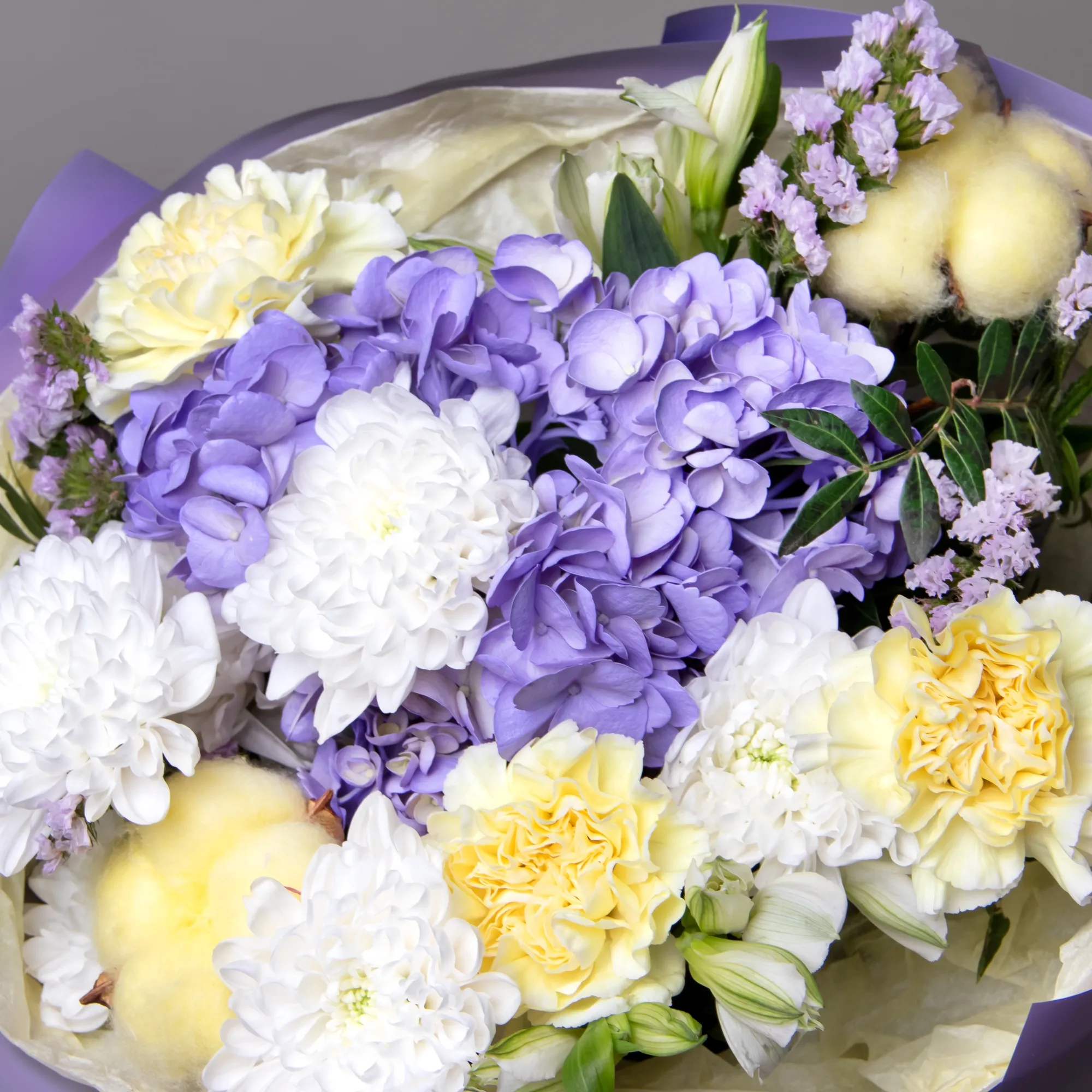 Гвоздика-3, Гортензия-1, Альстромерия-2, Хризантема кустовая-1, Хлопок-2, Листья фисташки-2