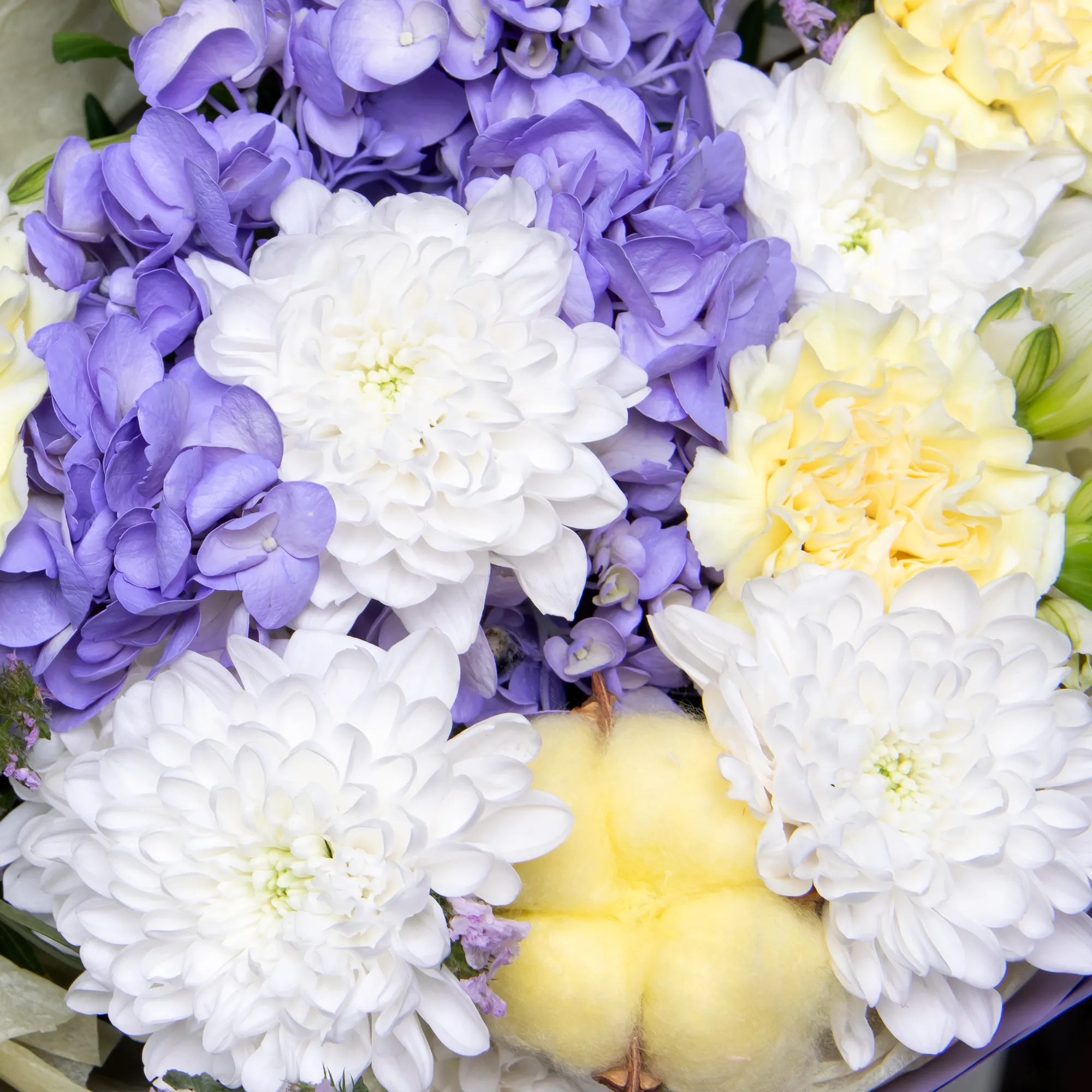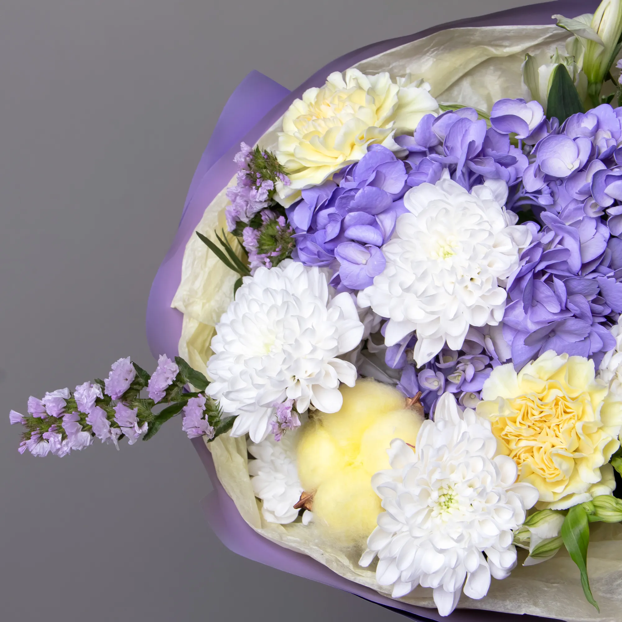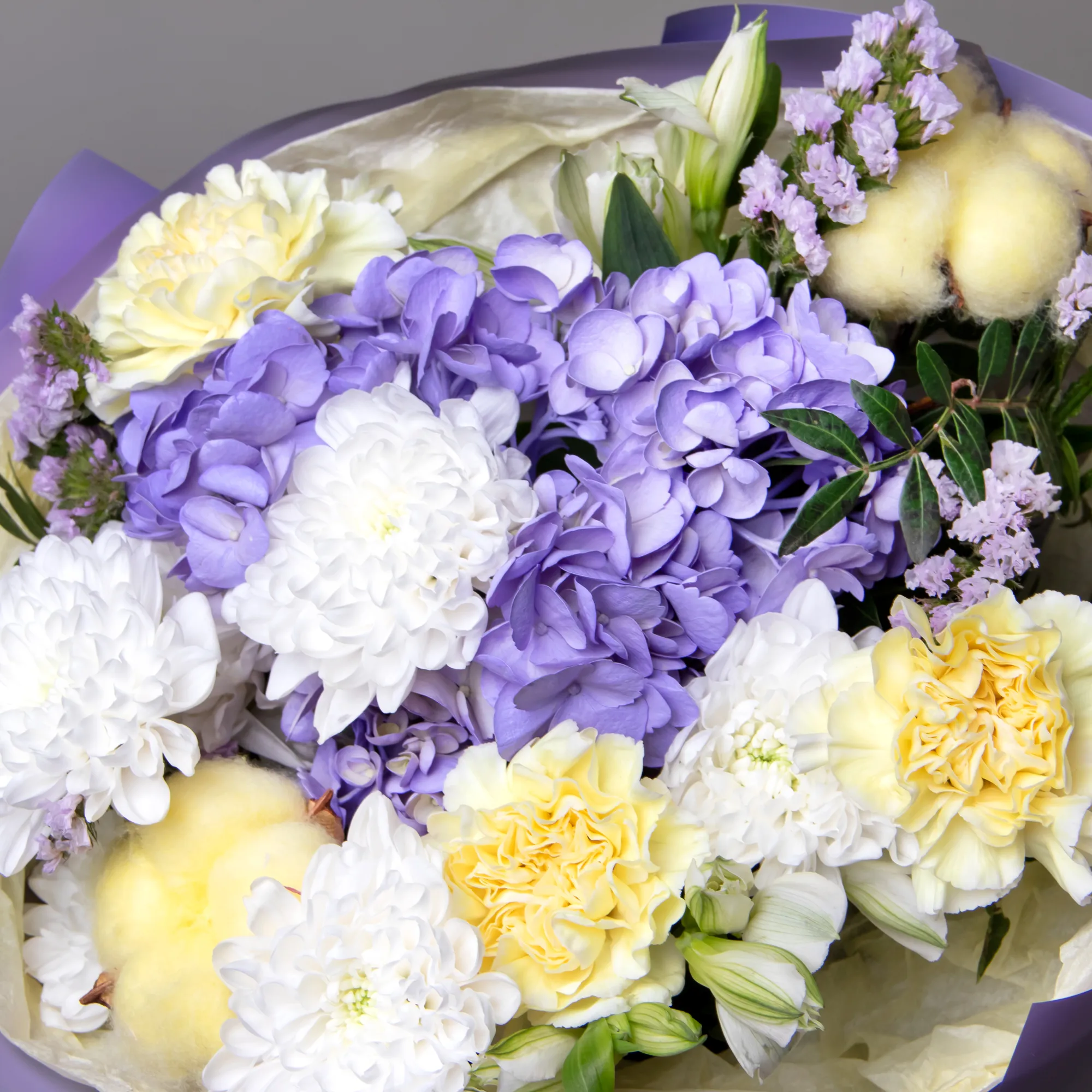 Гвоздика, Гортензия, Хризантема, Альстромерия, Листья фисташки