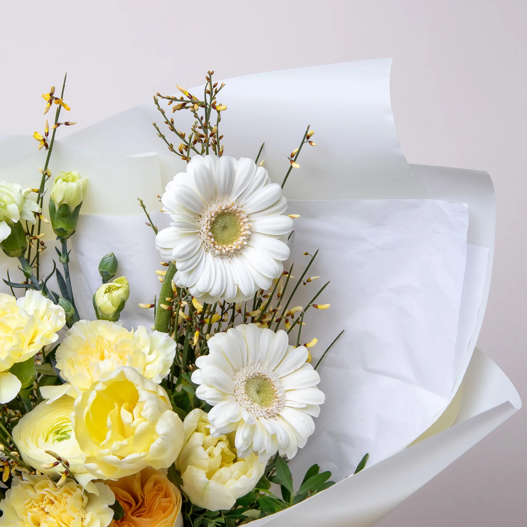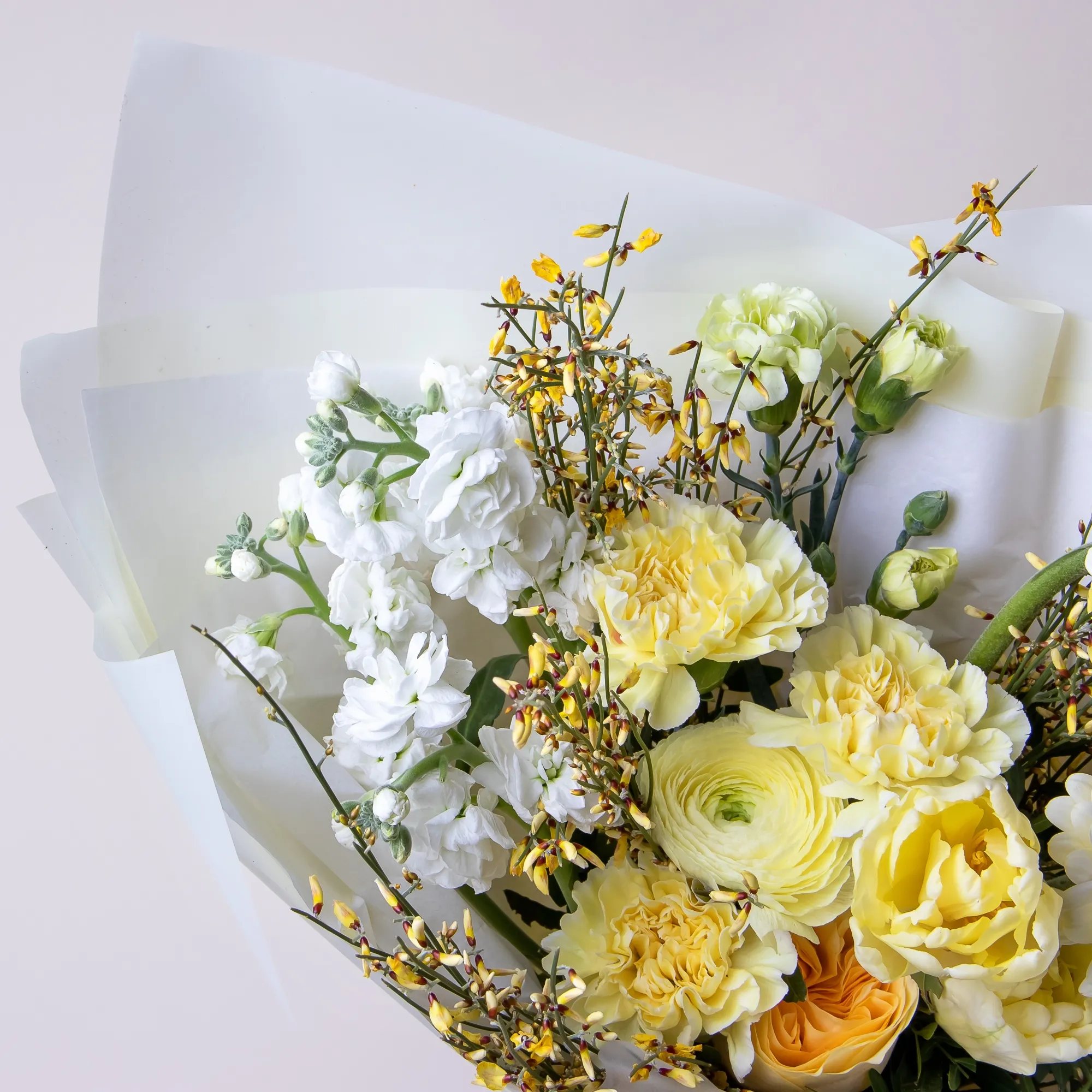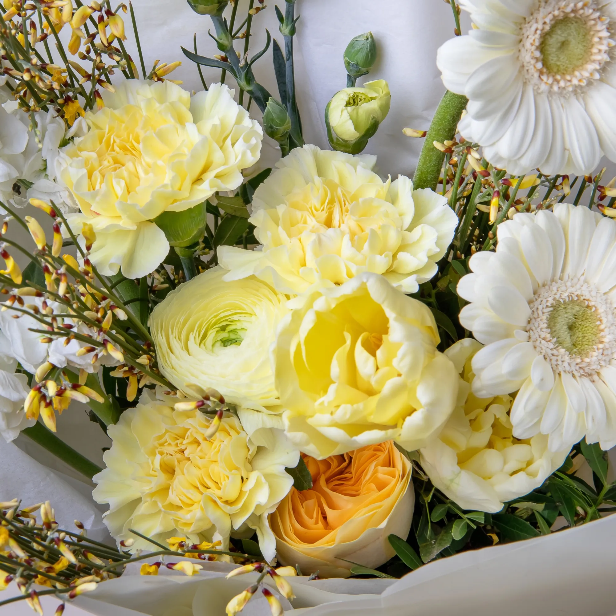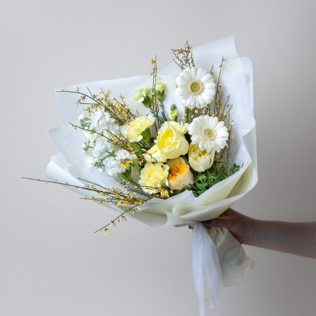 Гвоздика-3, Тюльпан-2, Маттиола-1, Гермини-2, Ранункулюс-1, Гвоздика кустовая-1, Гениста-2, Роза пионовидная-1, Листья фисташки-3