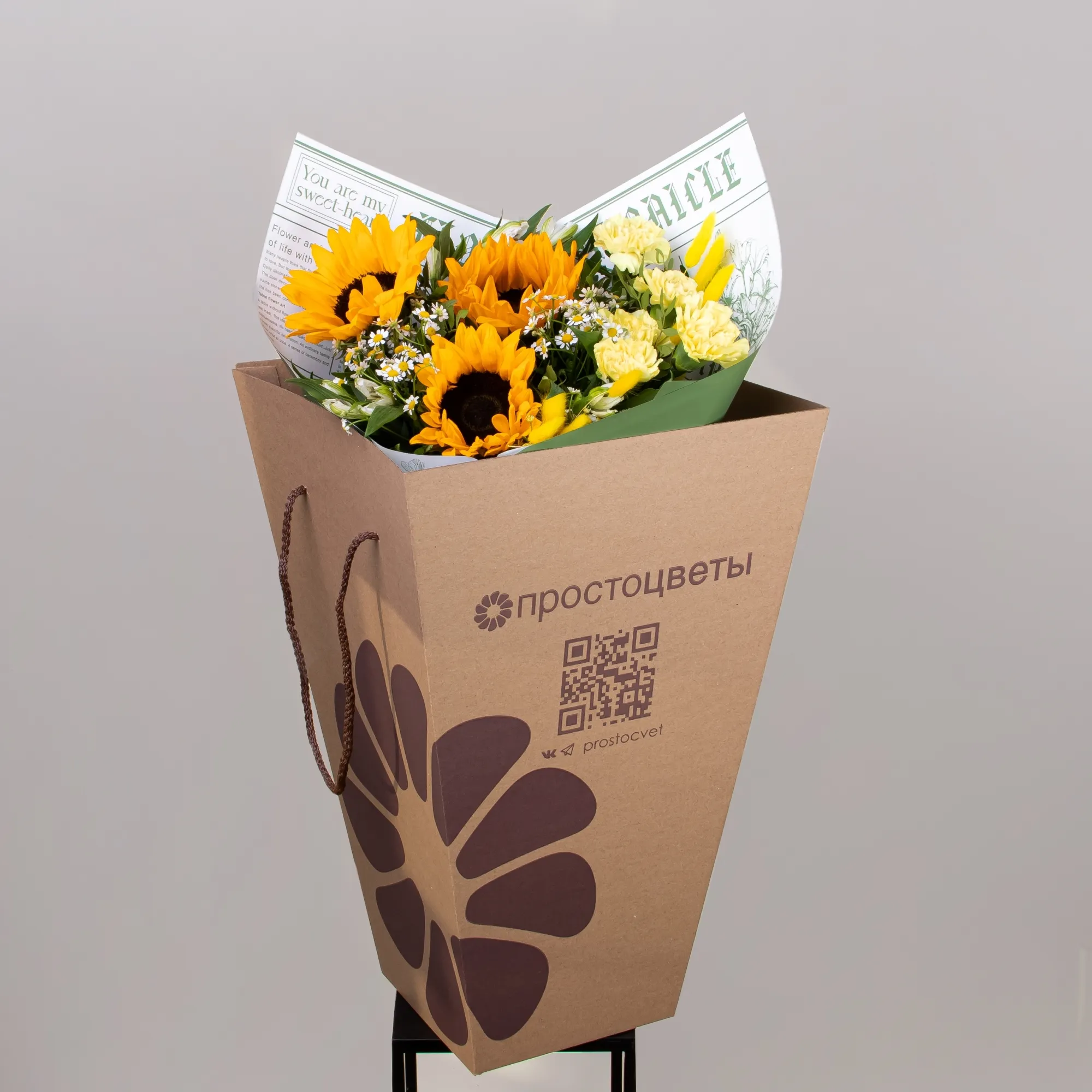 В составе букета "Солнышко в руках M" белая альстромерия, оранжевый гелиантус, белая матрекария, жёлтая гвоздика, дополнен листьями фисташки и сухоцветом лагурус. Этот букет идеально подойдёт для следующих случаев: *День рождения лучшей подруги - яркие солнечные оттенки и белая альстромерия символизируют дружеские чувства и искренность, а композиция без сильного аромата подойдет даже аллергикам. *Поздравление с повышением - теплые оранжевые и желтые тона символизируют успех и процветание, а композиция в целом создает радостное, праздничное настроение. Закажите букет с доставкой или заберите самовывозом. И помните, что цветы - это просто.