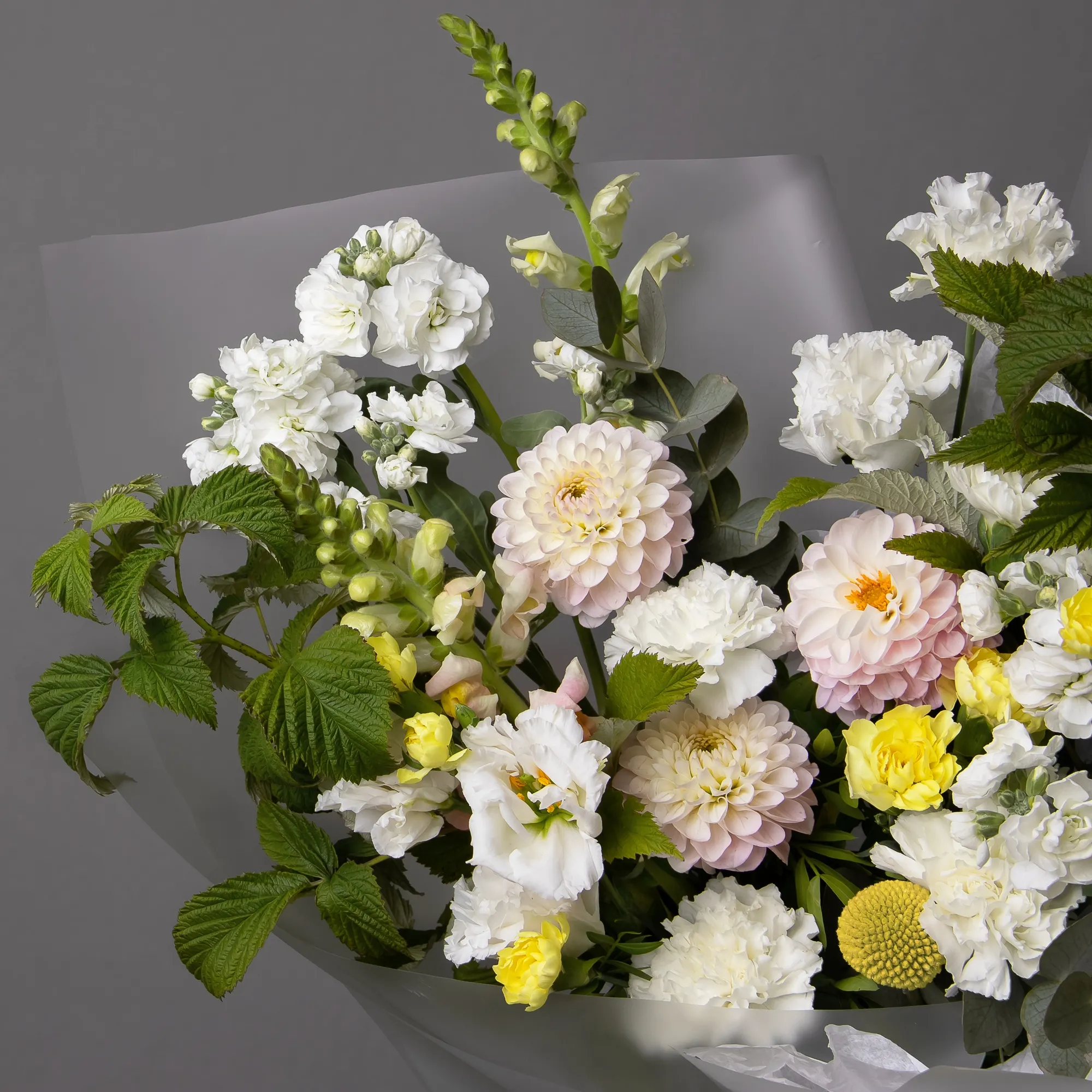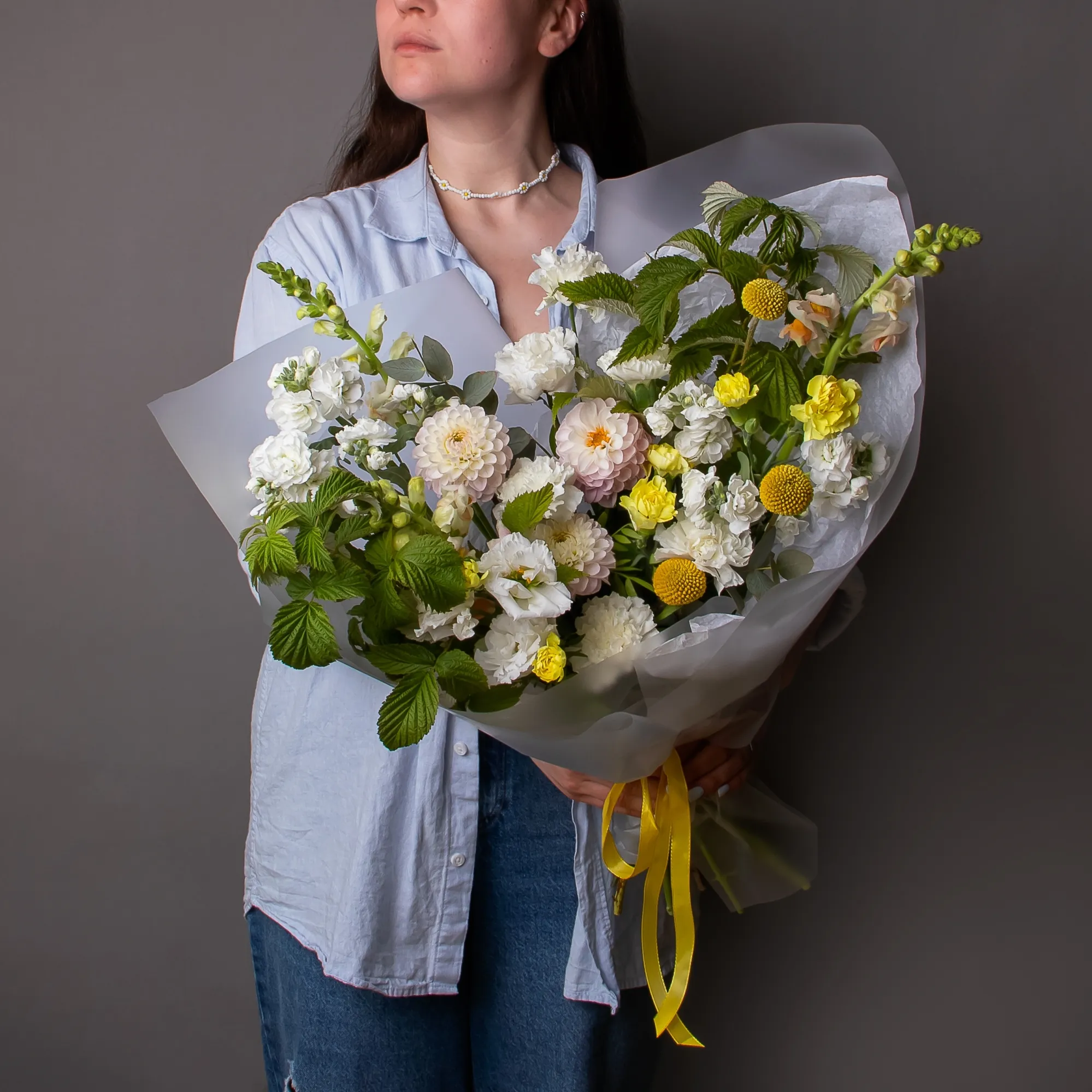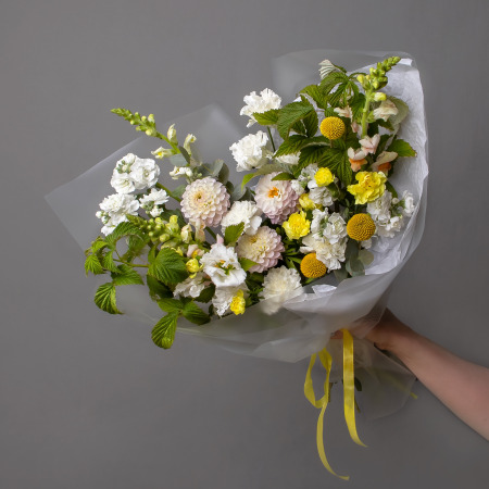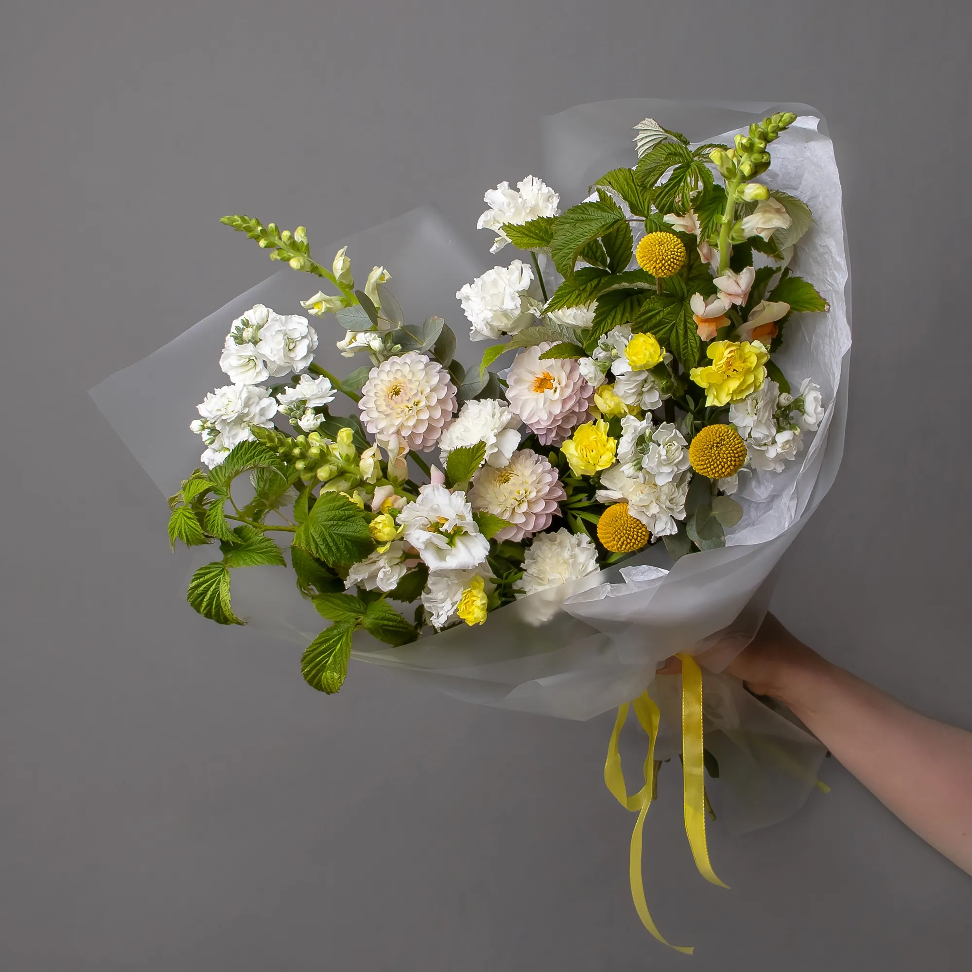 Флористический букет "Свежесть утра" из георгин Визард с малиной - это яркое и стильное сочетание цветов. Белые с розовыми лепестками георгины сорта "Визард" создают яркий акцент в букете, а малина добавляет свежести и сочности.