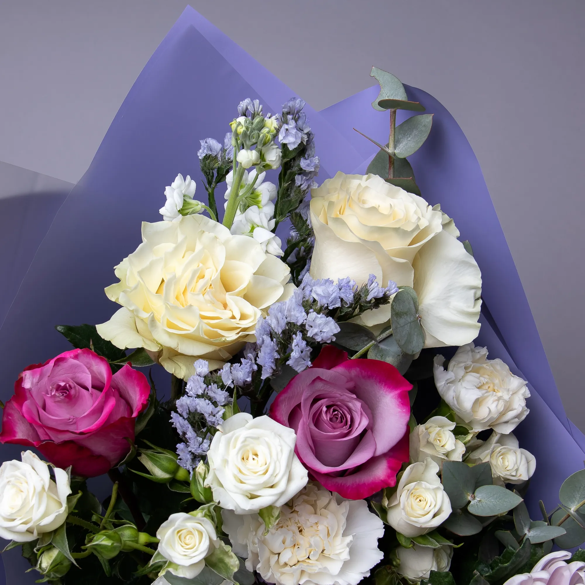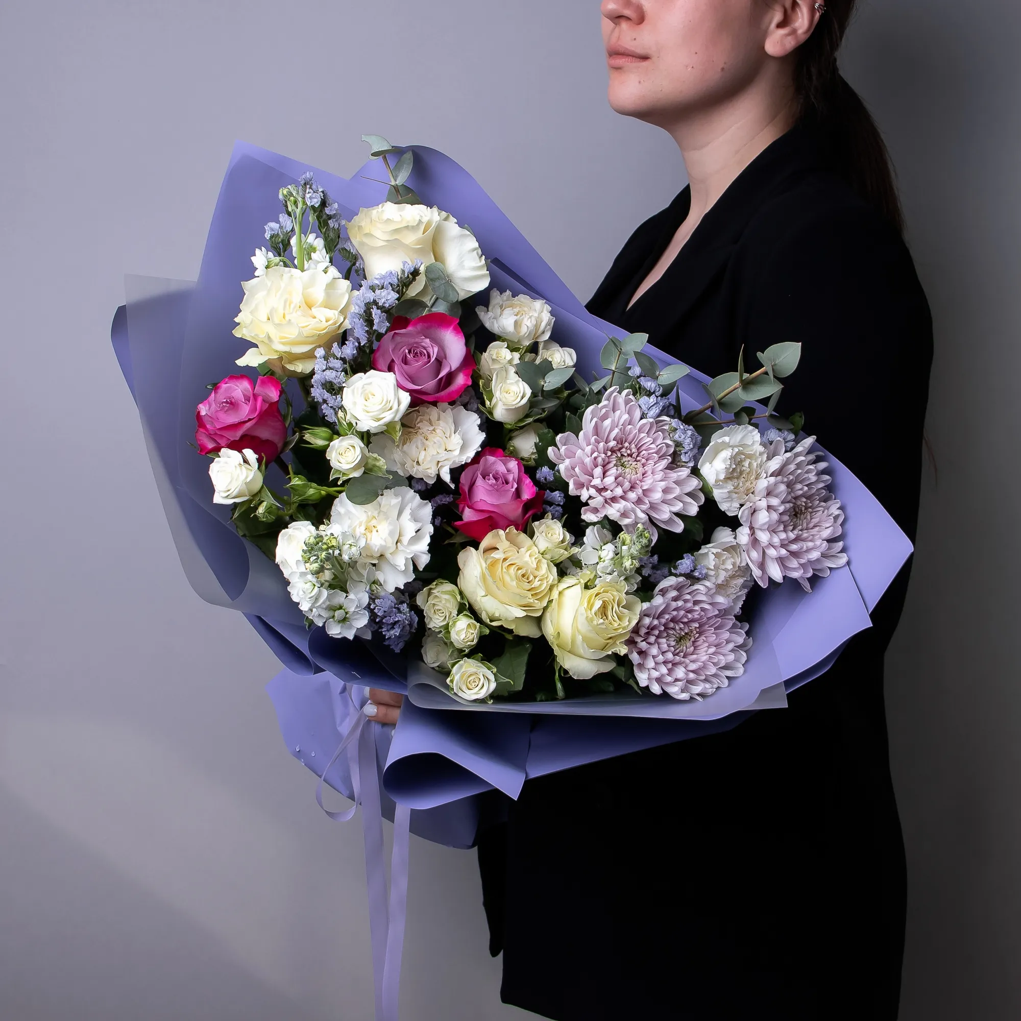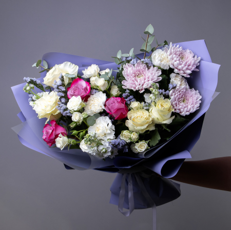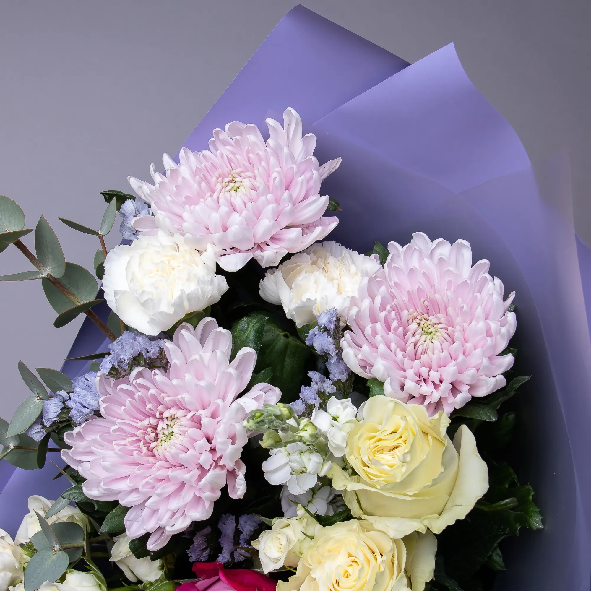 Гвоздика, Роза, Хризантема, Маттиола, Эустома, Листья фисташки, Листья эвкалипта
