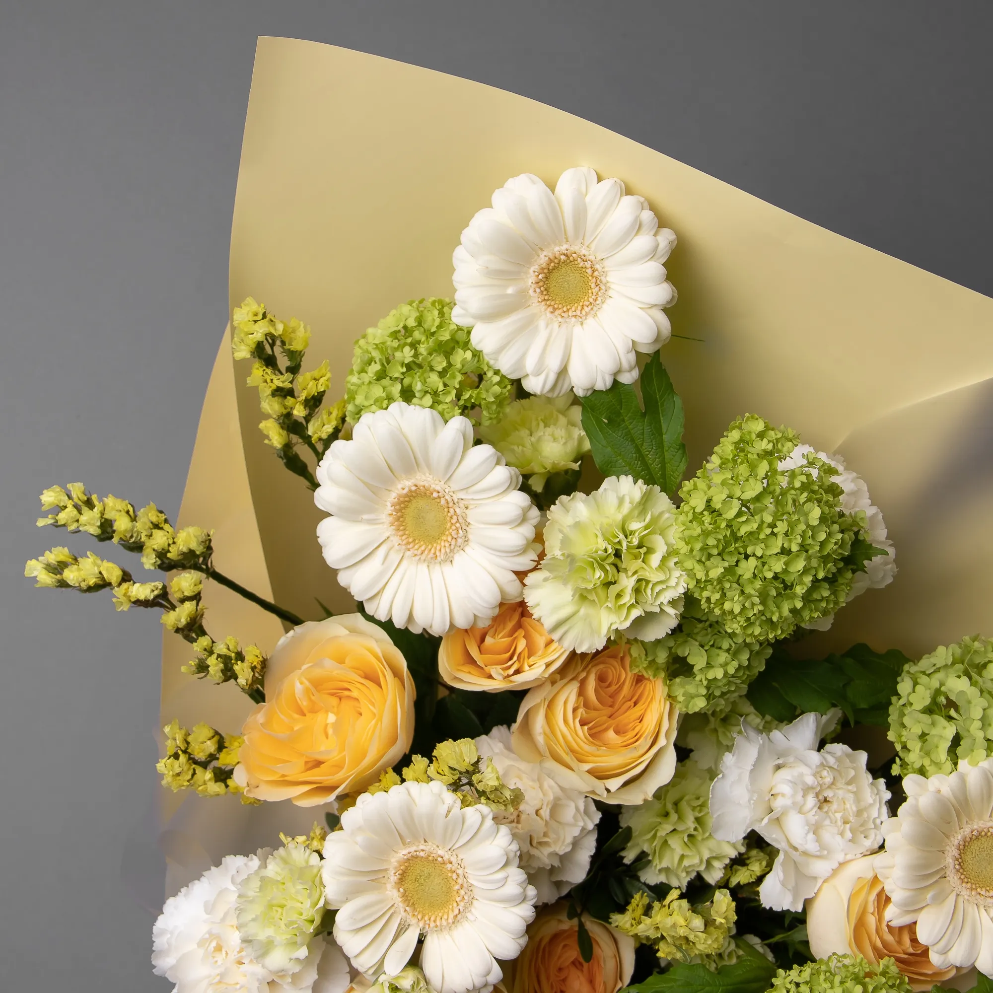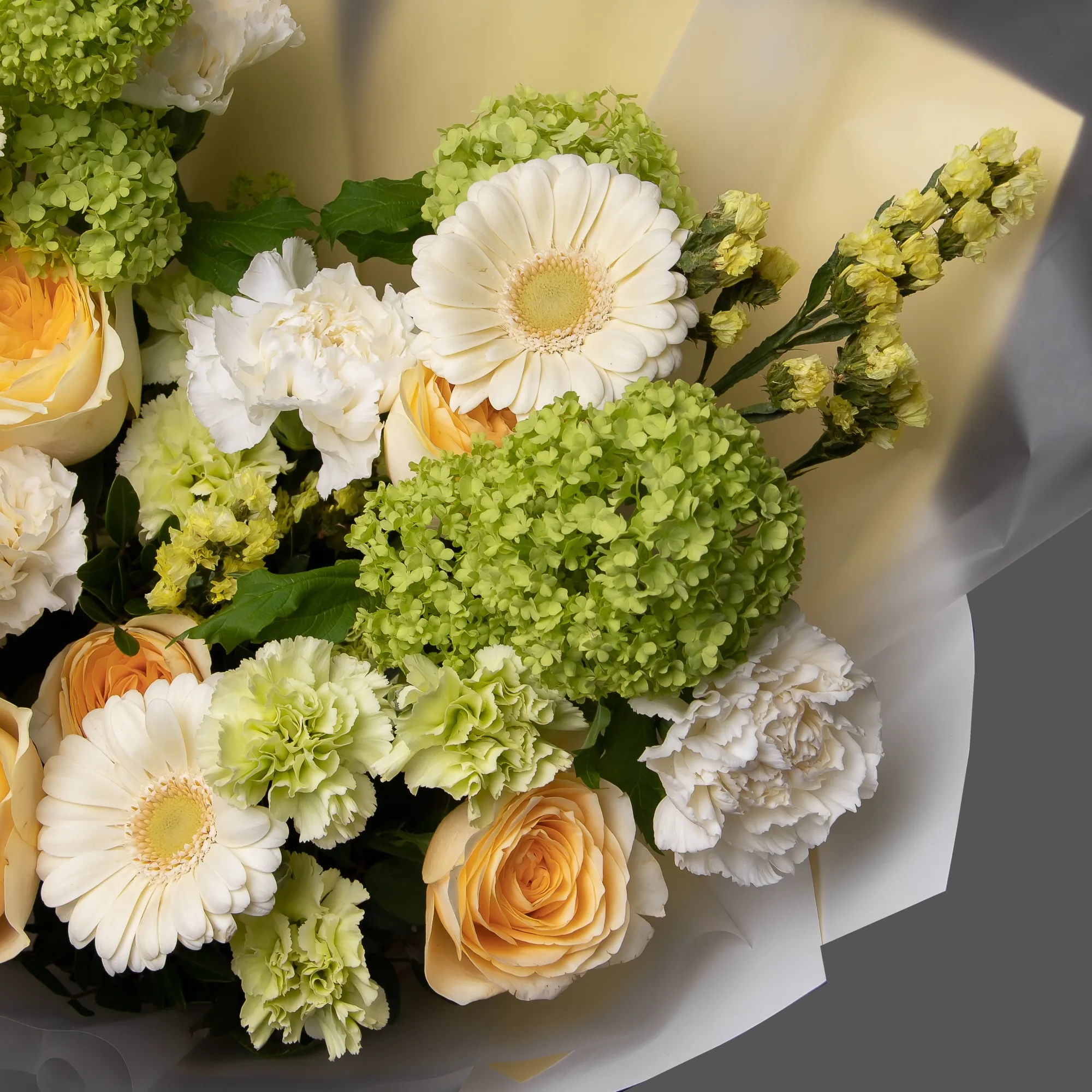 Гвоздика-5, Гермини-5, Гвоздика кустовая-4, Роза пионовидная-7, Статица-4, Листья фисташки-7, Вибурнум-3