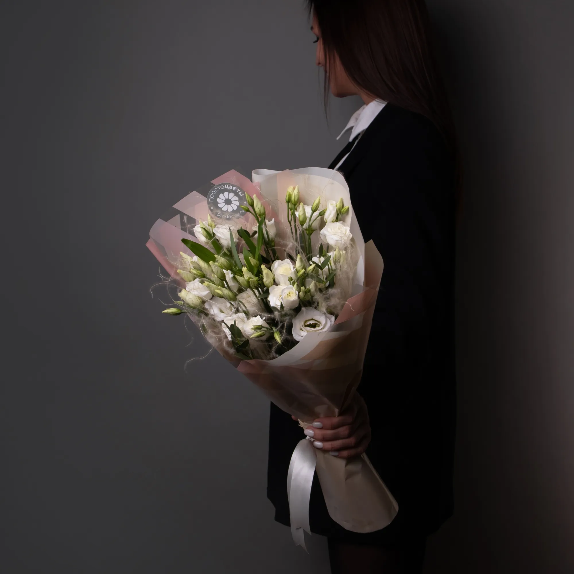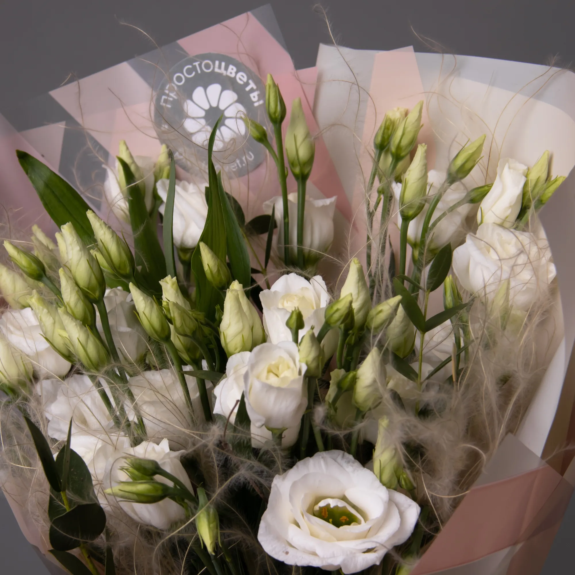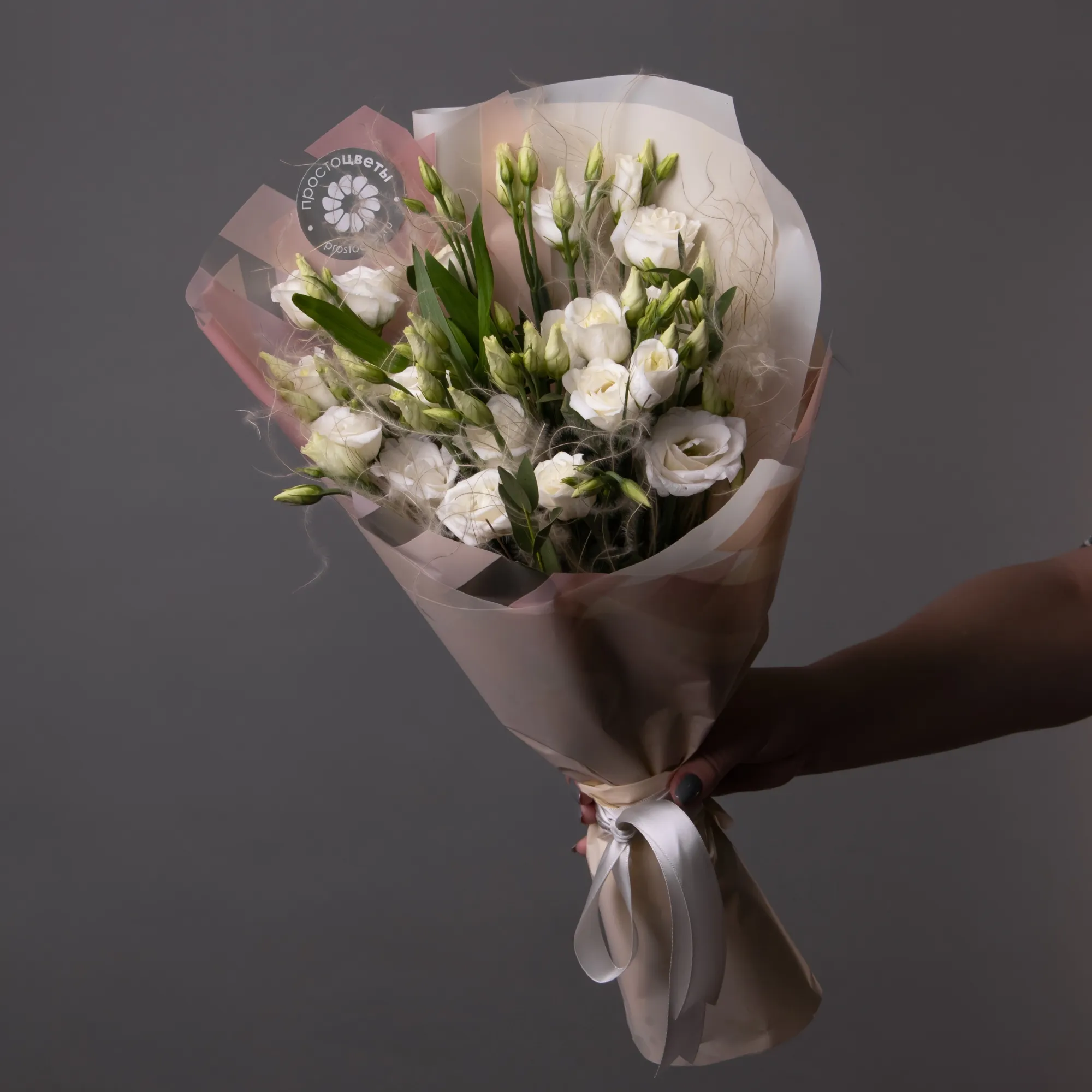 Букет, в котором живут легкость и невесомость. Белый лизиантус в сочетании со стифой образуют воздушную композицию, которая красиво колышется на ветру и является олицетворением знойного летнего полдня где-то в деревне у любимой бабушки.