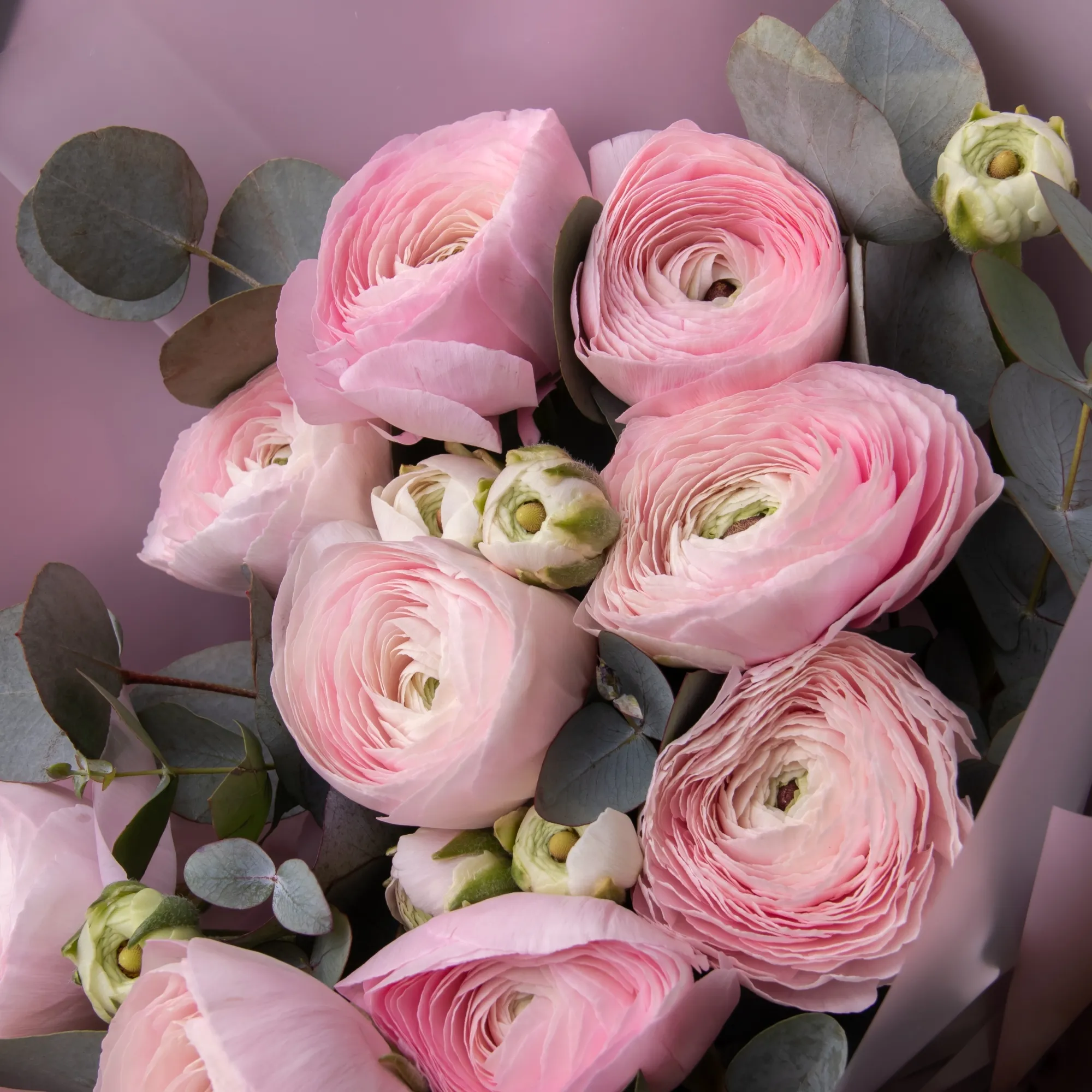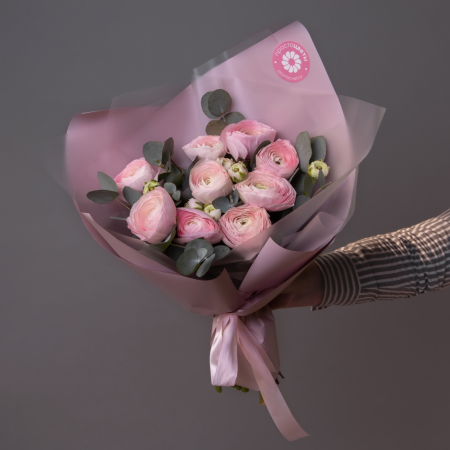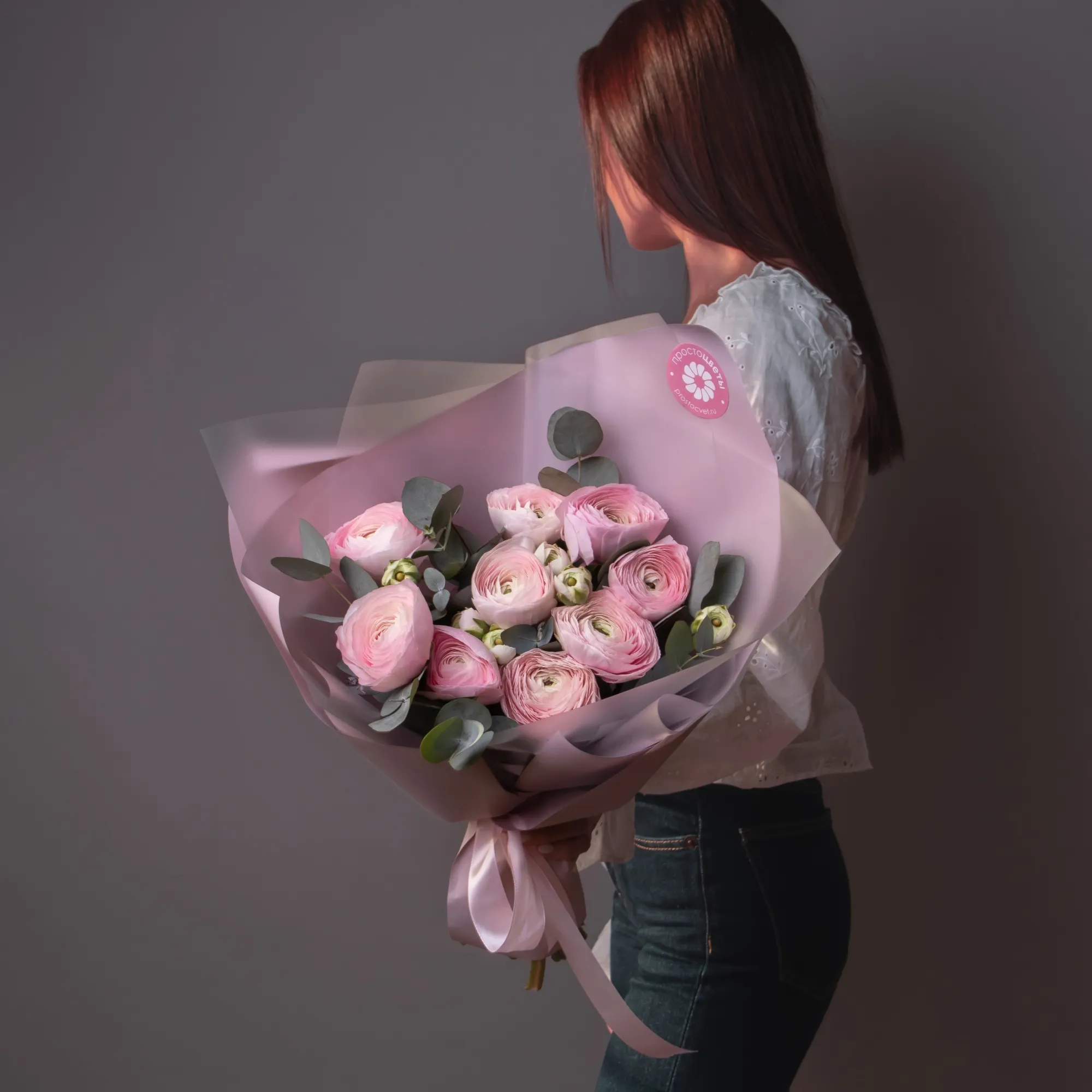 Когда под одной шелковой лентой соединяется очаровательный, нежный ранункулус с воздушными ветками эвкалипта - получается "Тот Самый" букет, который отлично подойдет для вечерних встреч и искренних поздравлений.