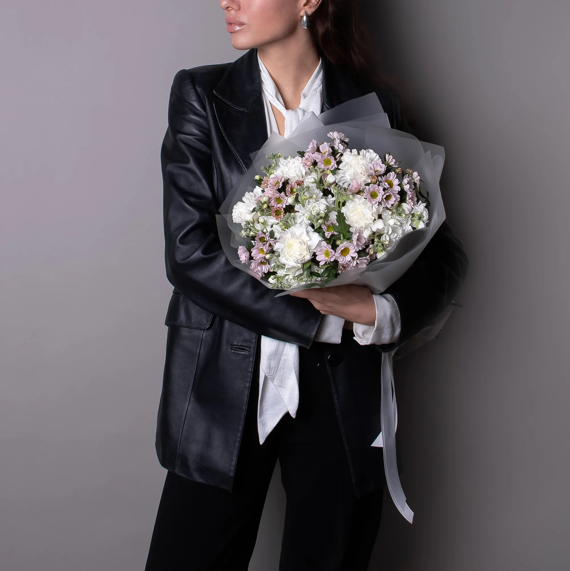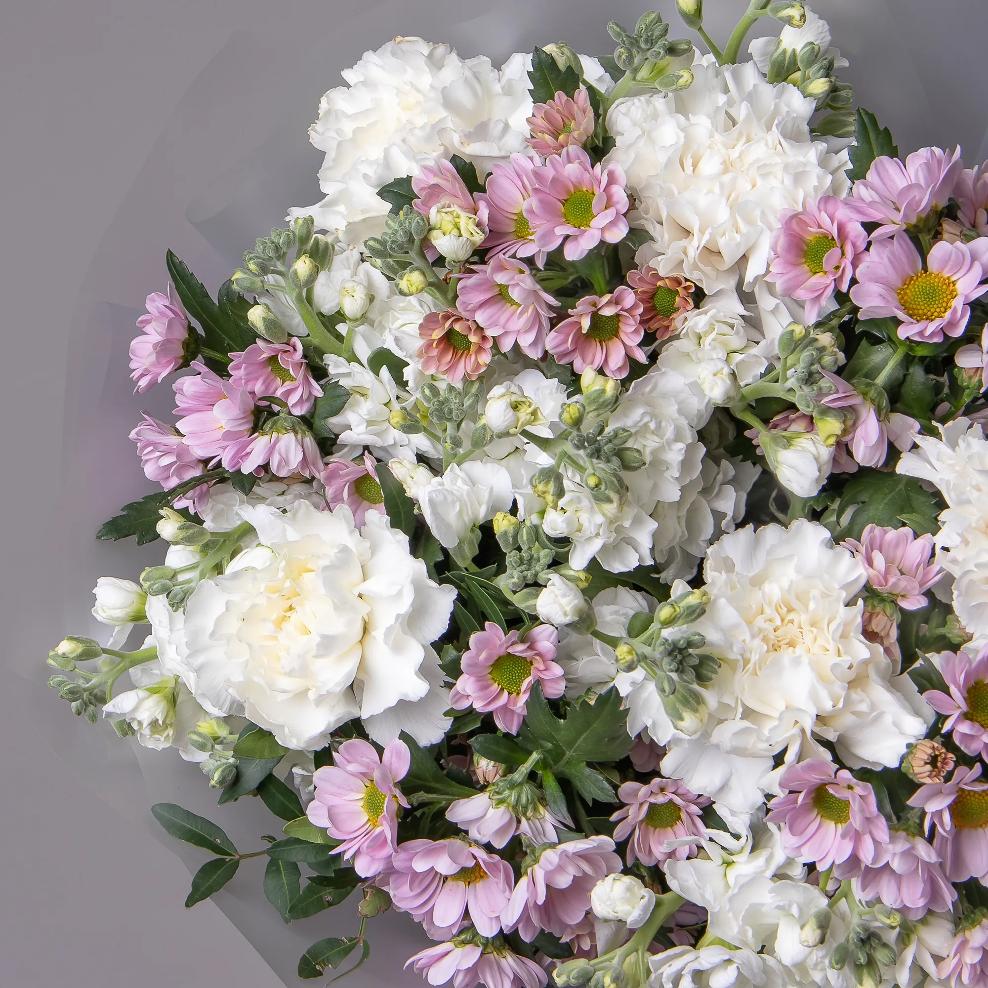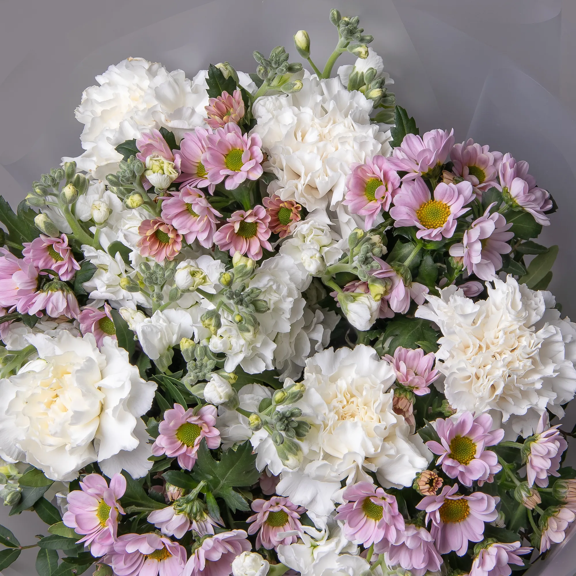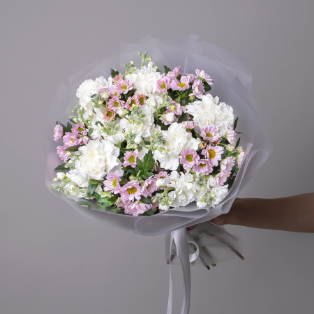 Триобукет из белых гвоздик, маттиолы и кустовой хризантемы