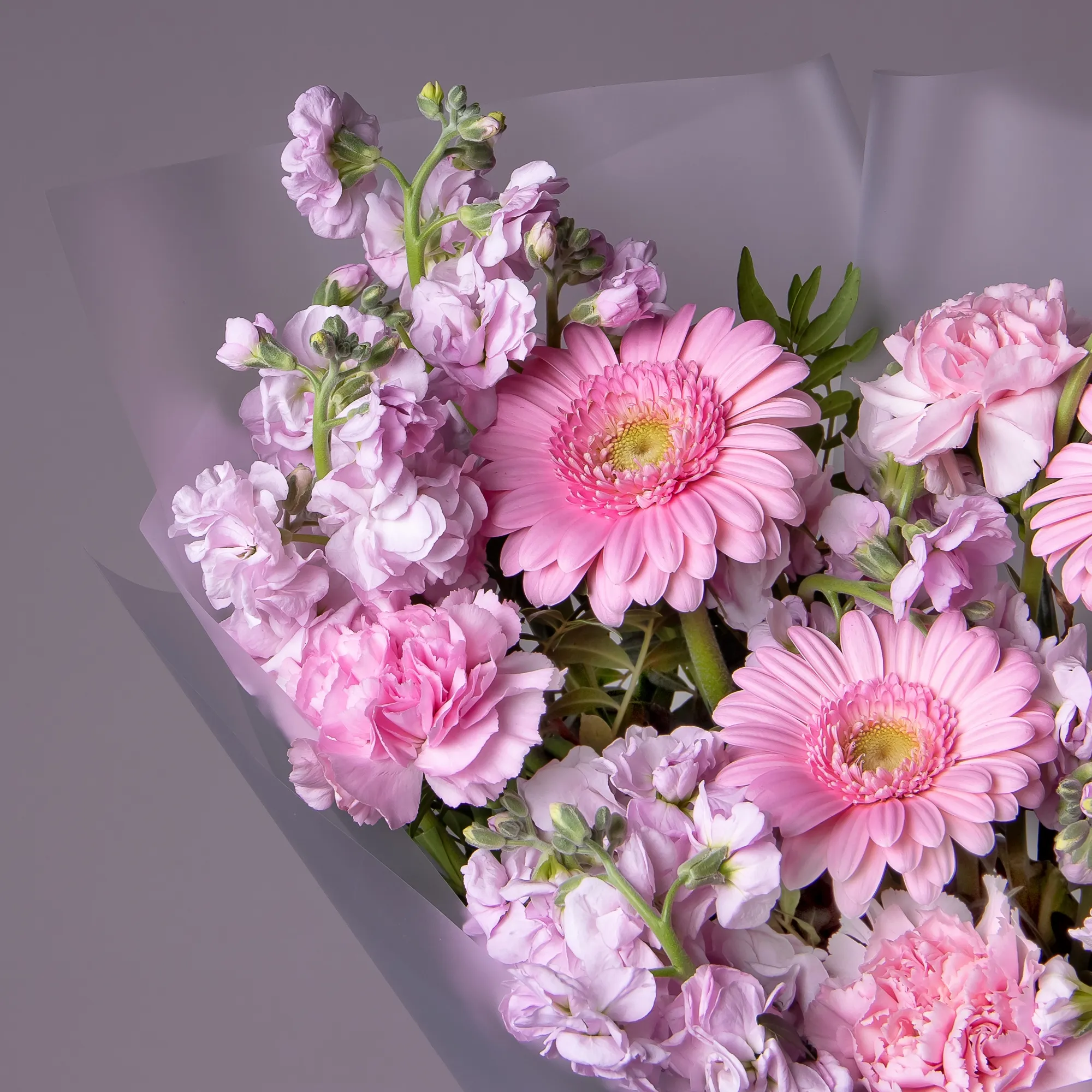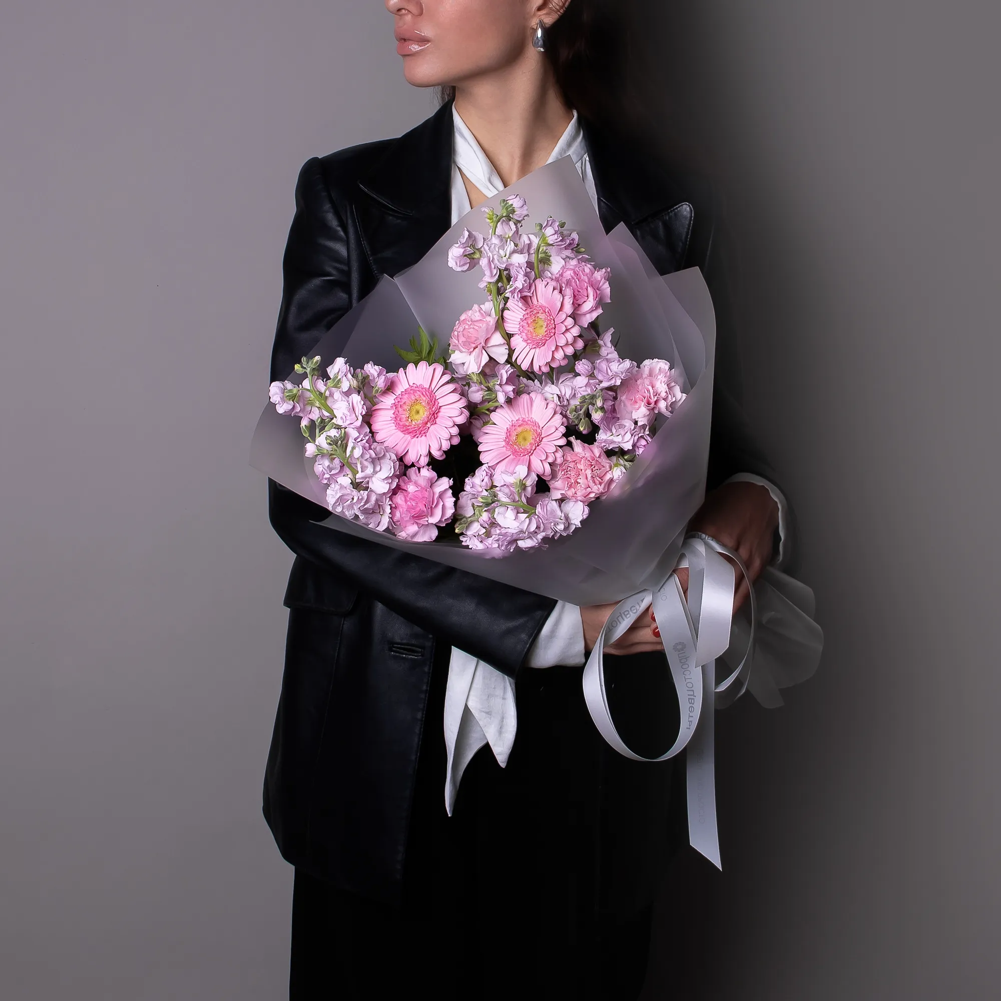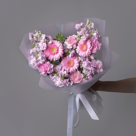 Триобукет из розовой герберы, маттиолы и гвоздики