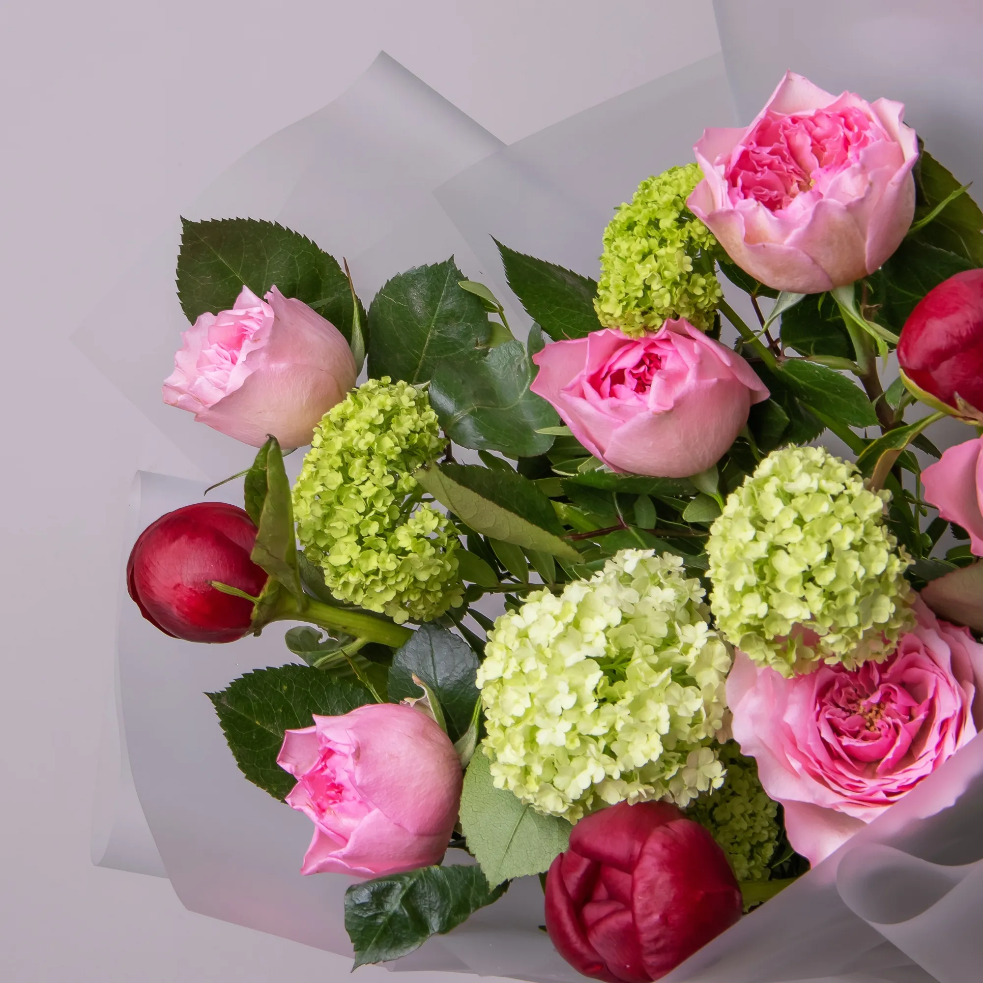 Триобукет из винных пионов, розы и калины
