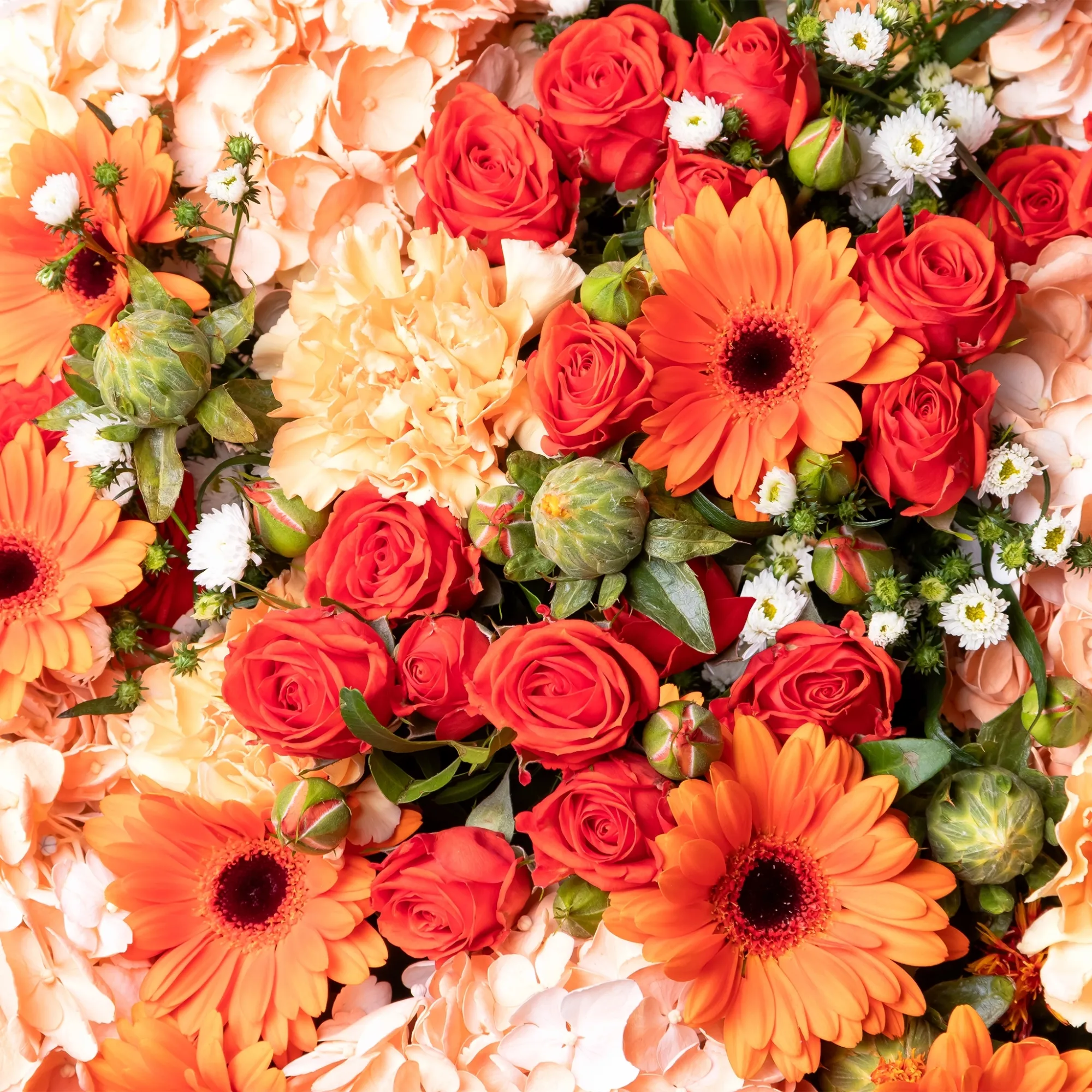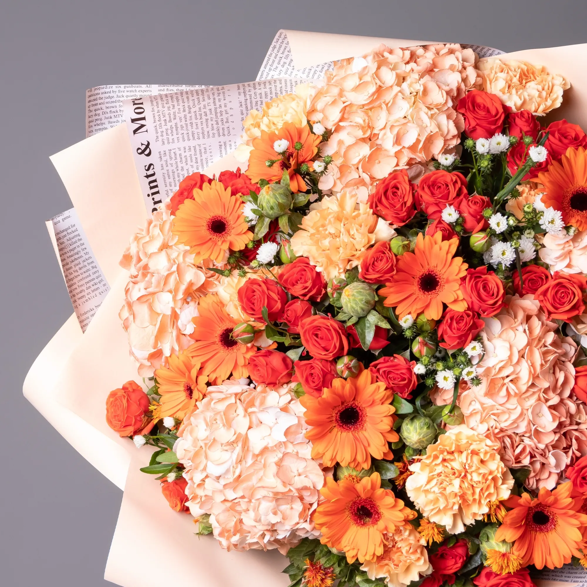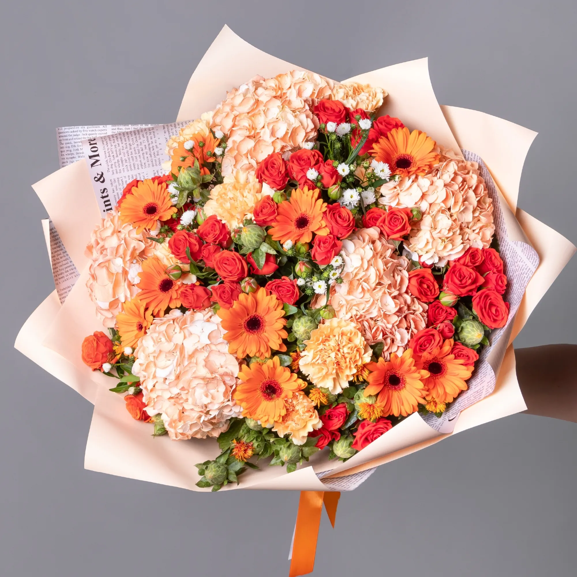 Гвоздика-7, Гортензия-5, Гермини-10, Роза кустовая-10, Астер-5, Картамус-5, Листья фисташки-10
