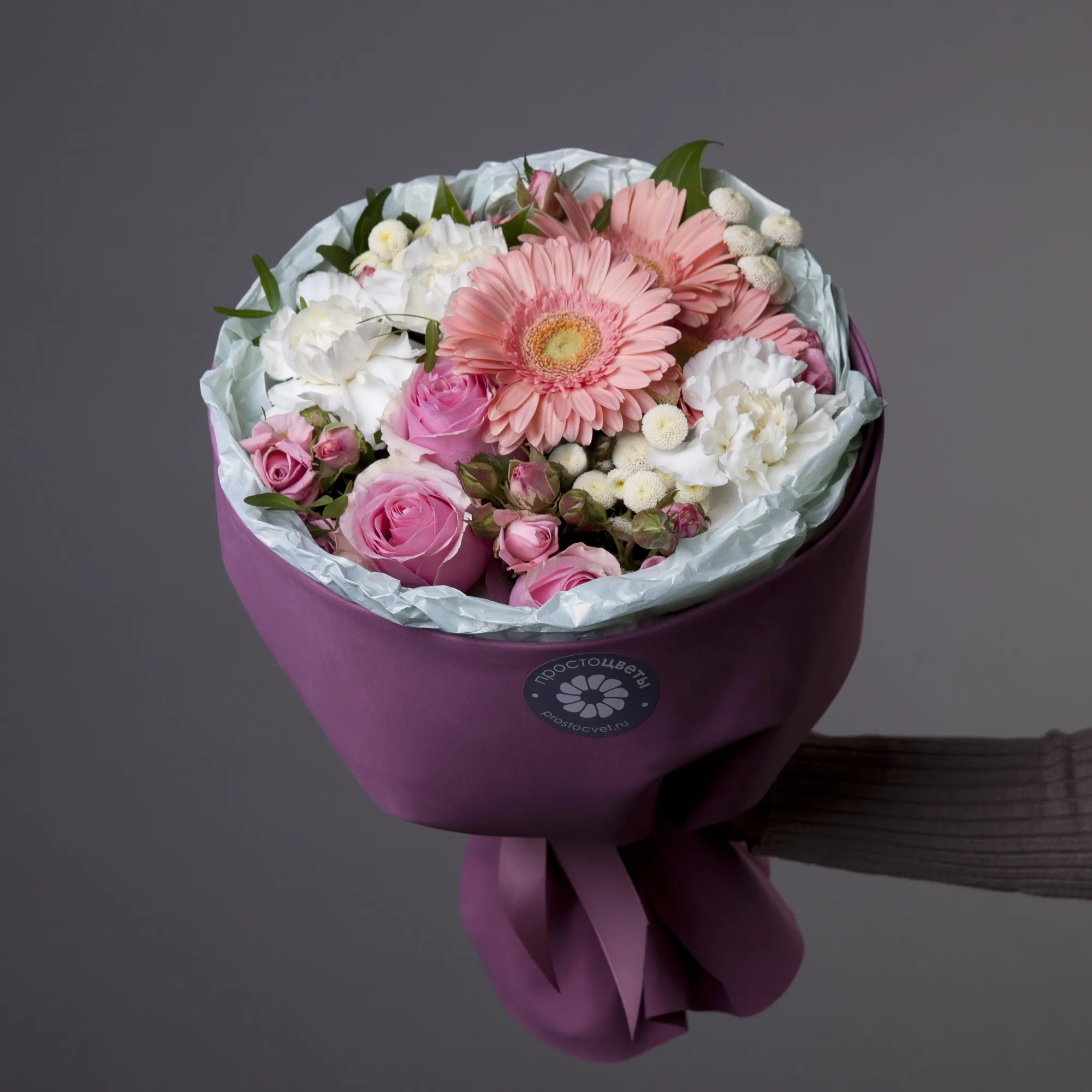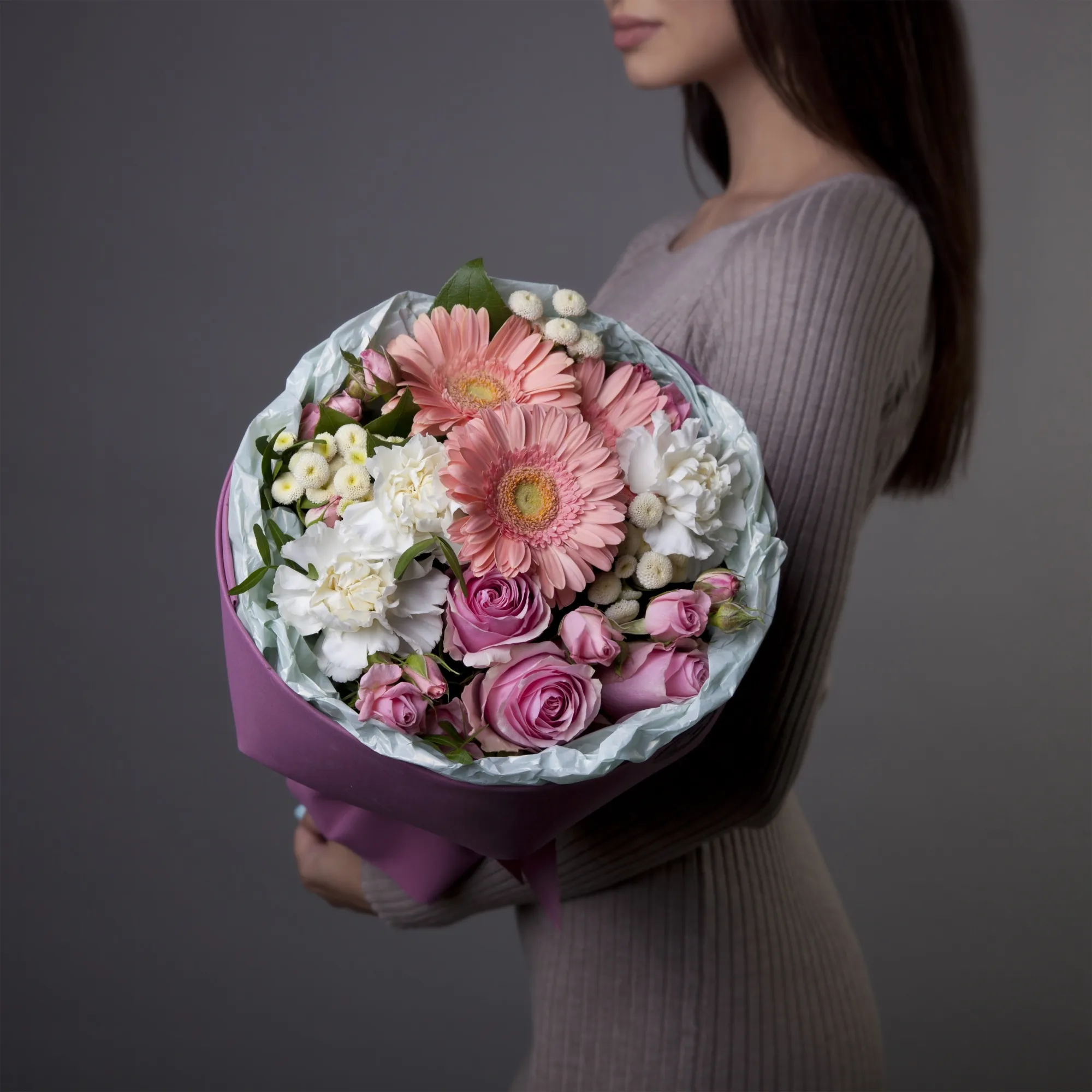 Букет выполнен с учетом современных трендов в упаковке. Сложная круглая форма и правильный винно-лиловый цвет материала. Изящные розовые герберы и нежные розы в сочетании с воздушными белыми гвоздиками и матрикариями делают букет по-настоящему изысканным. Каждую деталь хочется рассматривать снова и снова.