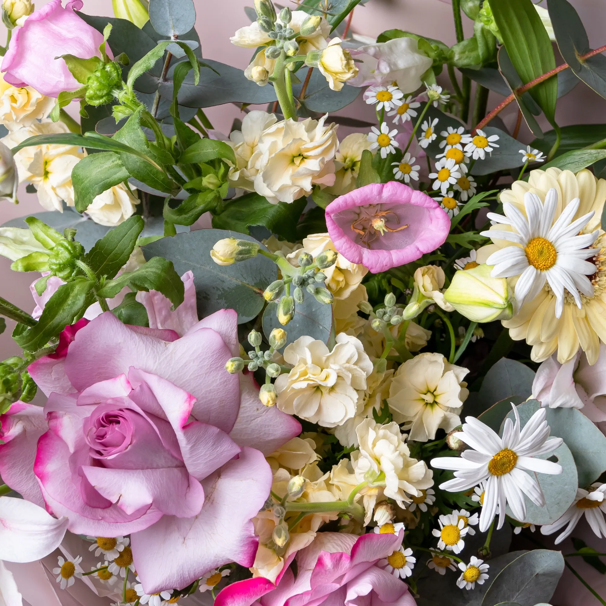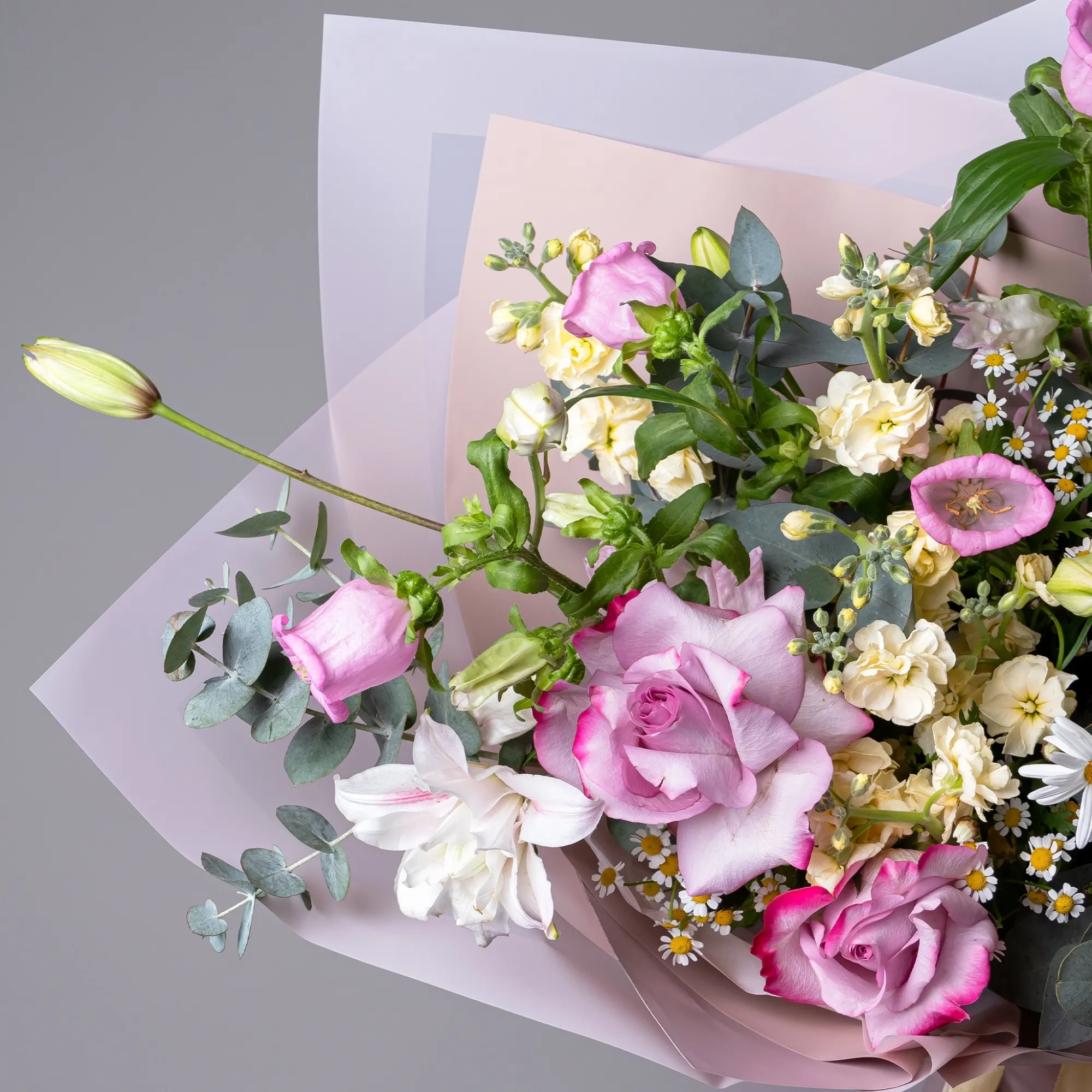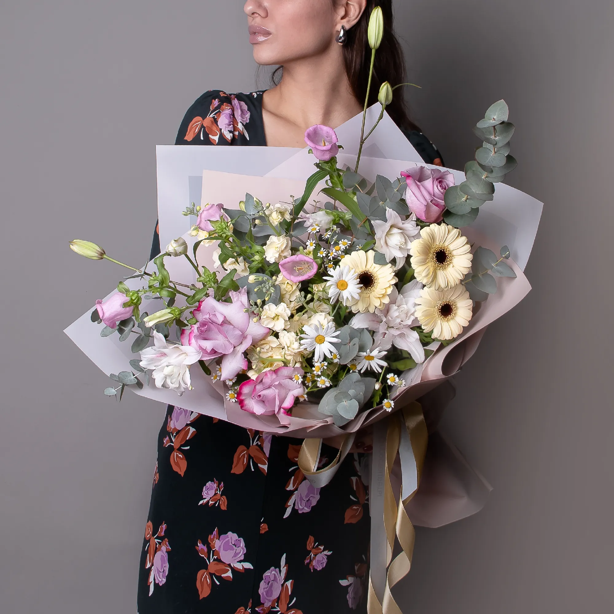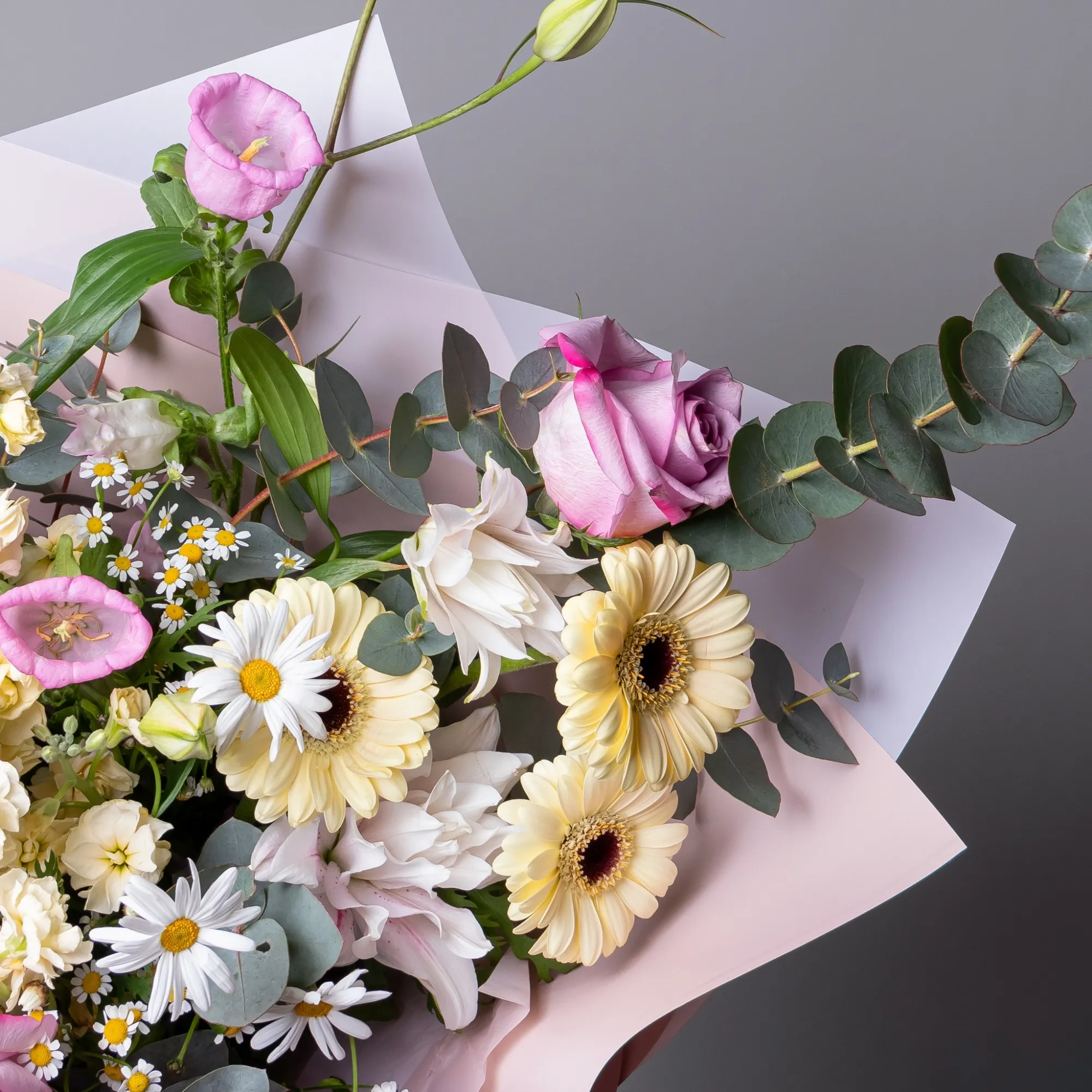 Роза-3, Ромашка-6, Лилия-3, Маттиола-2, Гермини-3, Листья эвкалипта-5