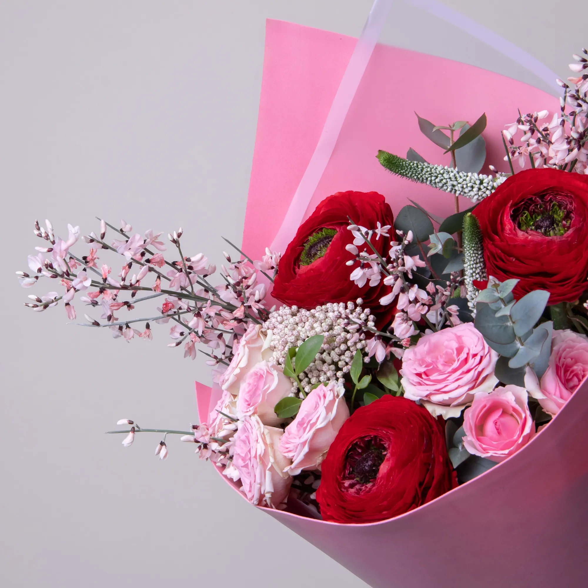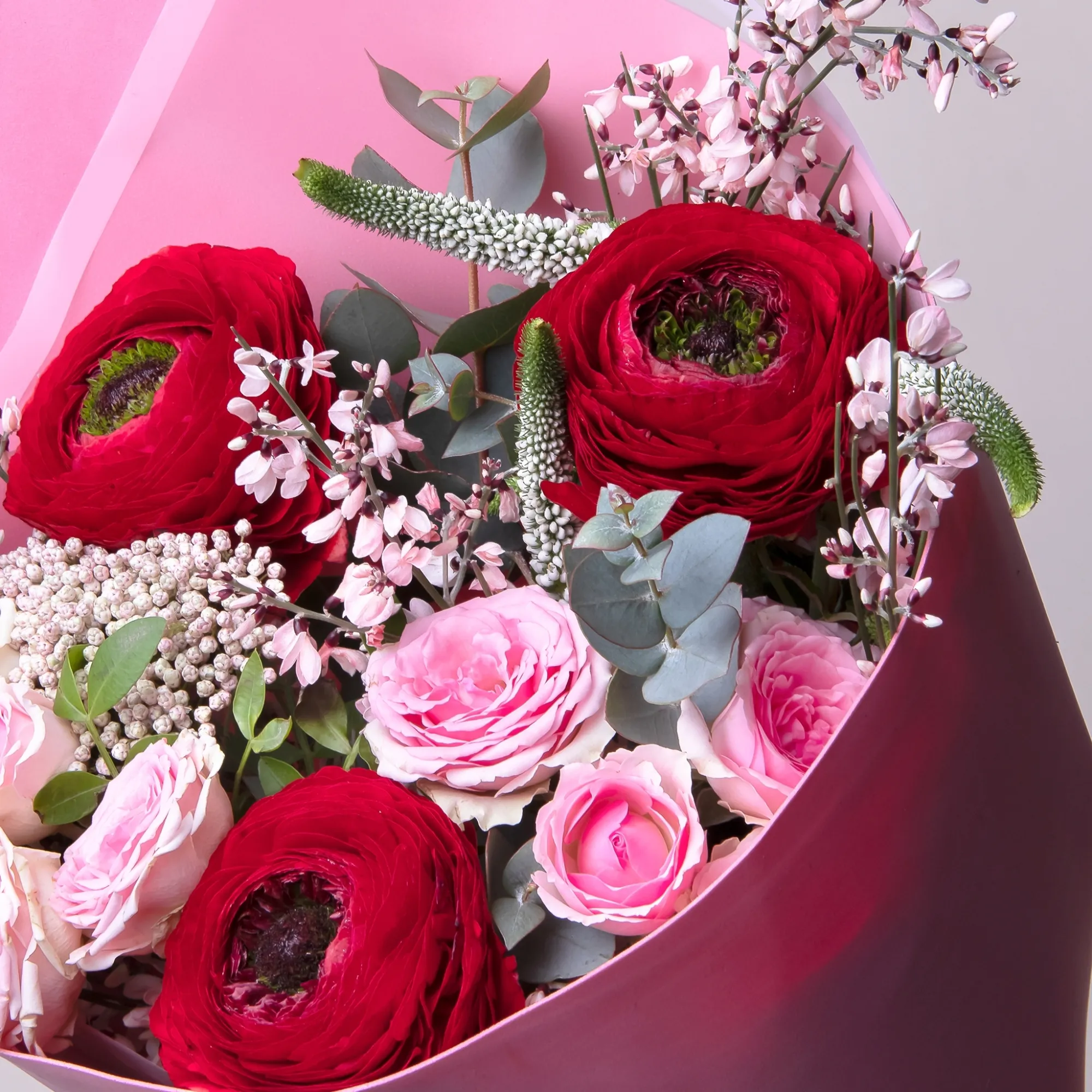 Роза, Ранункулюс, Листья фисташки, Листья эвкалипта