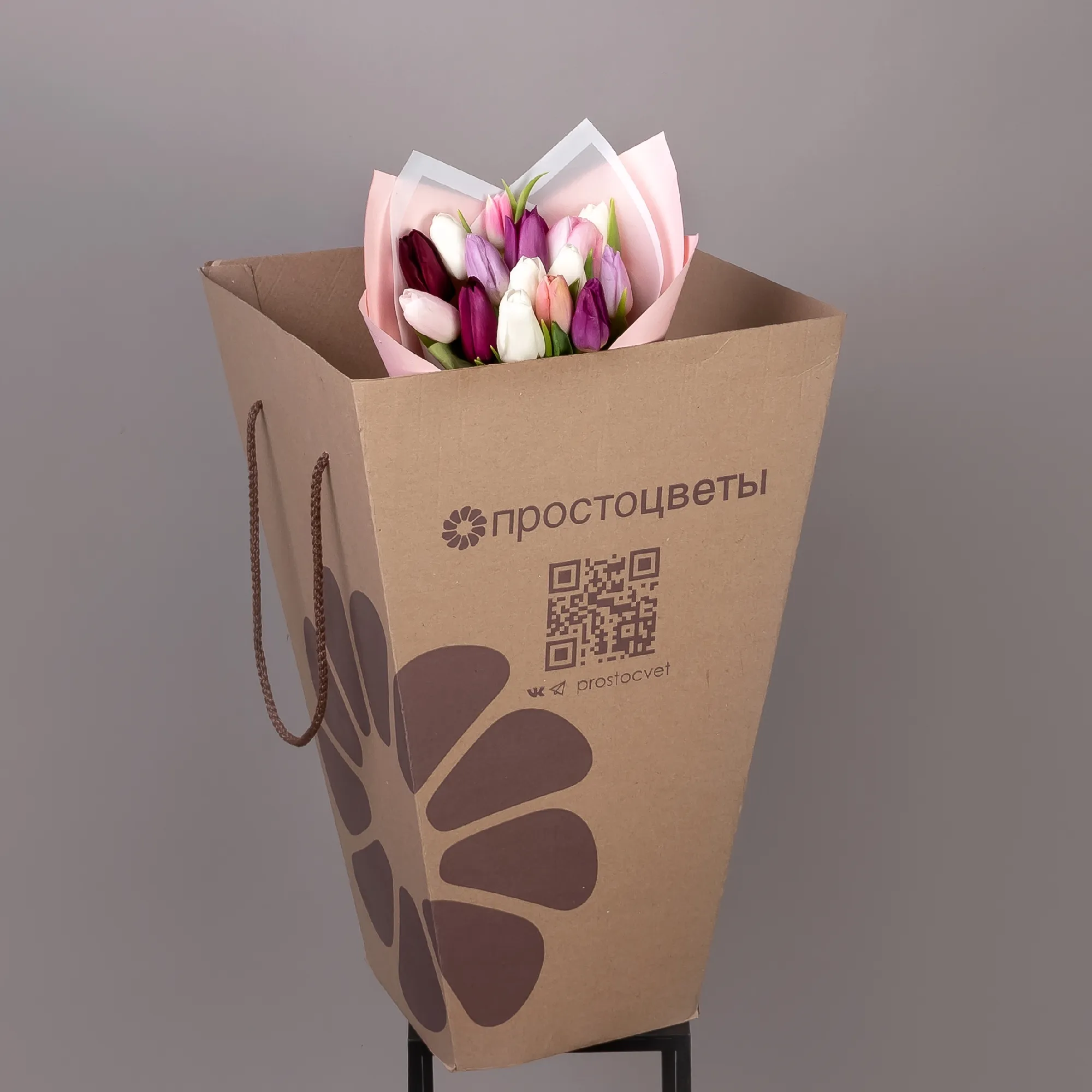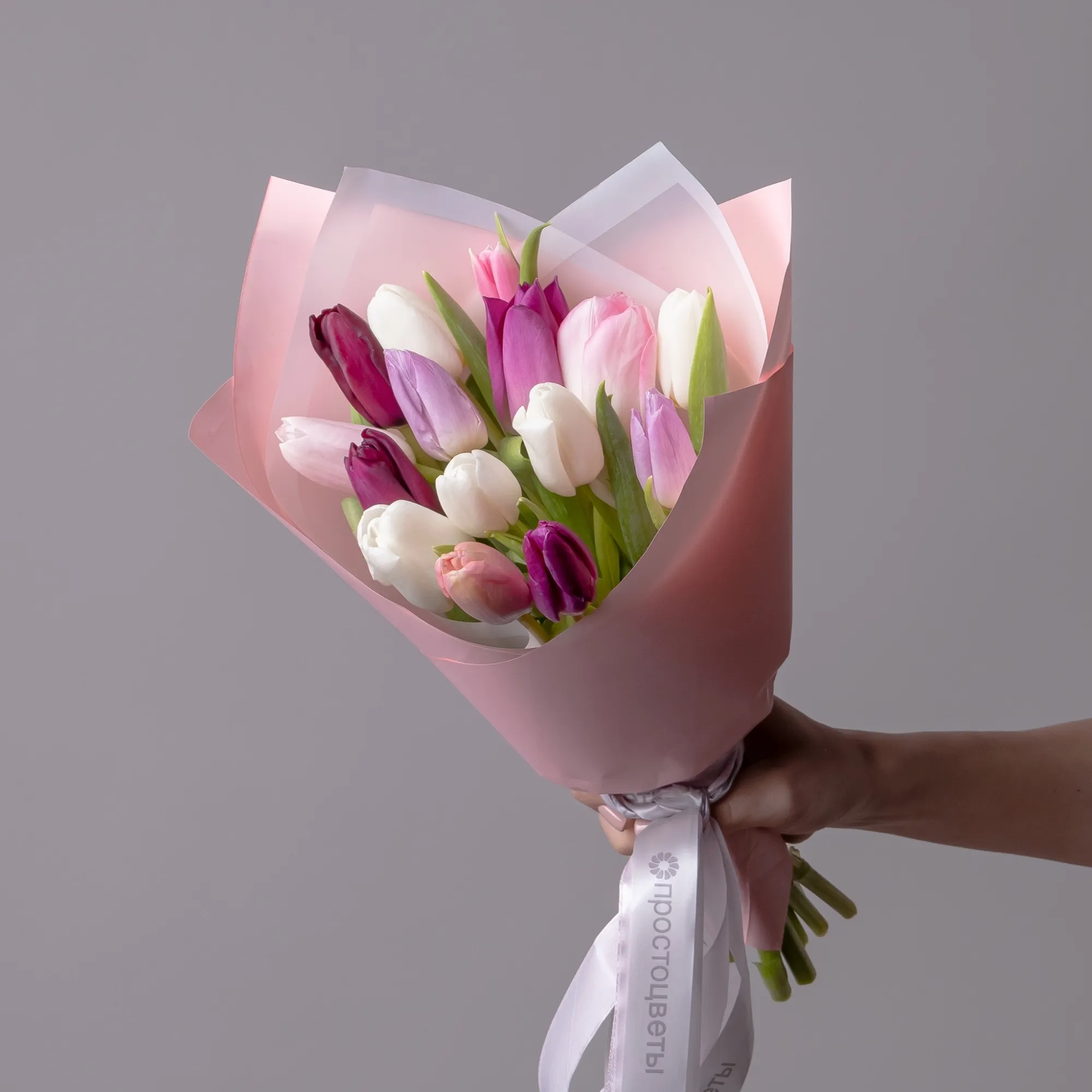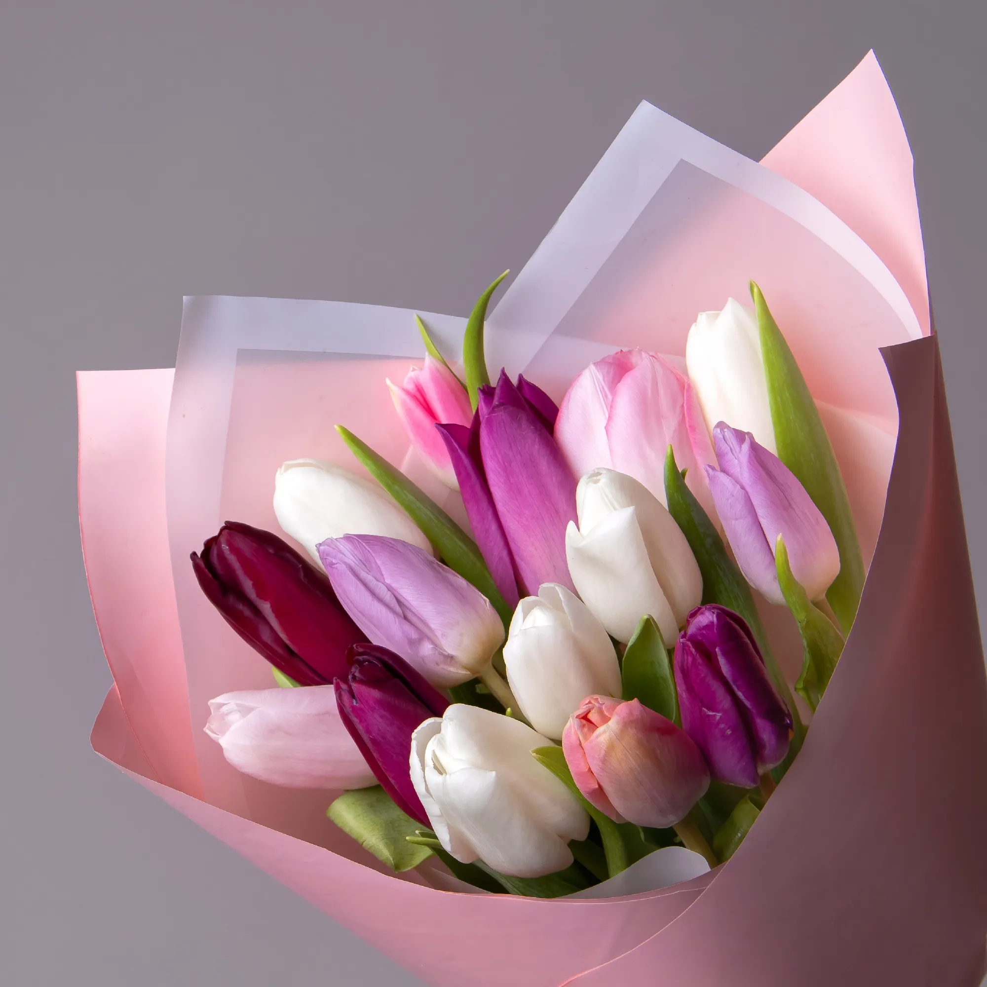 Монобукет из 15 хрустящих тюльпанов миксовых пастельных тонов.