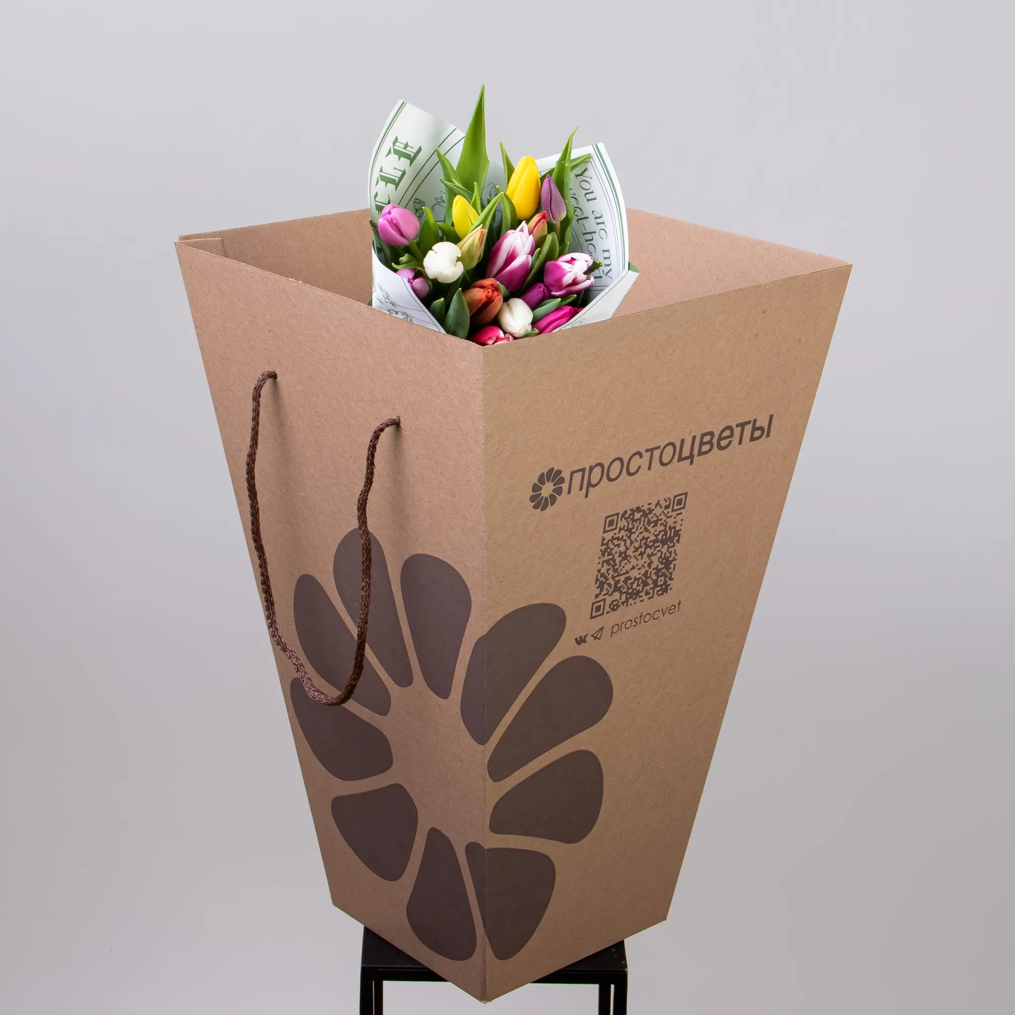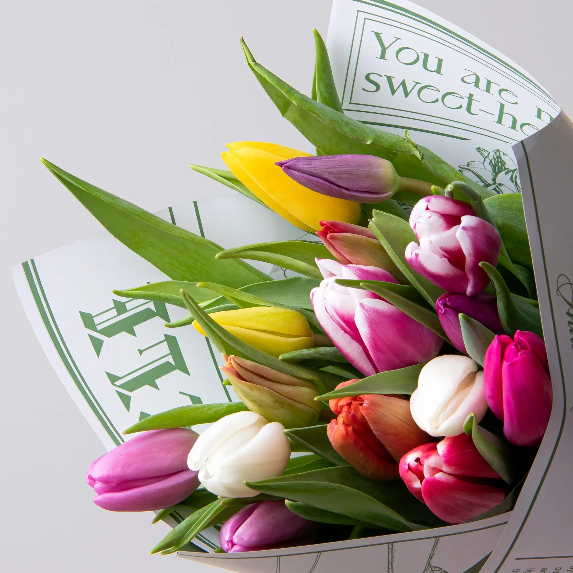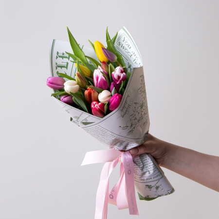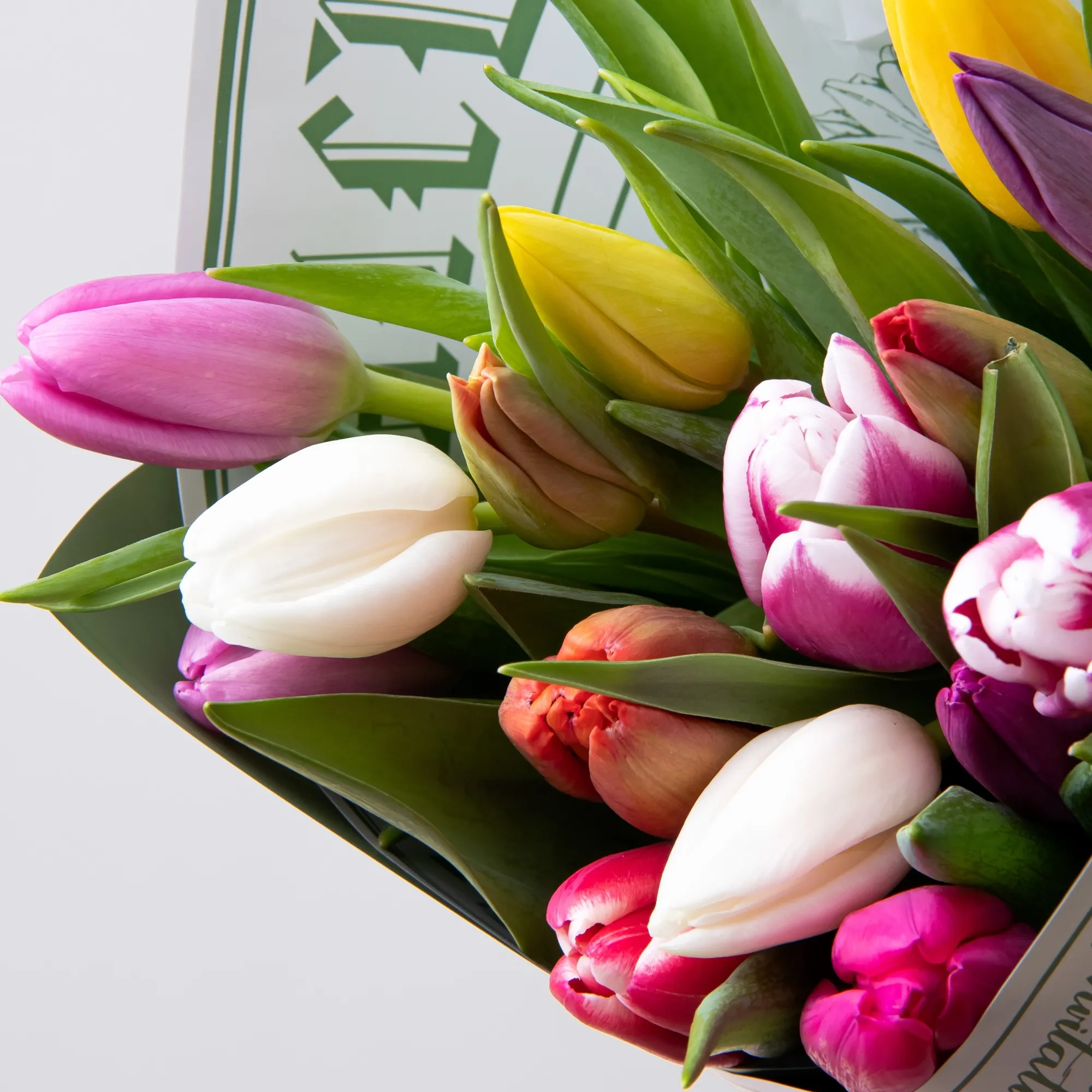Монобукет из 15 хрустящих тюльпанов ярких цветов Рейнбоу Микс.