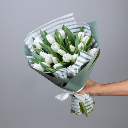 Монобукет из 25 хрустящих тюльпанов белого цвета сорта Антартик.