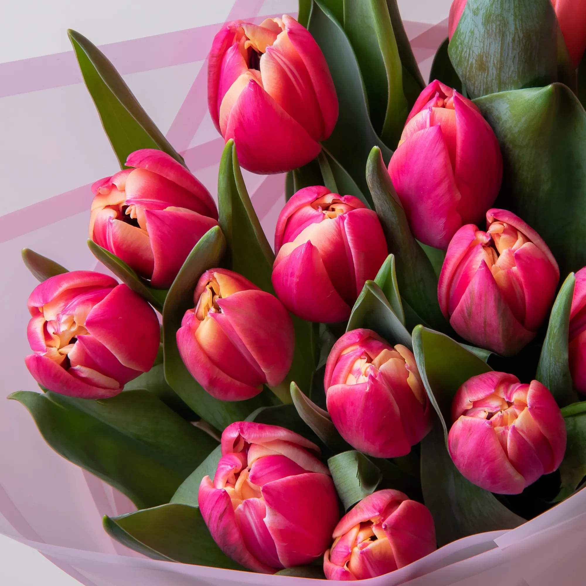Монобукет из 15 хрустящих пионовидных тюльпанов сорта Колумбус.