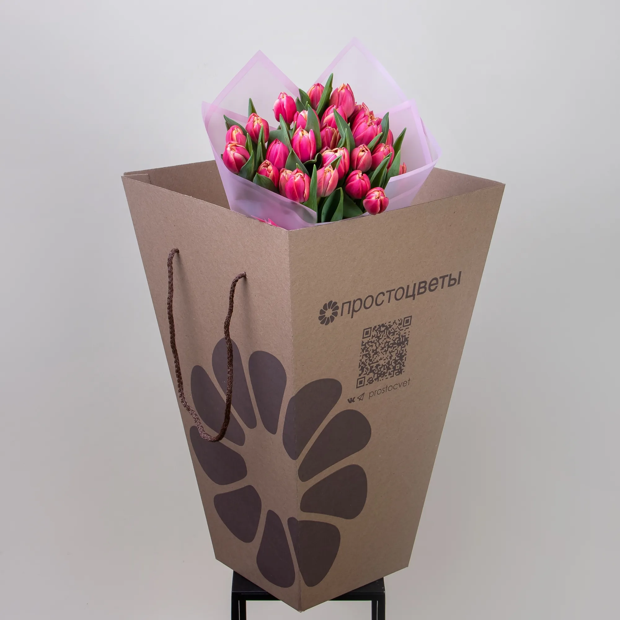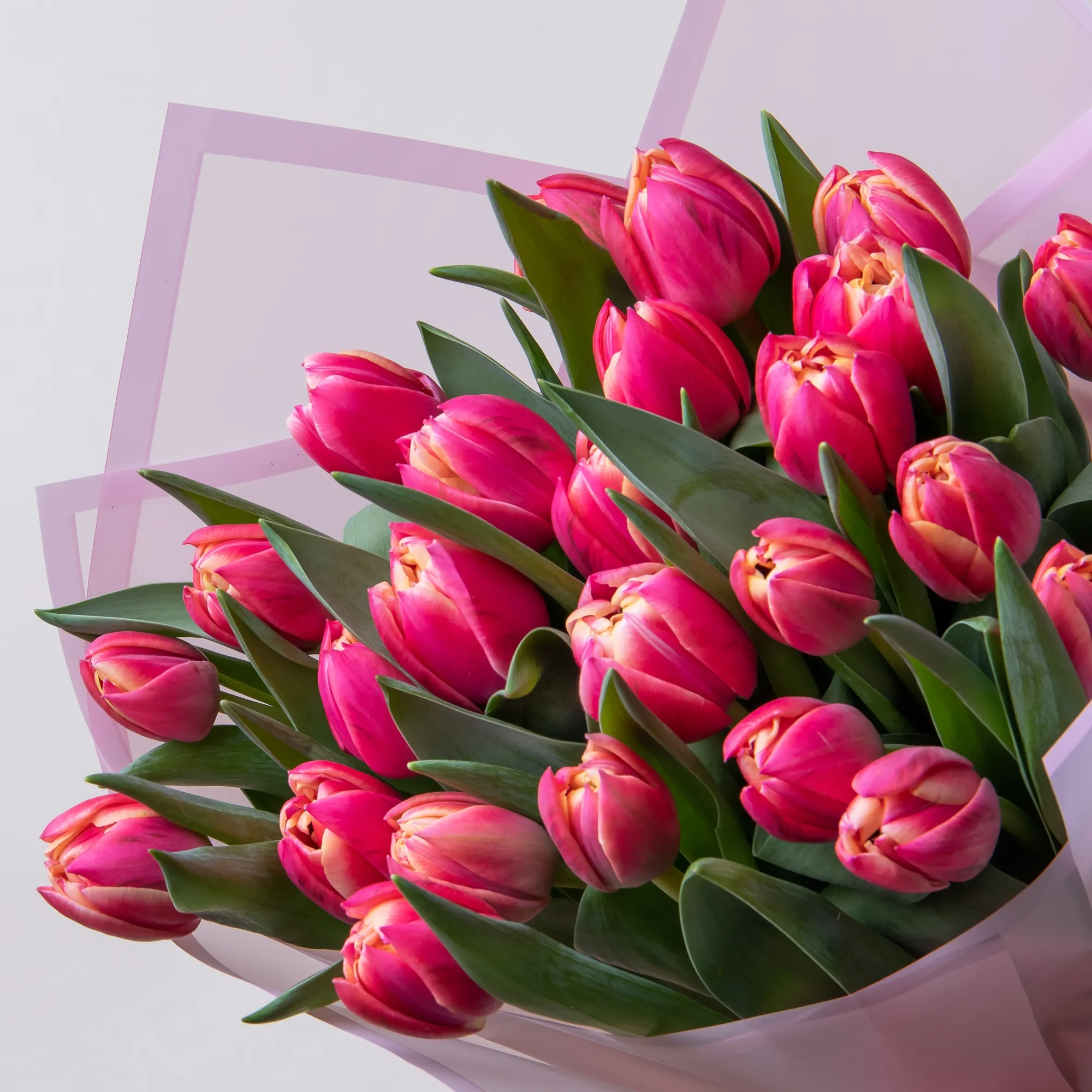 Монобукет из 25 хрустящих пионовидных тюльпанов сорта Колумбус.