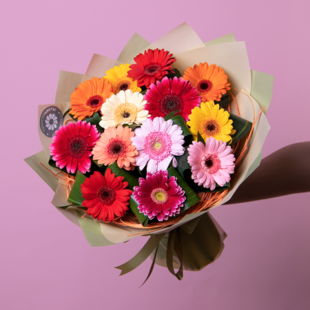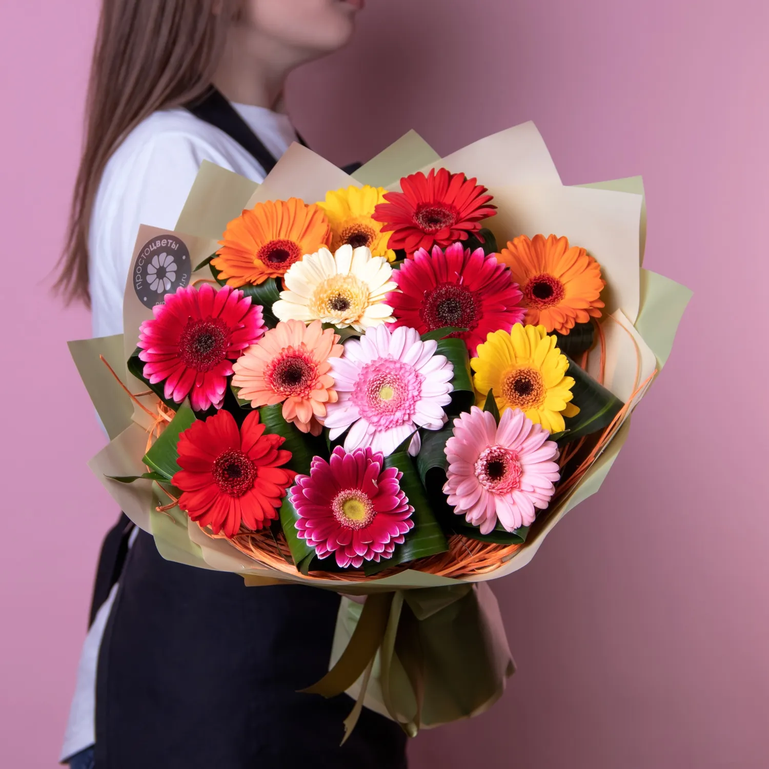 В составе букета "Улыбка" гермини следующих оттенков - жёлтая, оранжевая, красная, персиковая, кремовая, розовая, светло-розовая и красно-розовая, дополнен листьями фисташки и аспидистры. Этот букет идеально подойдёт для следующих случаев: *Поздравление с юбилеем - яркая палитра цветов символизирует насыщенную, полную событий жизнь, а разнообразие оттенков говорит о многогранности личности юбиляра. *День рождения ребёнка или подростка - весёлая, солнечная гамма цветов создаёт праздничное настроение, а яркие тона особенно нравятся детям и молодёжи. *Поздравление с выздоровлением - жизнеутверждающие цвета символизируют оптимизм и энергию, а разнообразие оттенков создаёт позитивное настроение Закажите букет с доставкой или заберите самовывозом. И помните, что цветы - это просто.