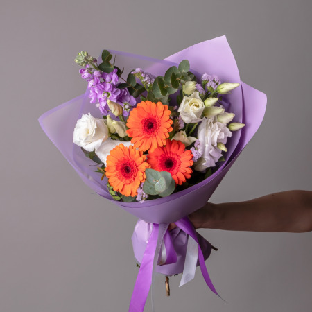 В составе букета "Увидимся еще S" сиреневая статица, белый лизиантус, лавандовая маттиола, персиковая гермини, дополнен листьями фисташки и эвкалипта. Этот букет идеально подойдёт для следующих случаев: *Букет для подруги на девичник - романтичные лавандовые оттенки создают атмосферу девичьей вечеринки, а персиковые тона добавляют нежности и веселья, символизируя радость совместного времяпрепровождения. *Поздравление с получением гражданства или переездом в другую страну - сочетание разных оттенков символизирует новый этап в жизни и объединение культур, а статица как символ постоянства говорит о том, что связь с родными местами всегда останется в сердце. Закажите букет с доставкой или заберите самовывозом. И помните, что цветы - это просто.