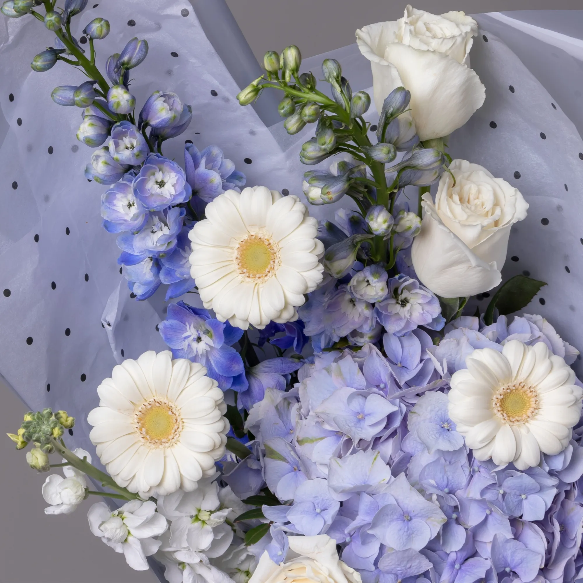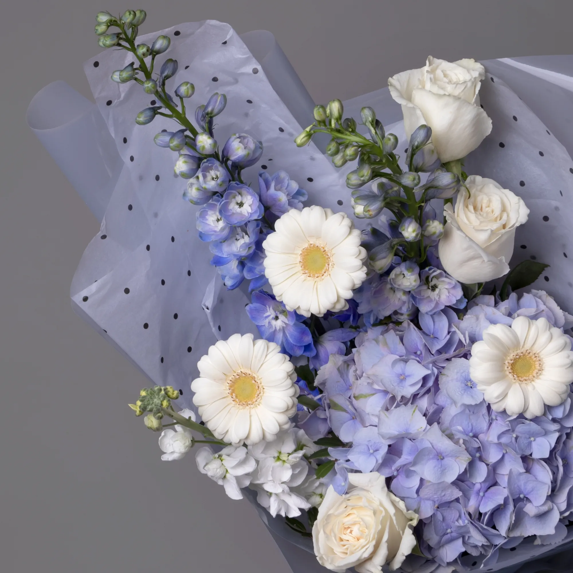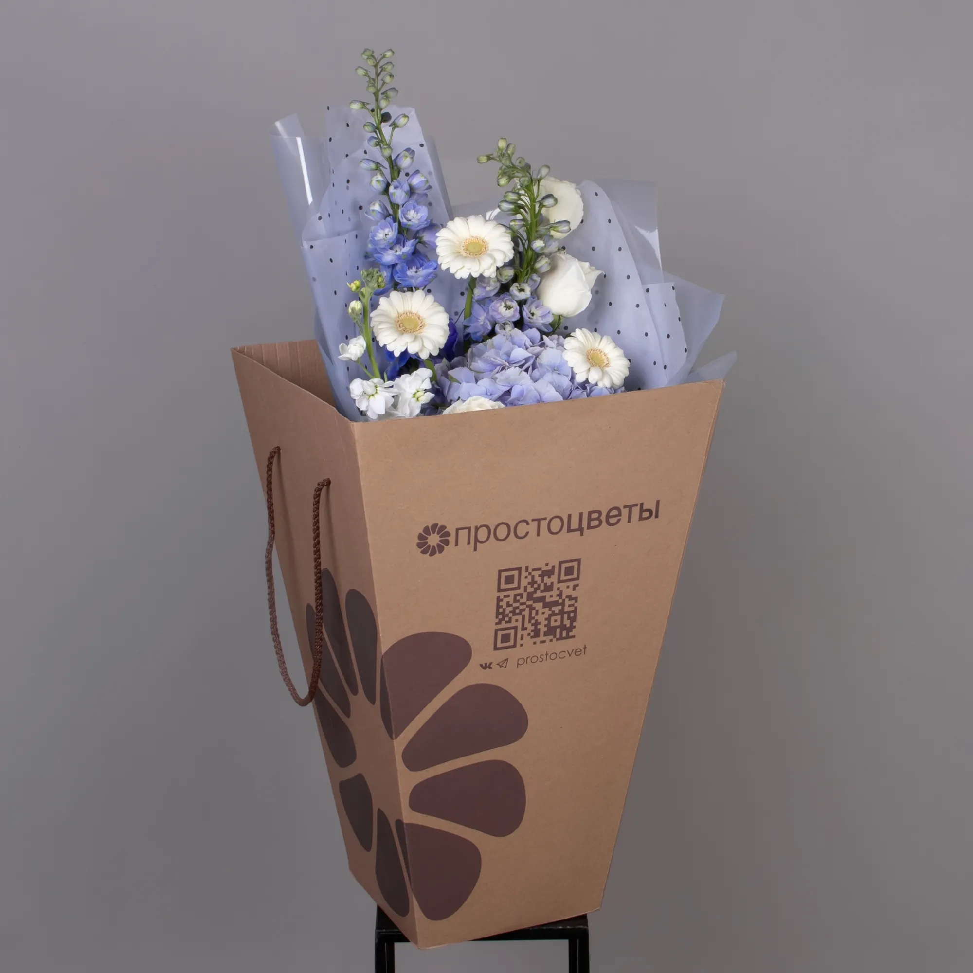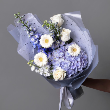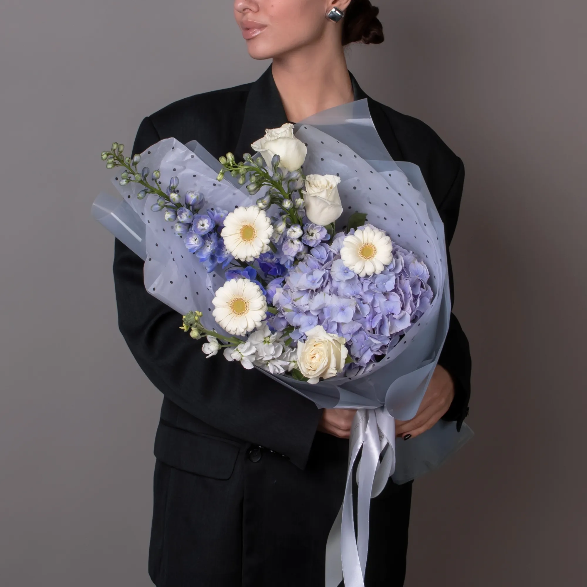 Современный асимметричный букет в сиреневой цветовой гамме. В составе шикарная сортовая гортензия "Премиум Блю", ароматная пионовидная роза "Плайя Бланка", синий дельфиниум, белая маттиола, белая гермини, Букет для тех, кто ценит необычные формы. Идеально подойдет в качестве подарка для творческой особо, а также тем, кто любит эксперименты и нестандартный подход. Закажите букет с доставкой или заберите самовывозом. И помните, что цветы - это просто.