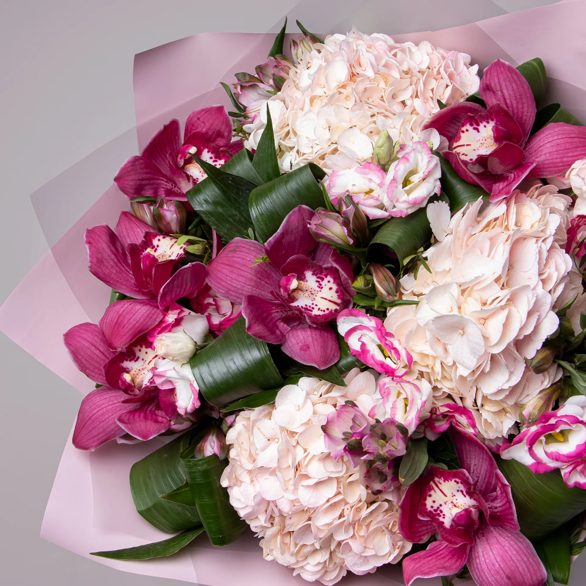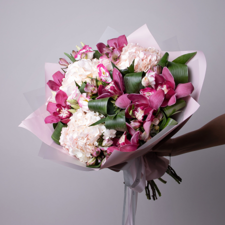 Погода в Москве нас редко балует солнечными и радостными днями. Но всегда есть способ изменить настроение, подарить себе и близким улыбку в хмурый вечер – преподнести букет. Настоящая панацея в хмурые будни – композиция из пышной гортензии, невинных альстромерий, элегантного цимбидиума и лизиантуса. Органичный тандем из благоухающих цветов в миг зарядит прекрасными «ванильными» эмоциями, передаст всю вашу теплоту чувств самым дорогим людям. Семь дней в неделю мы доставляем произведения высокой флористики по Москве. Ваш букет ждёт Вас!