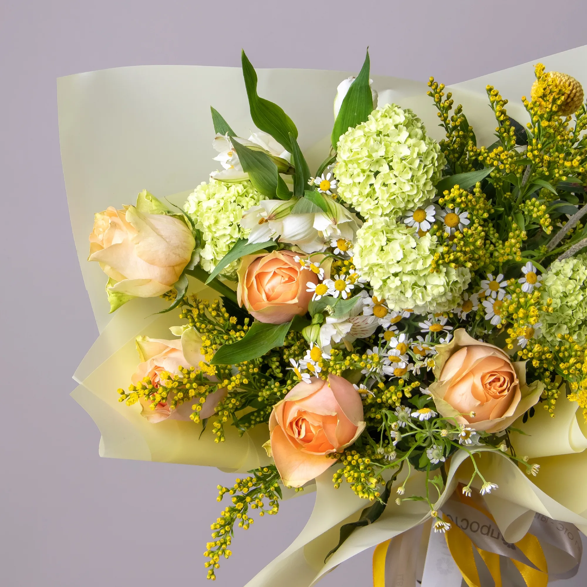 Роза-5, Ромашка-3, Альстромерия-2, Солидаго-2, Листья фисташки-3