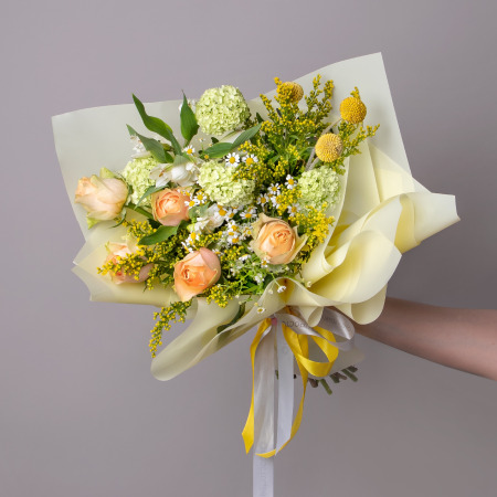 Букет "Велюр" - это свежее сочное сочетание желтого с зеленым. В составе роза "Гравити", вибурнум, матрикария, краспеия, белая альстромерия и солидаго. Преркасный вариант подарка в весенний сезон, когда природа вокруг расцветает и хочется больше живых ярких красок. Закажите букет с доставкой или заберите самовывозом. И помните, что цветы - это просто.