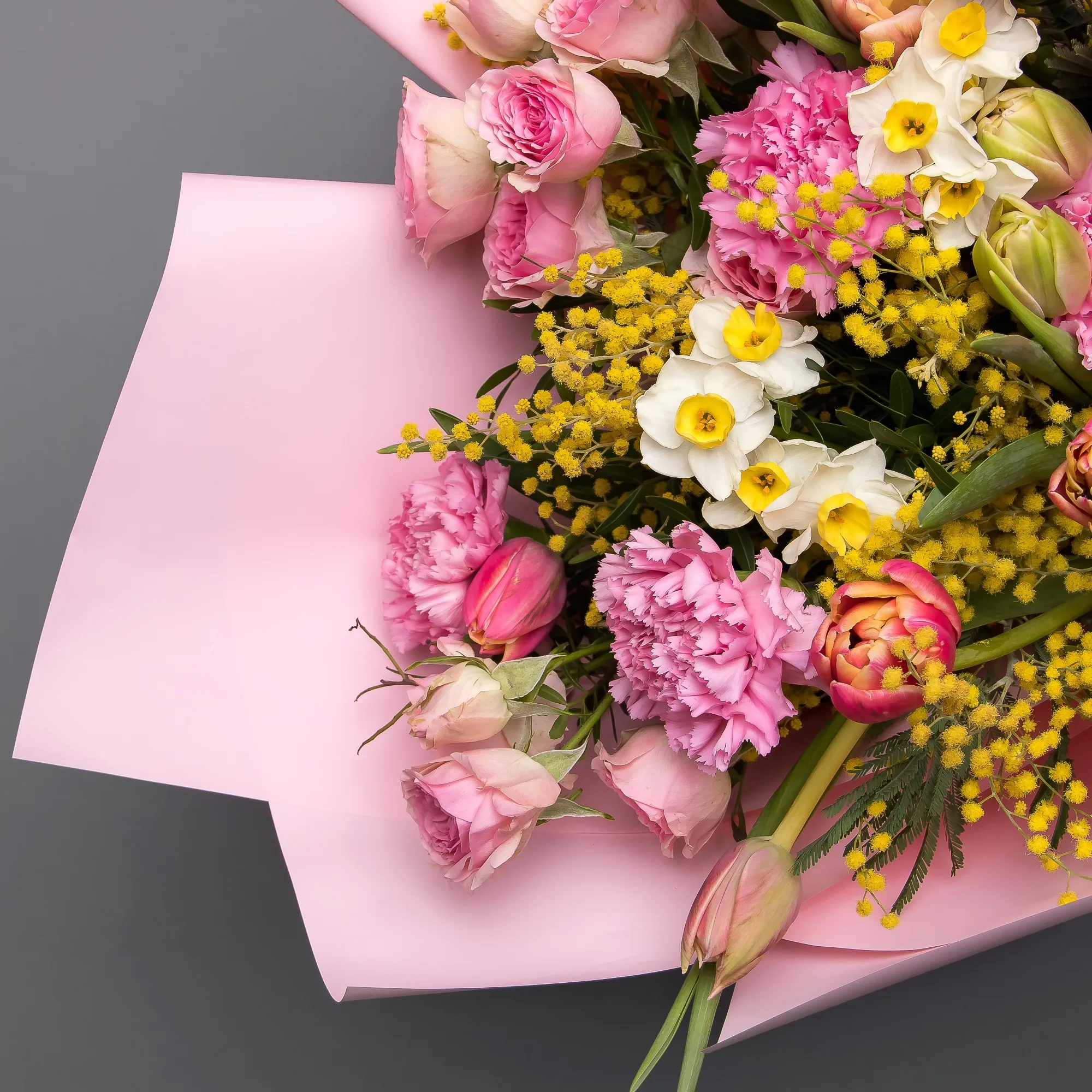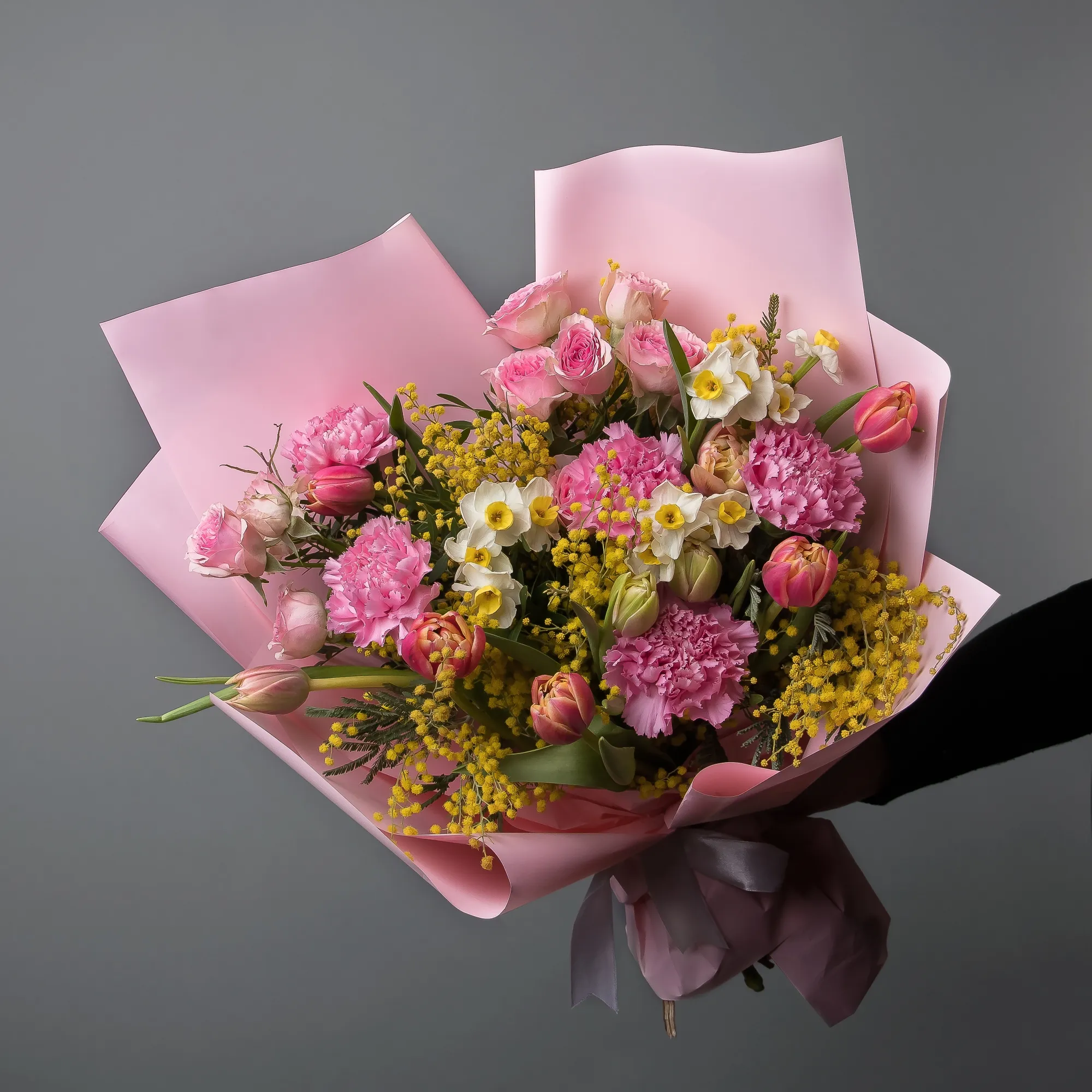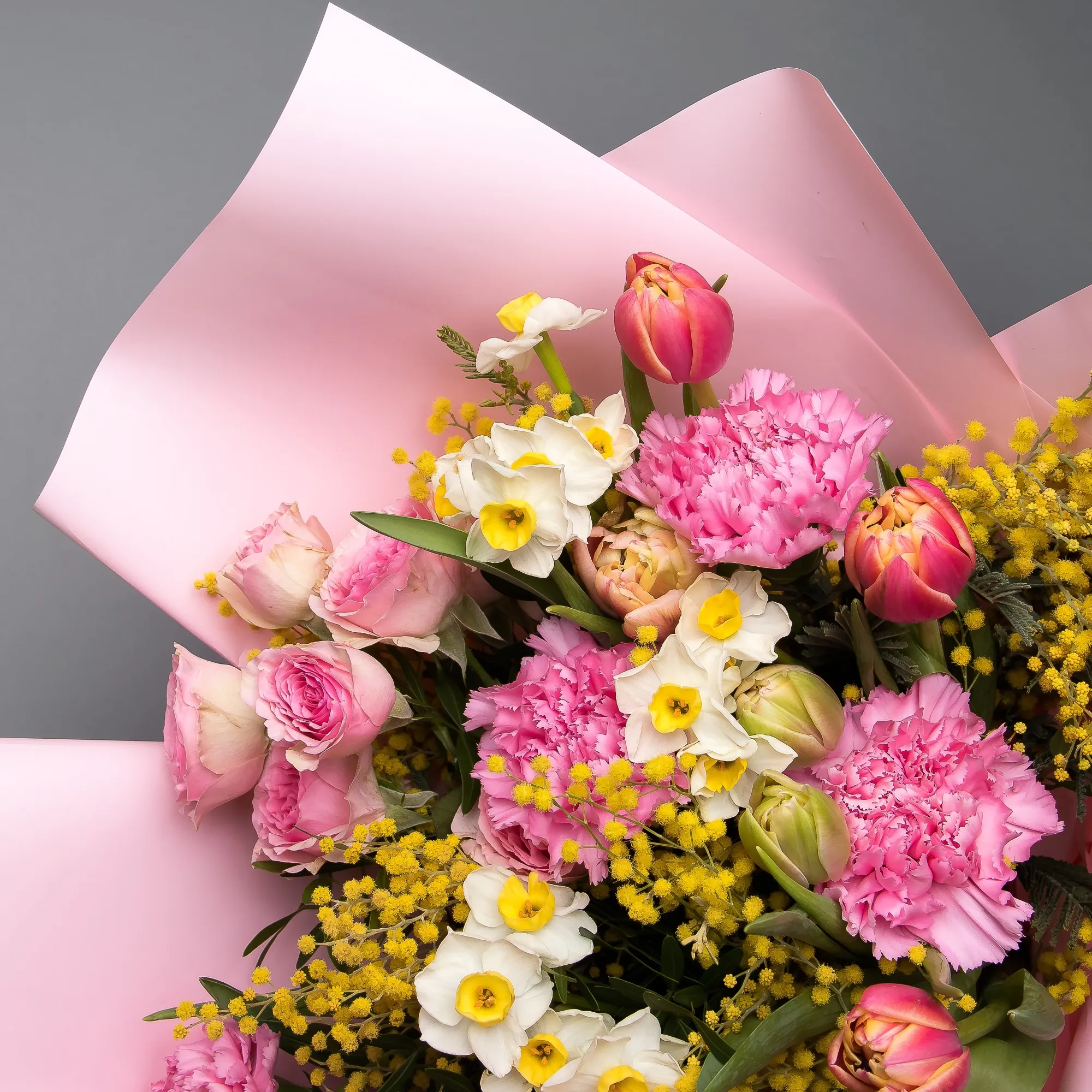 Нарцисс, Гвоздика, Мимоза, Роза, Тюльпан, Листья фисташки