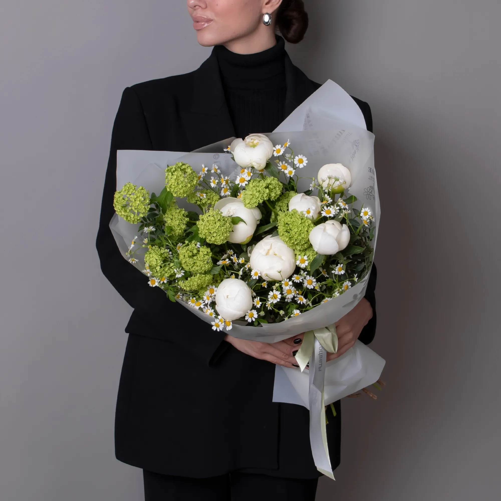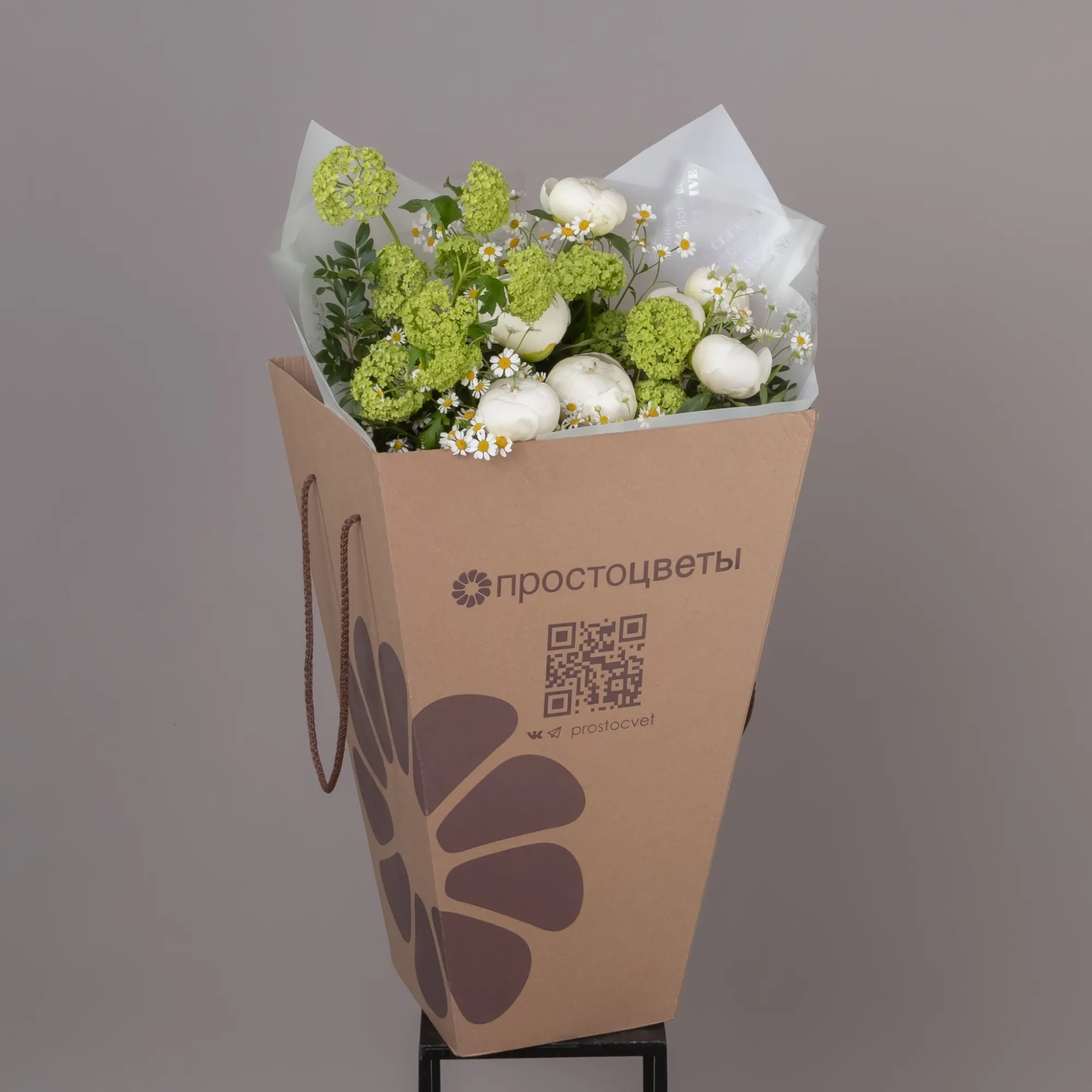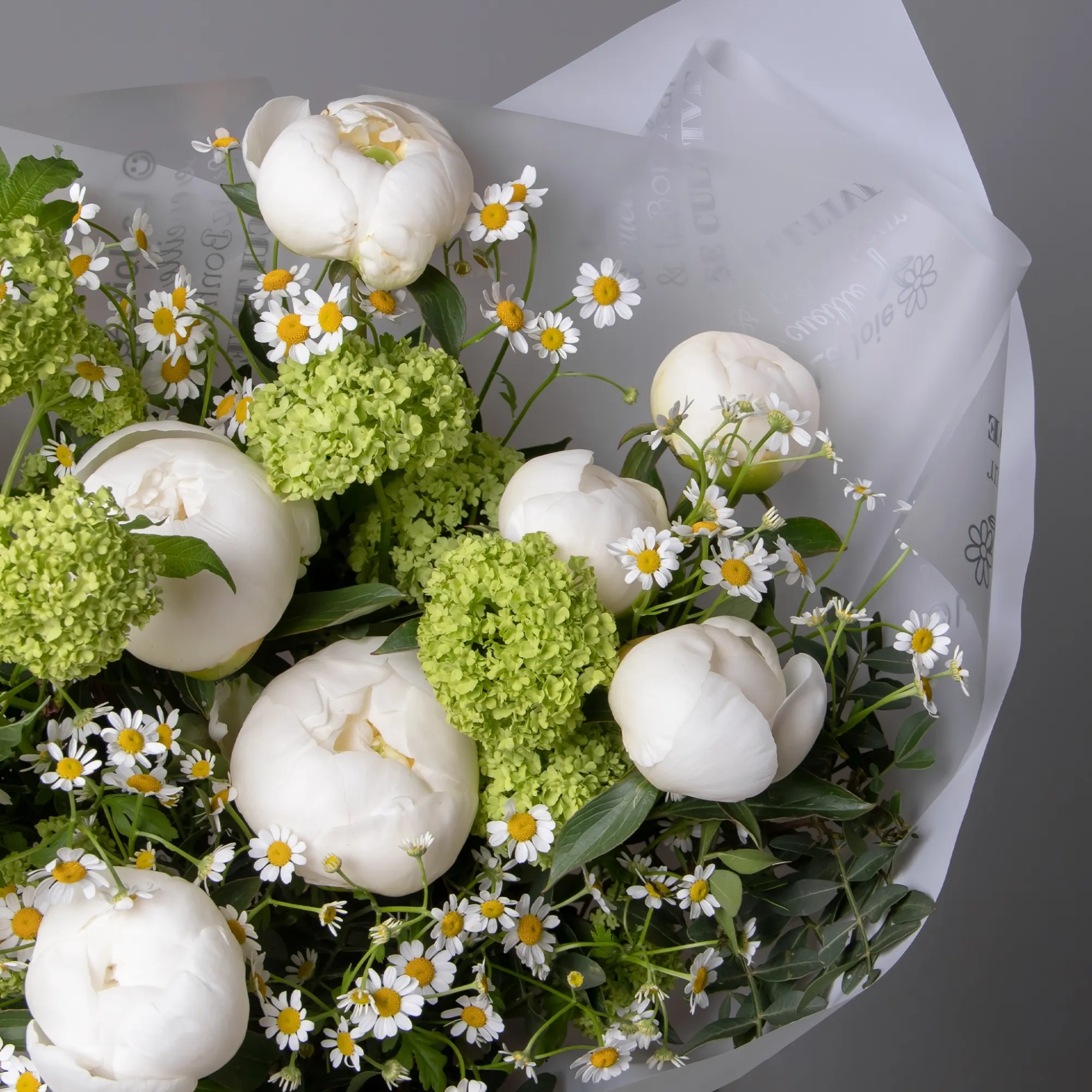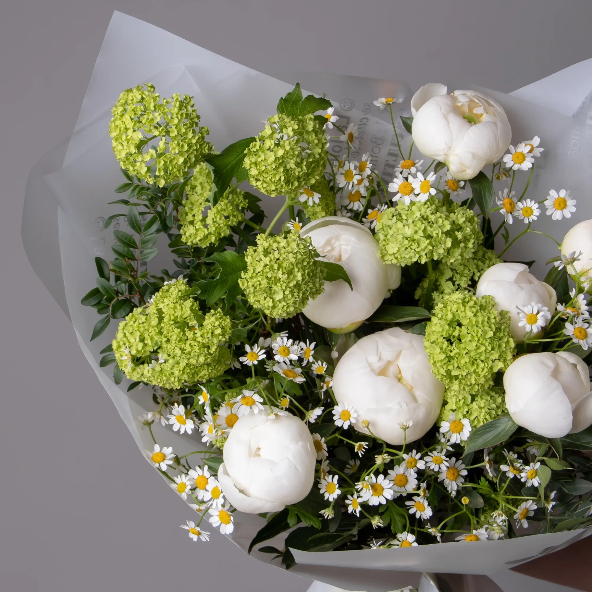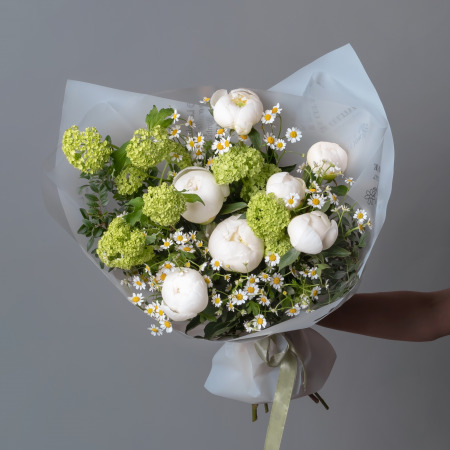 В составе букета "Весенние мечты" пион "Боул оф крем", зелёный вибурнум, белая матрекария, дополнен листьями фисташки. Этот букет идеально подойдёт для следующих случаев: *Поздравление с беременностью или рождением ребенка. - нежная композиция в светлых тонах символизирует чистоту и новые начинания, кремовые пионы создают атмосферу уюта и тепла, а белые маргаритки добавляют свежести, что делает букет особенно подходящим для такого особенного события в жизни. *Весенний праздник или день рождения в теплое время года - букет идеально передает настроение весны благодаря своим природным оттенкам и свежести, пионы "Боул оф крем" с их кремовым оттенком создают роскошный акцент, а зелень вибурнума и фисташки добавляют букету естественности и легкости, что делает его отличным подарком для весеннего торжества. Закажите букет с доставкой или заберите самовывозом. И помните, что цветы - это просто.