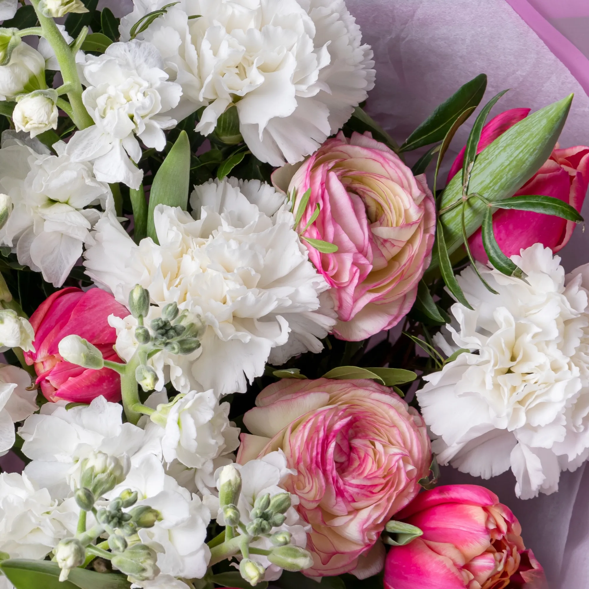 В составе букета "Весенняя рапсодия", белая гвоздика, белая маттиола, белый с розовым оттенком ранункулюс, малиновый тюльпан, дополнен листьями фисташки.Этот нежный весенний букет отлично подойдет для следущих случаев: *День рождение - светлые оттенки цветов символизируют чистоту и свежесть, а малиновые тюльпаны добавлят торжественности. *Первое свидание - романтическая композиция с преоблоданием белых цветов создаст атмосферу легкости и нежности.Закажите букет с доставкой или заберите самовывозом. И помните, что цветы - это просто.