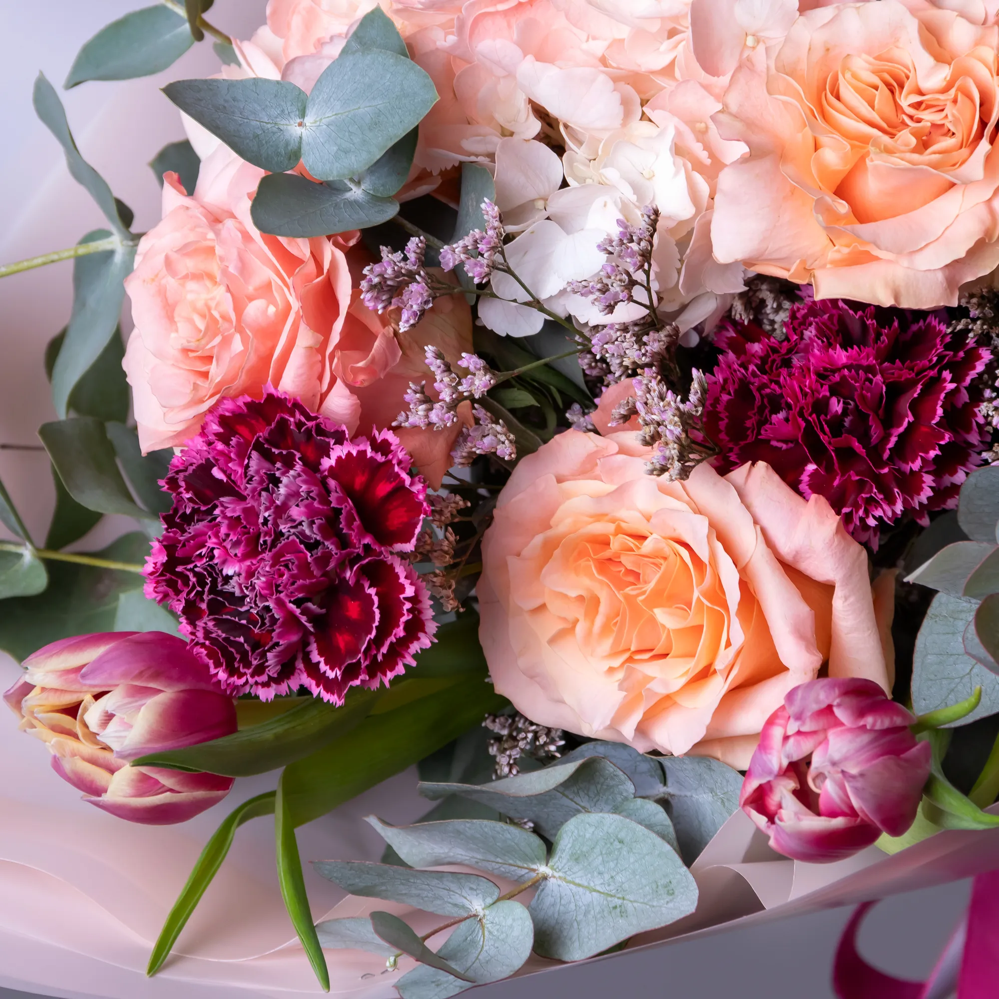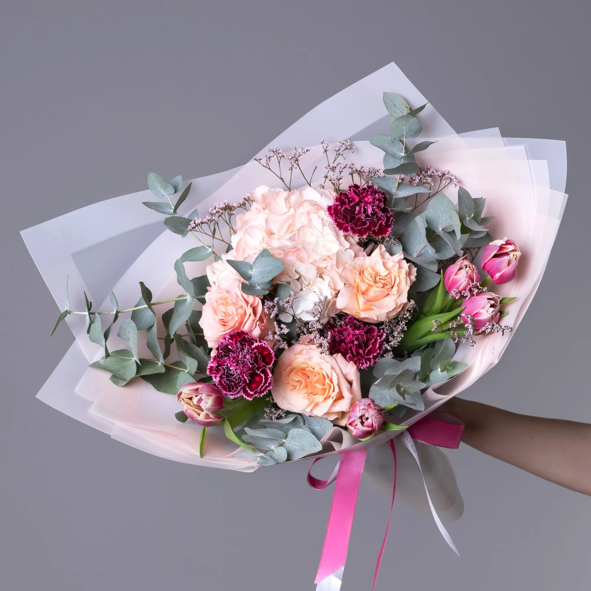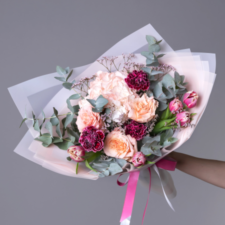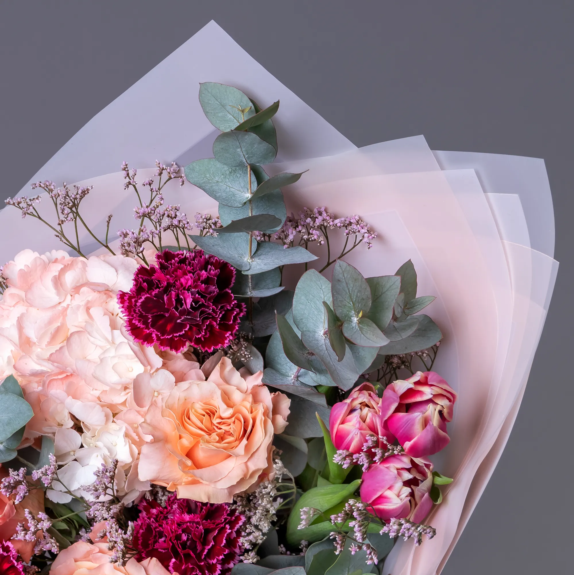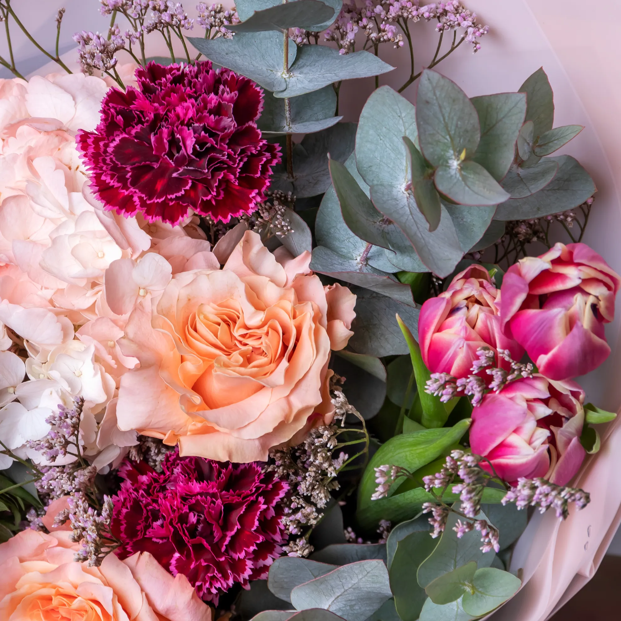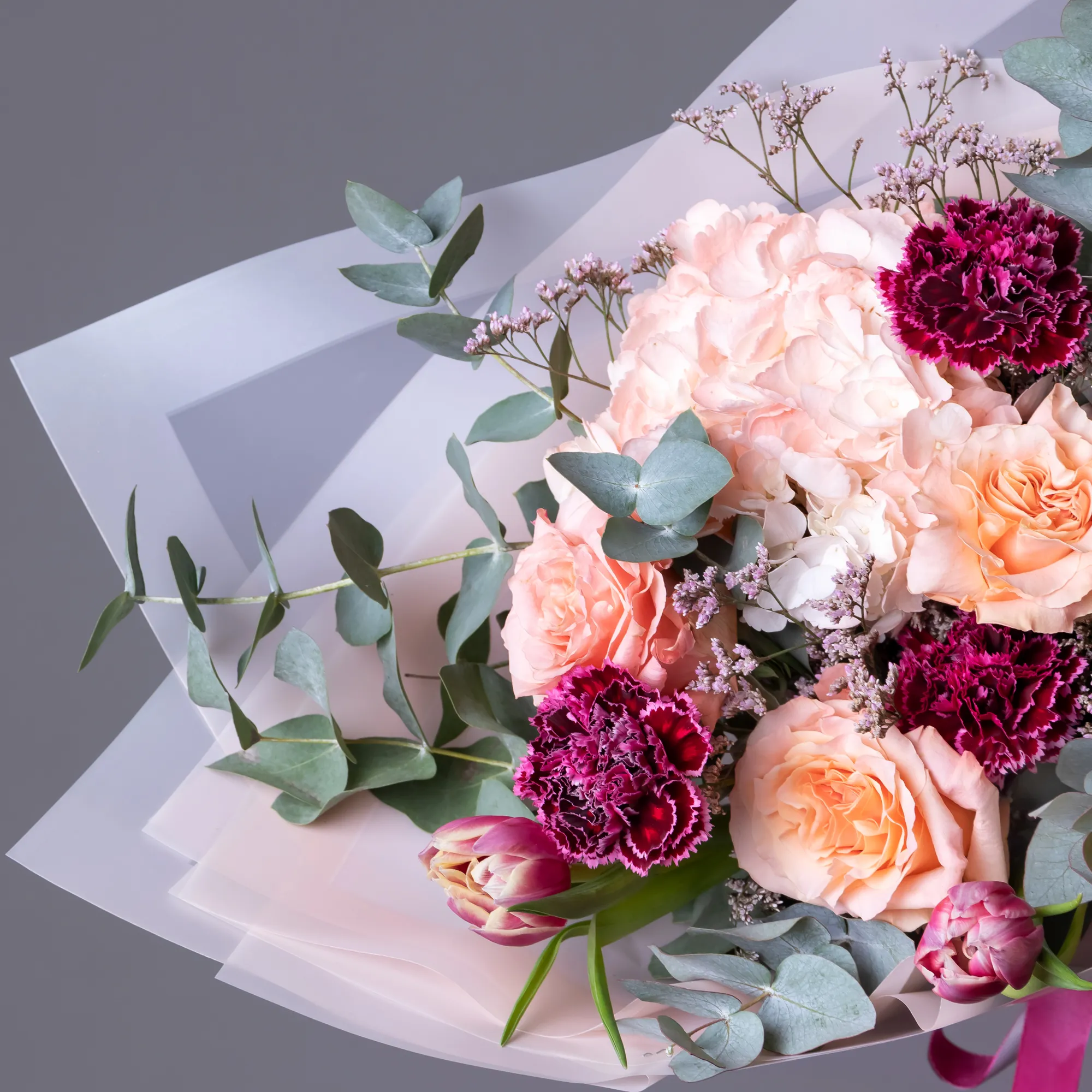 Гвоздика, Гортензия, Роза, Листья эвкалипта