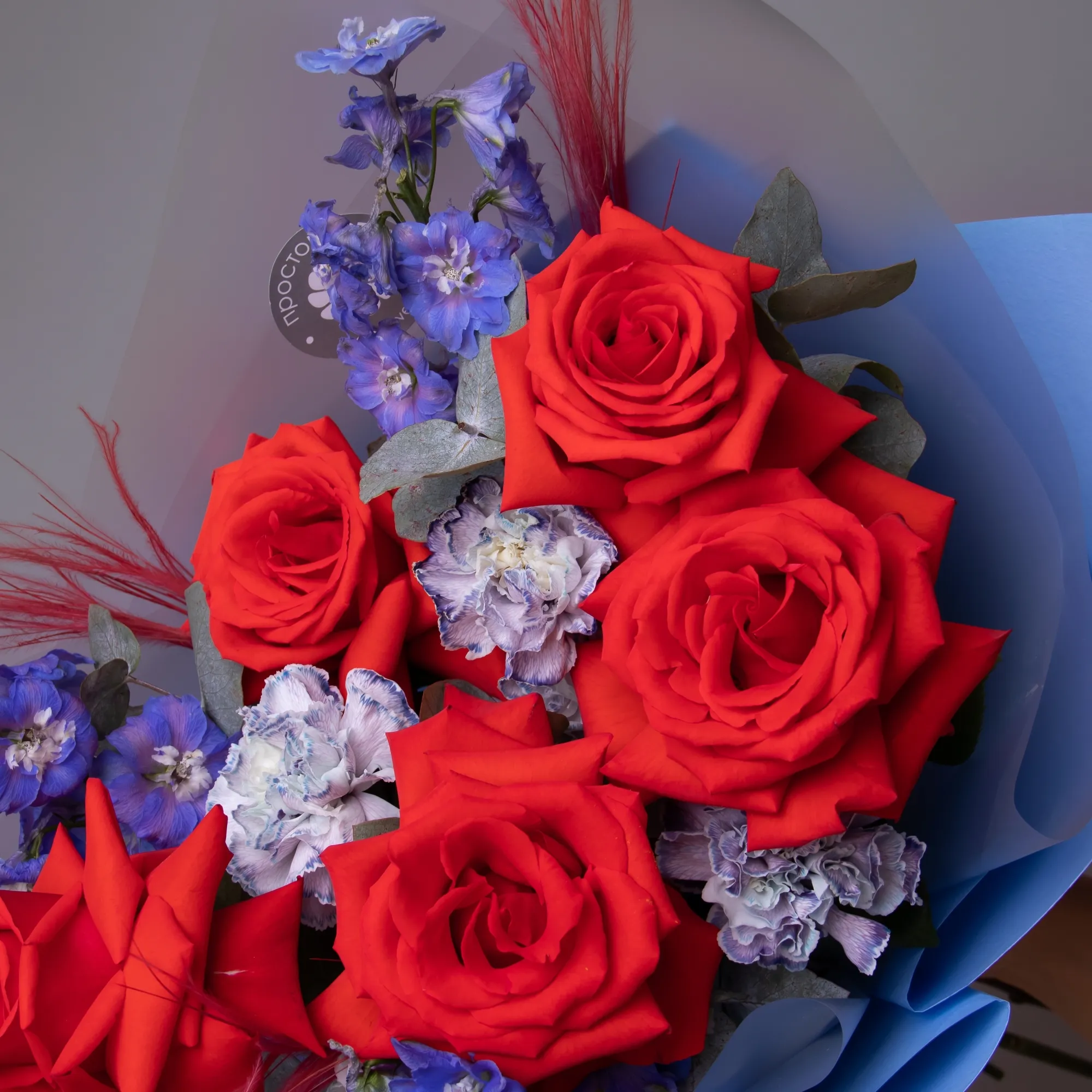 Гвоздика-5, Роза-5, Дельфиниум-3, Листья эвкалипта-5