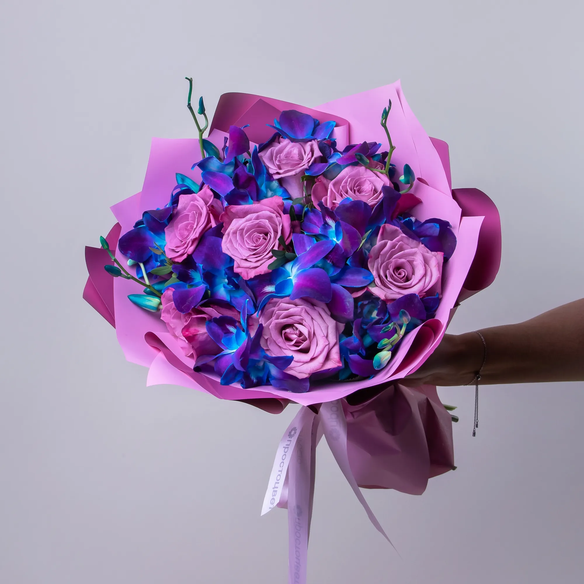 Букет из сиреневых роз и синих орхидей "Восход"