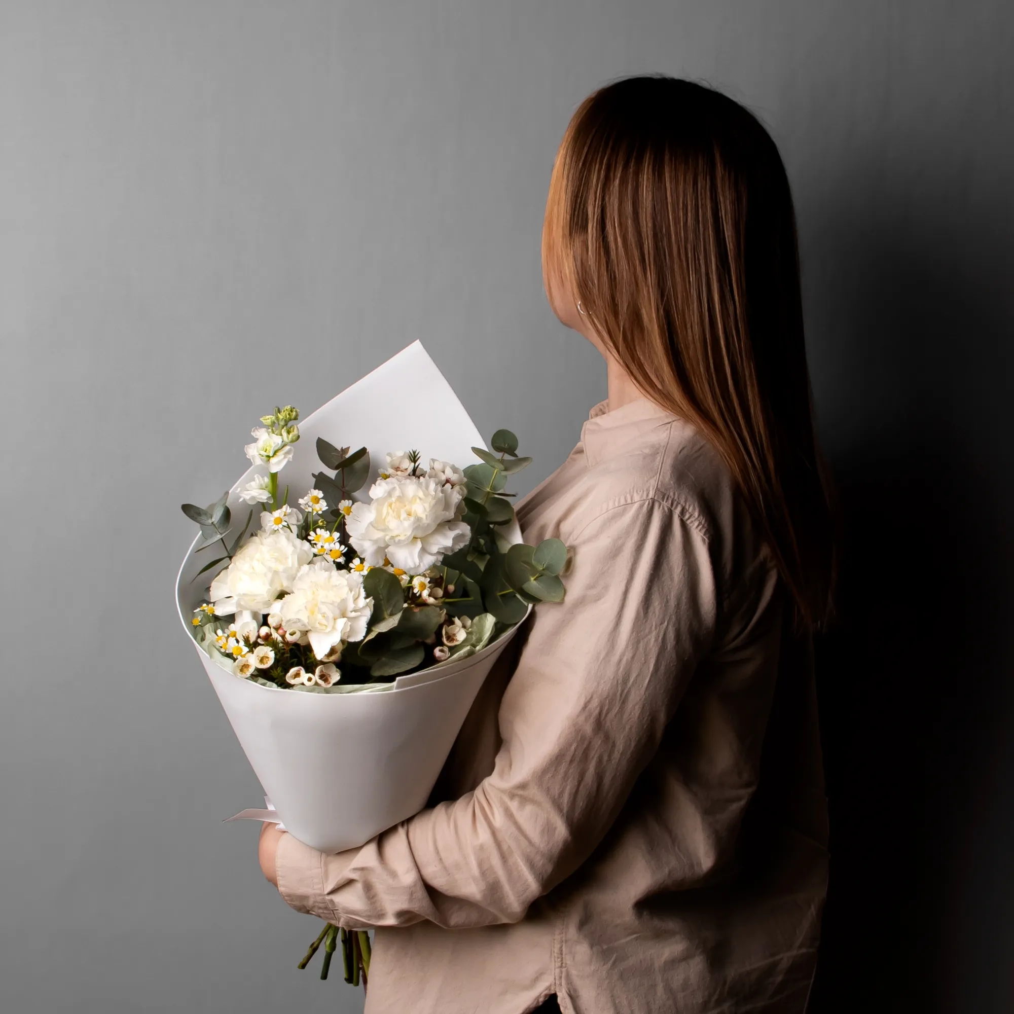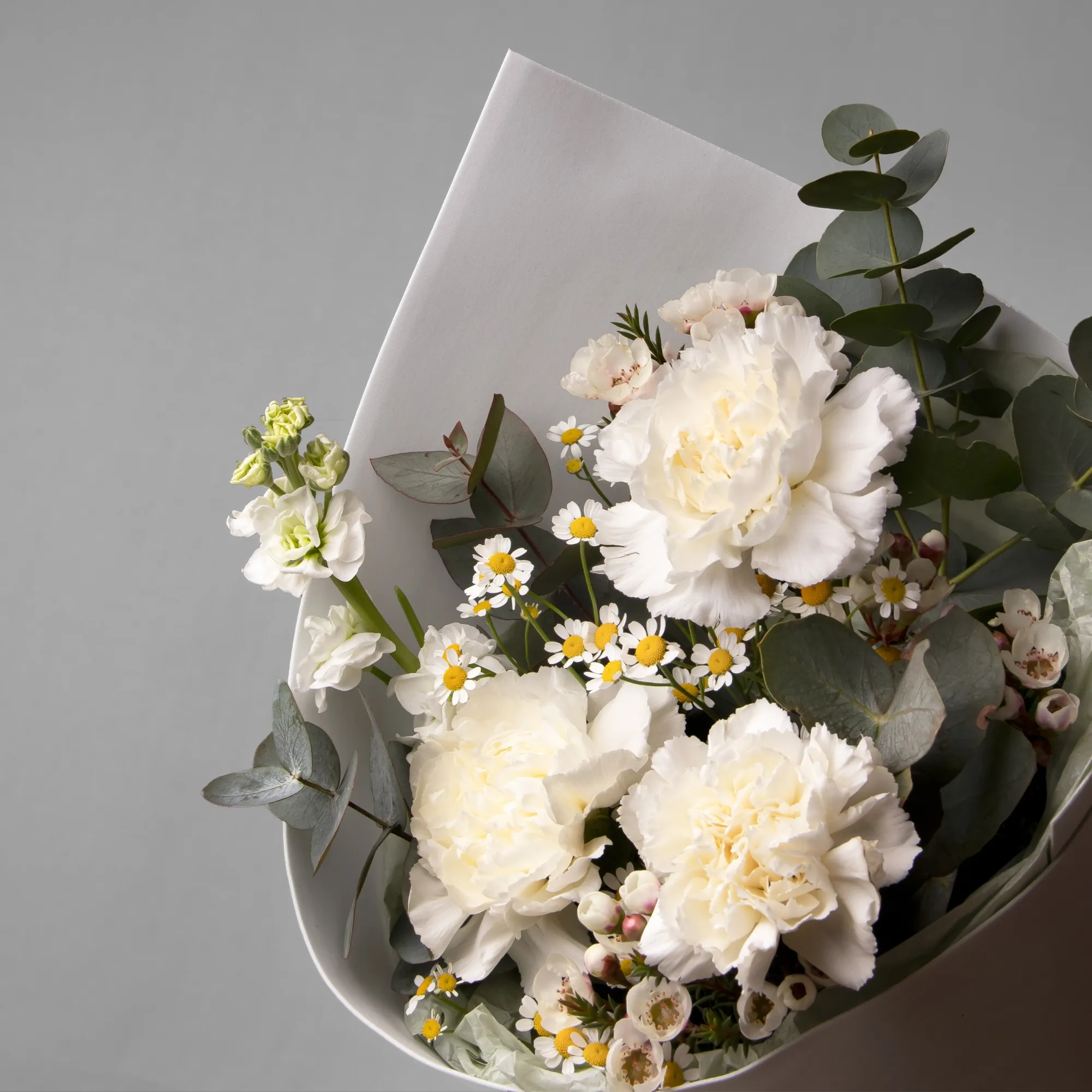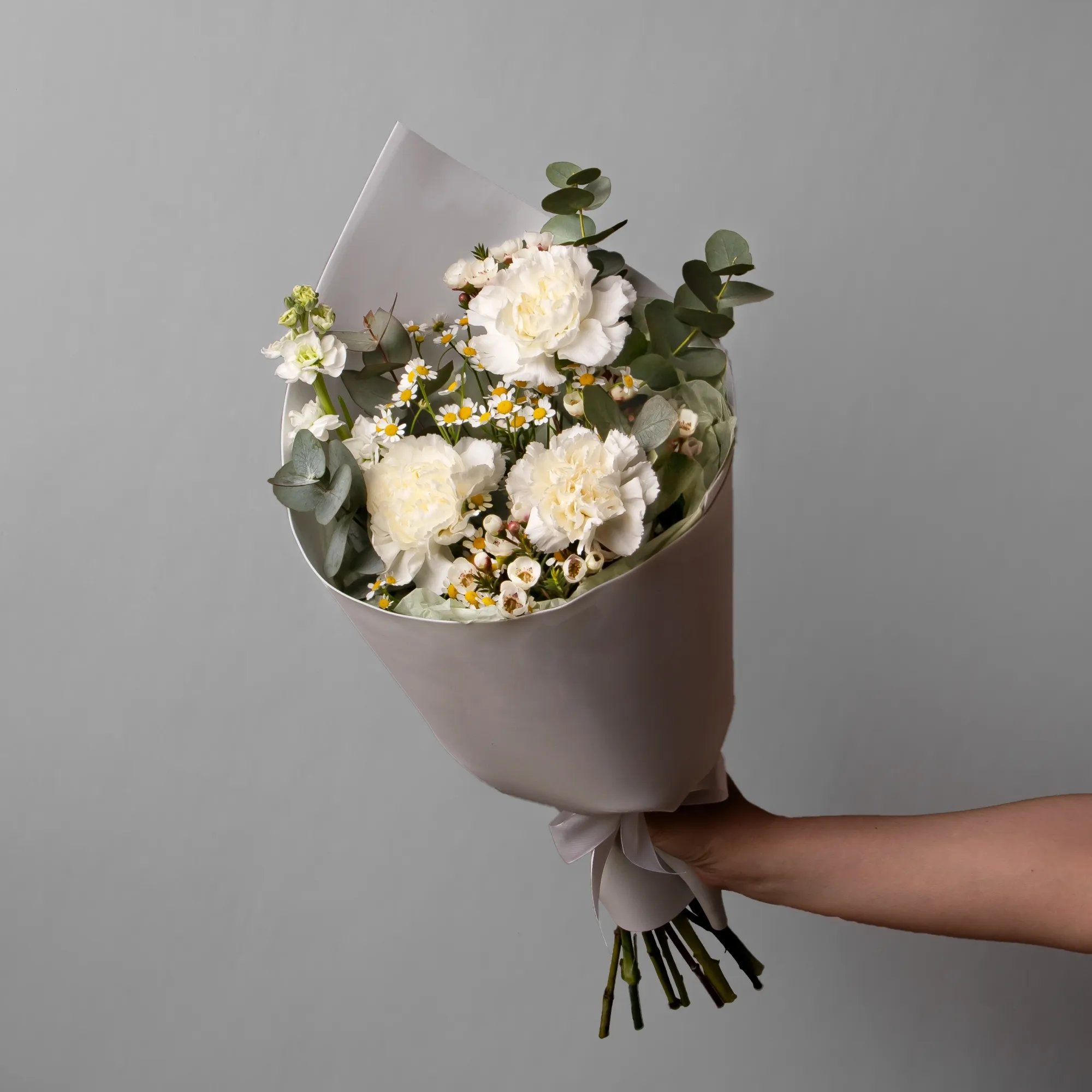 В составе букета "Воздух", белая гвоздика, белая маттиола, белый хамелациум, матрекария белая, дополнен листьями фисташки и эвкалипта.