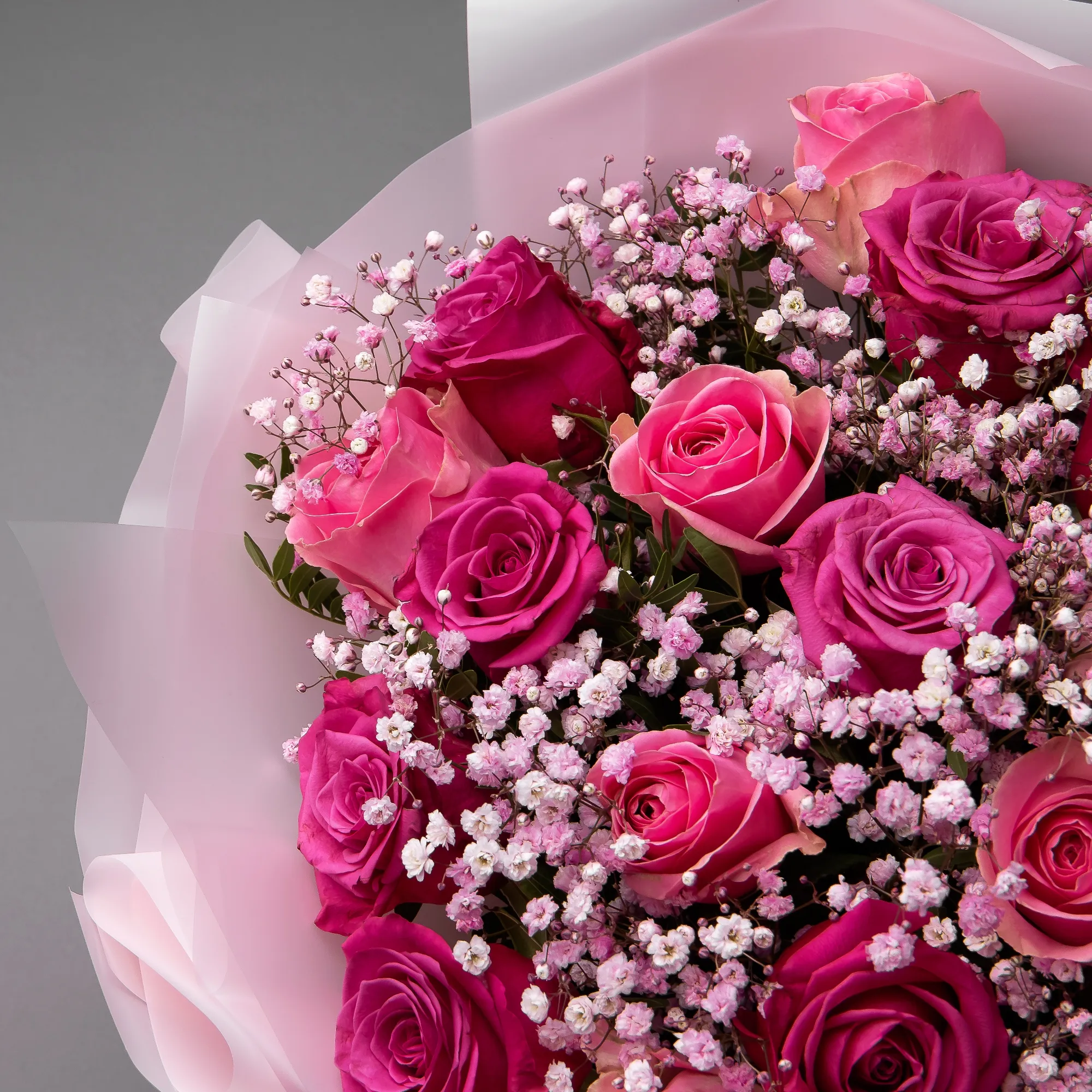 Яркий сочный букет, напоминающий тарелку спелых сладких ягод. Розовая цветовая гамма делает его любимцем многих девушек. В составе два сорта крупной розы - "Вэм" и "Кул Блу", а еще светло-розовая гипсофила, создающая объем и воздушность. Букет дополнен нежно-розовой упаковкой и лентой.