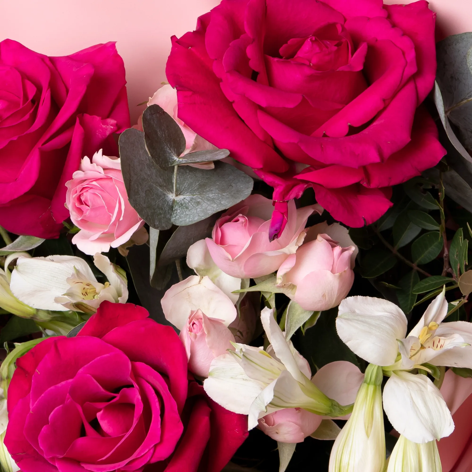 Роза, Альстромерия, Листья фисташки, Листья эвкалипта