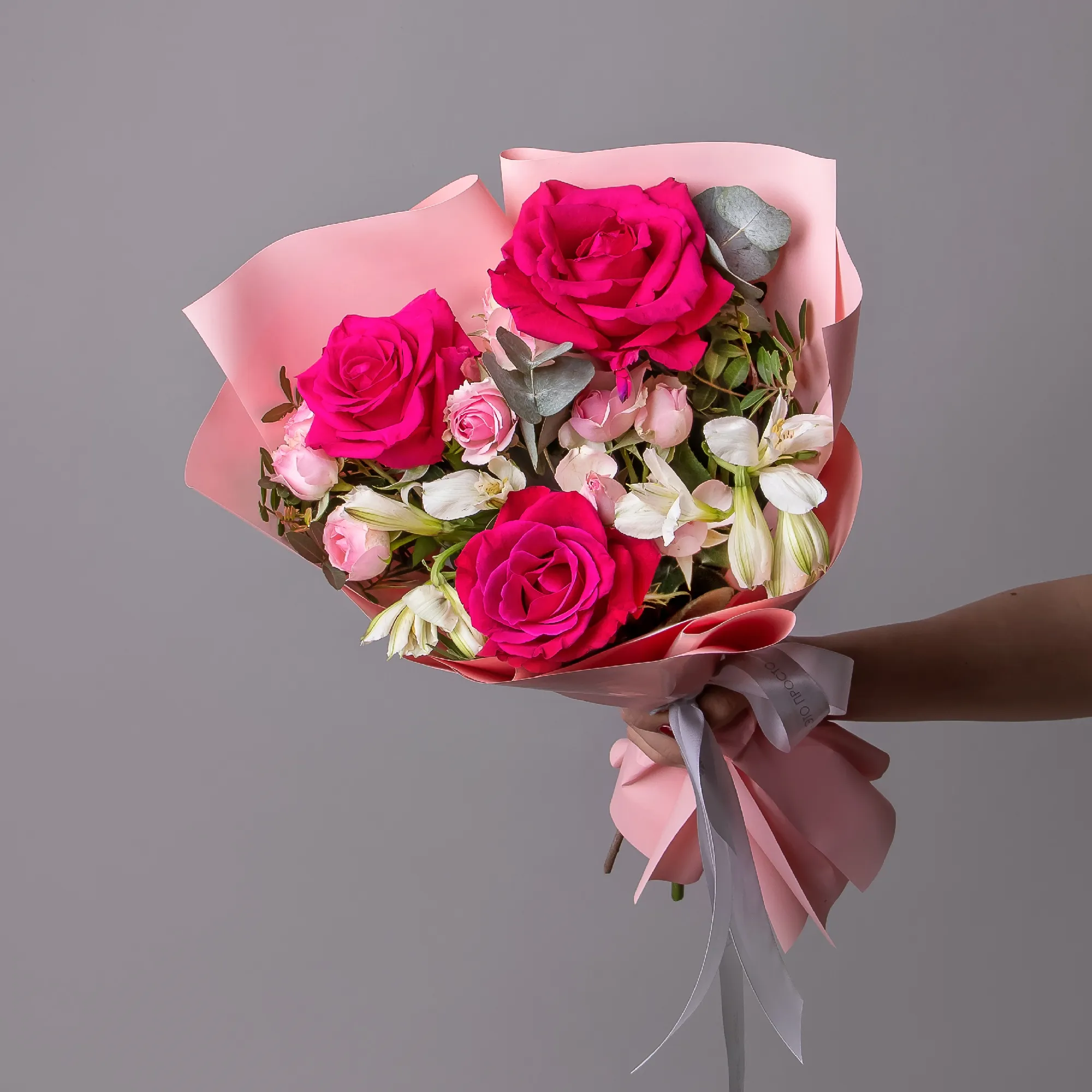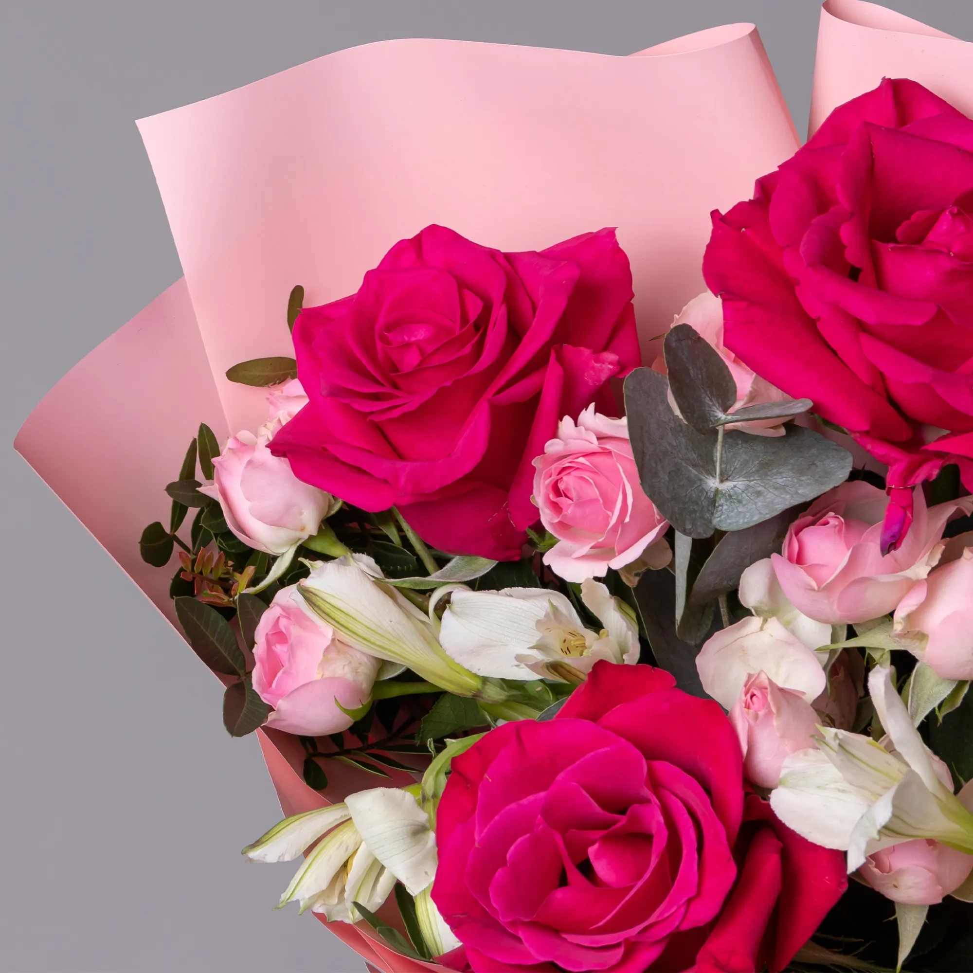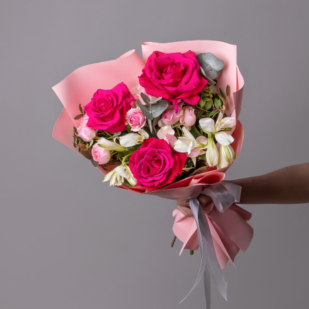 В составе букета "Ягодный шейк" в размере S кустовая роза "Динара", белая альстромерия, роза "Эвер пинк". Букет идеально дополнит любое торжество, будь то день рождения, юбилей или годовщина.
