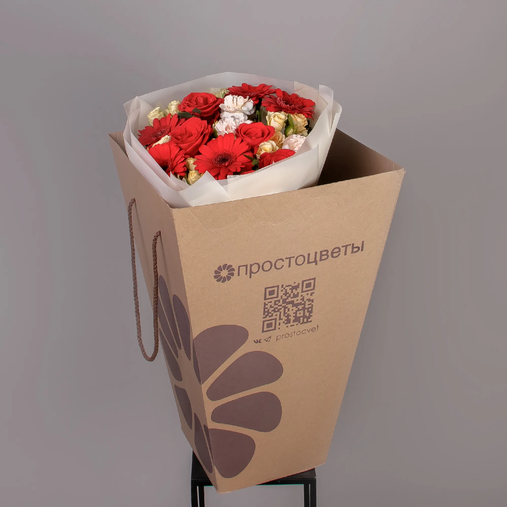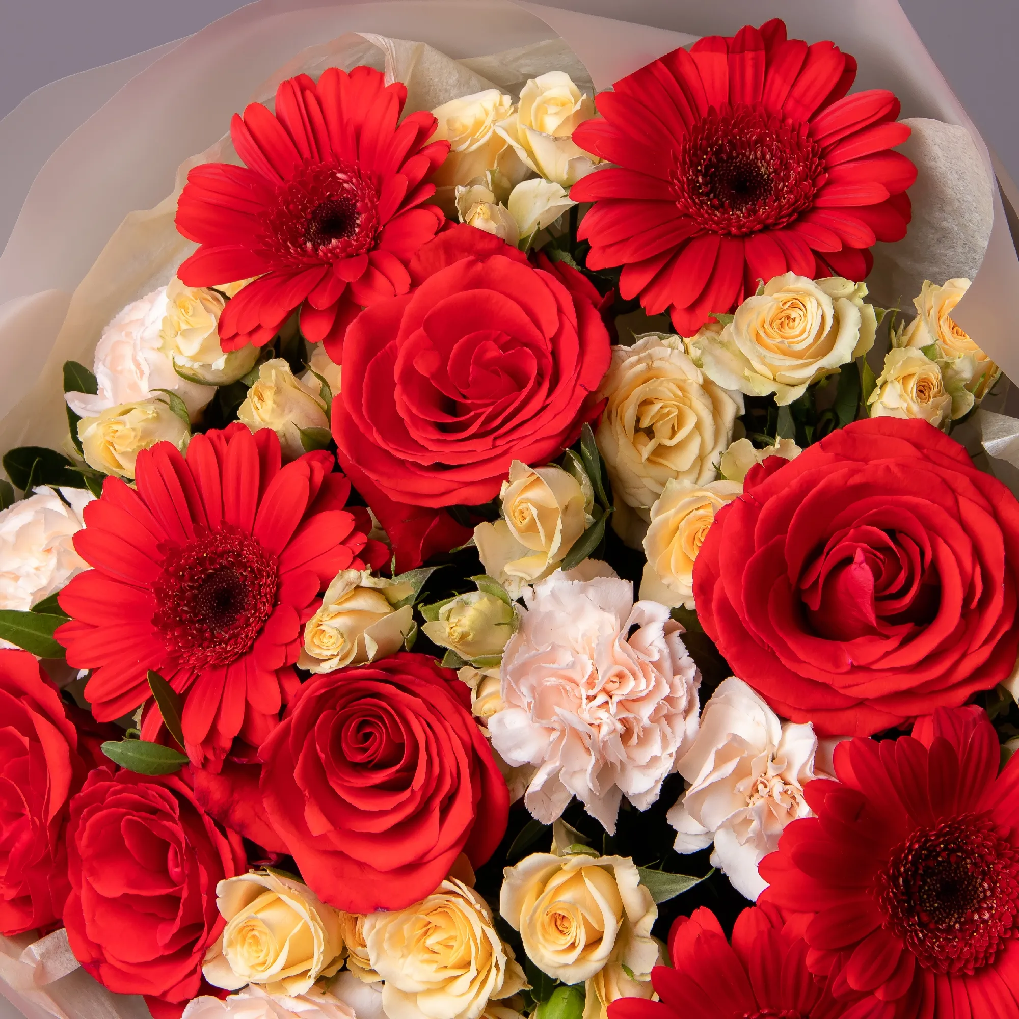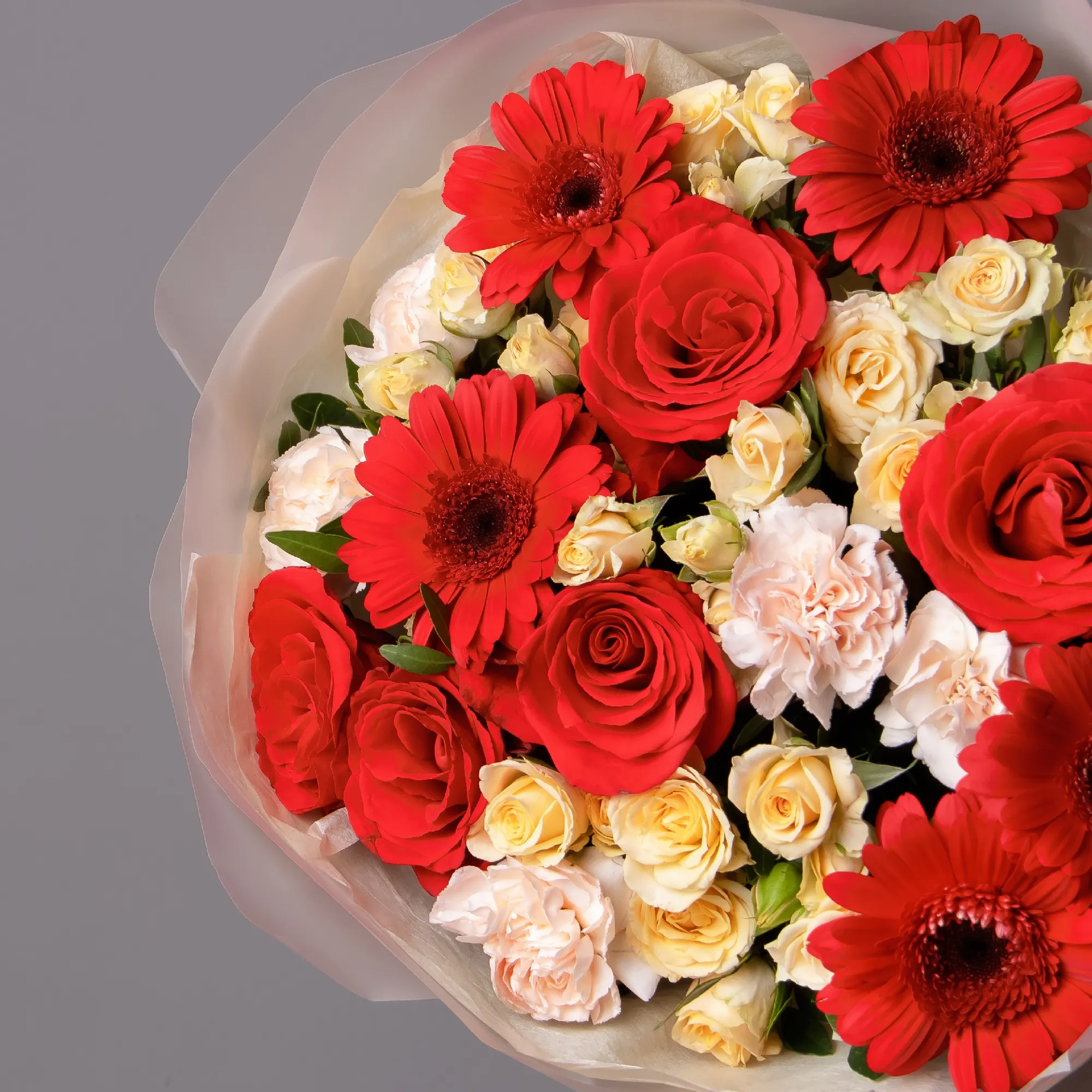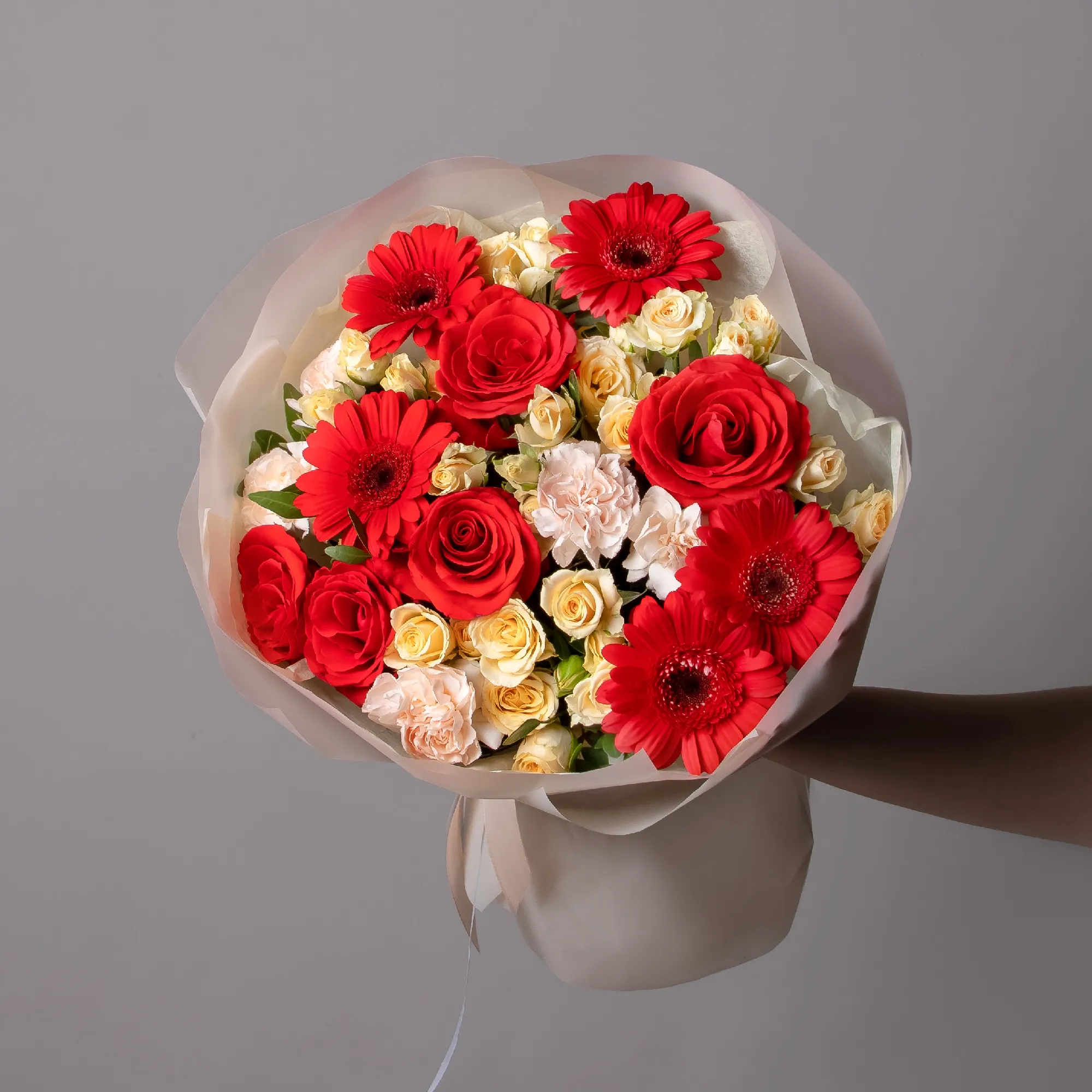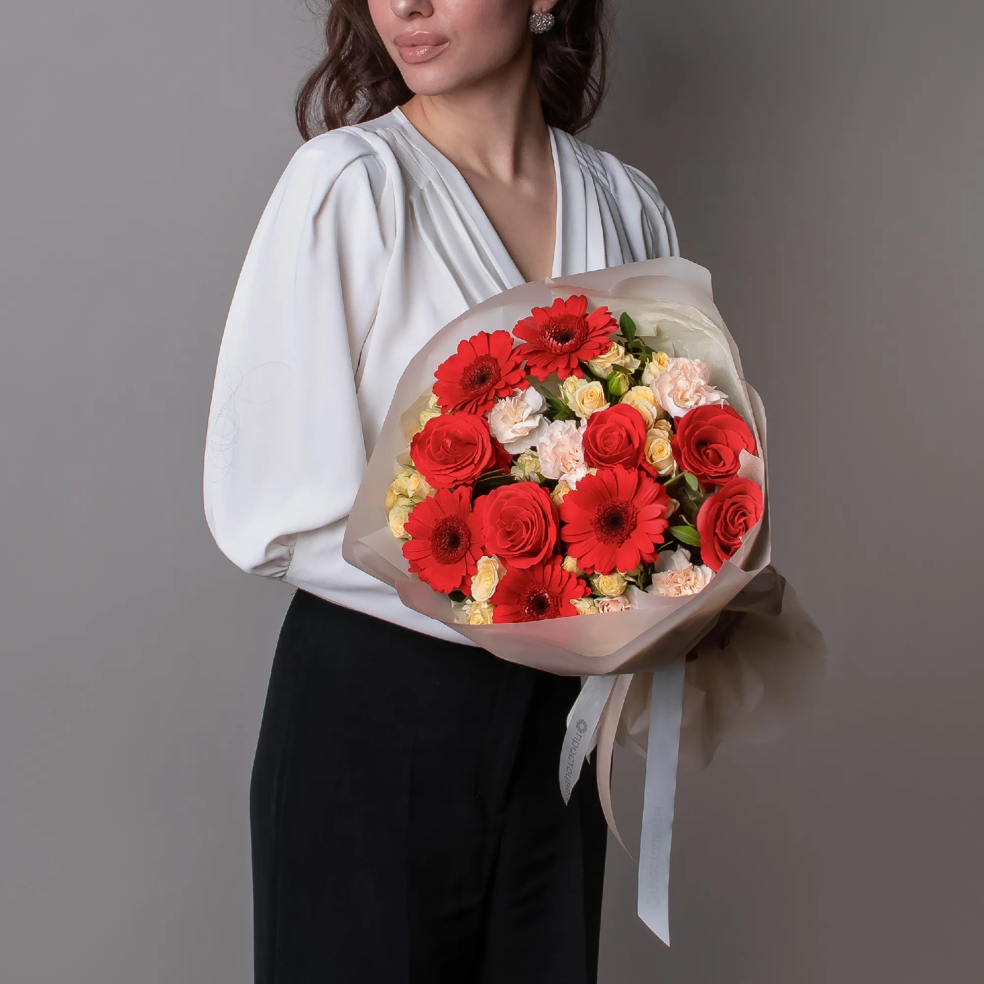 В составе букета "Яркая мозаика" в размере М кремовая кустовая роза "Солинеро", ярко-алая роза "Нина", белая гвоздика и красная гермини. Порадуйте этим букетом близкого вам человека, подарив вместе с ним яркие эмоции.