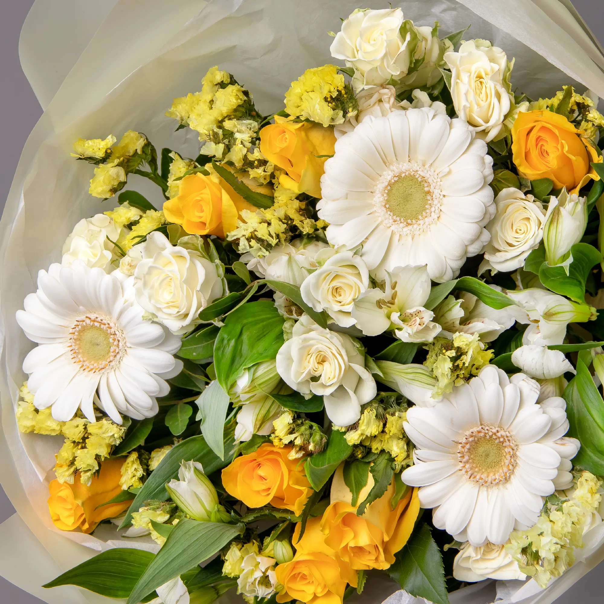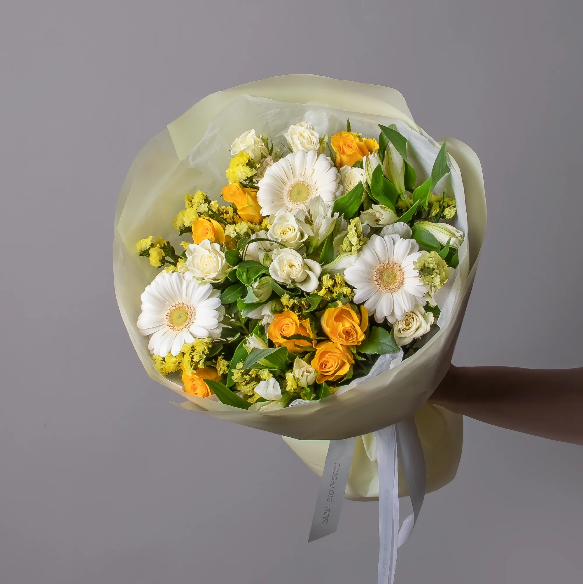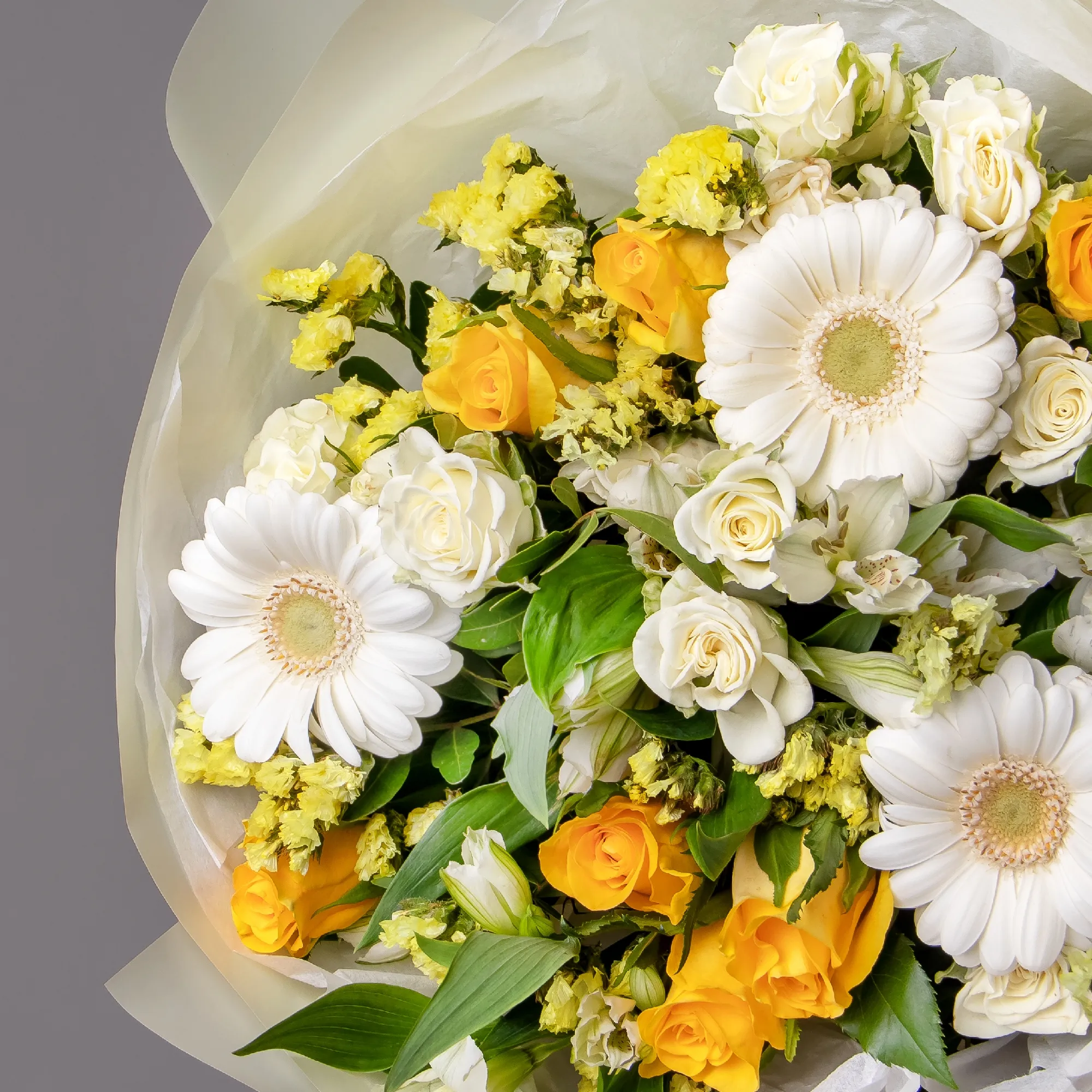 В составе букета "Яркий день" кустовая роза "Сноу флейк", белая альстромерия, ярко-желтая роза "Мун Вок", желтая статица и белая гермини. Букет согреет своим теплом даже в самый пасмурный день.