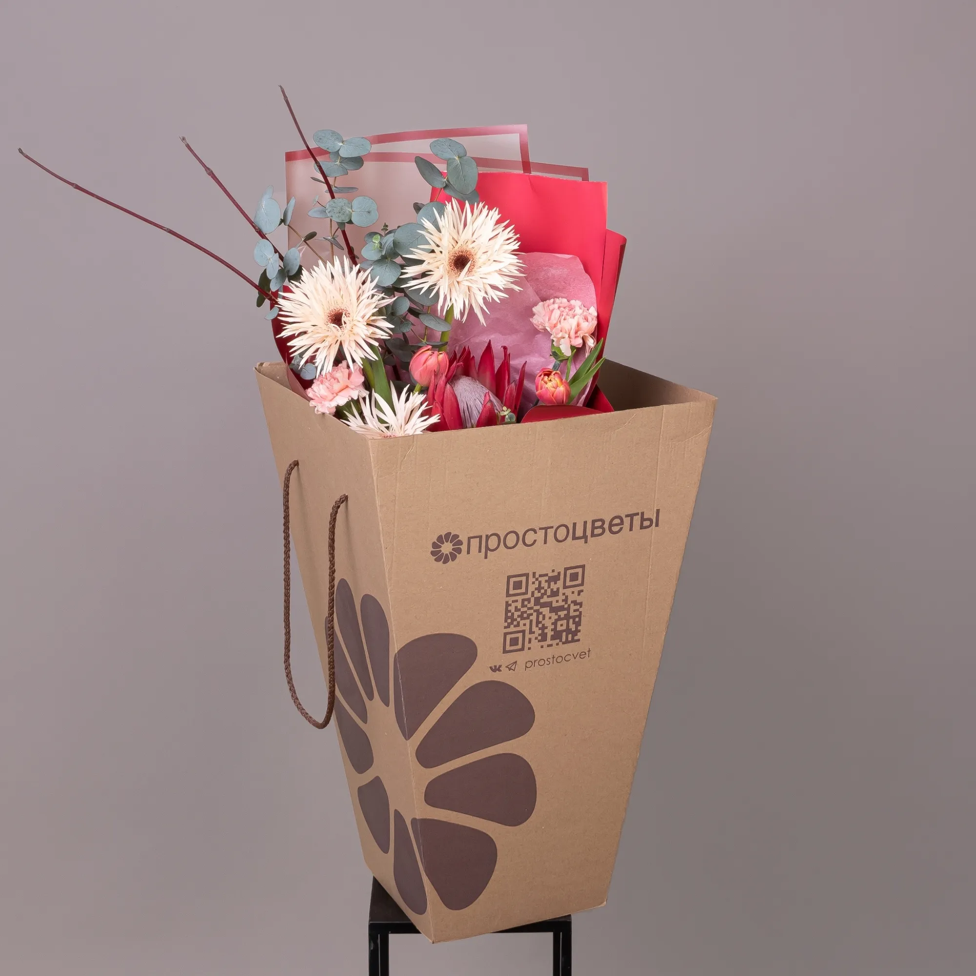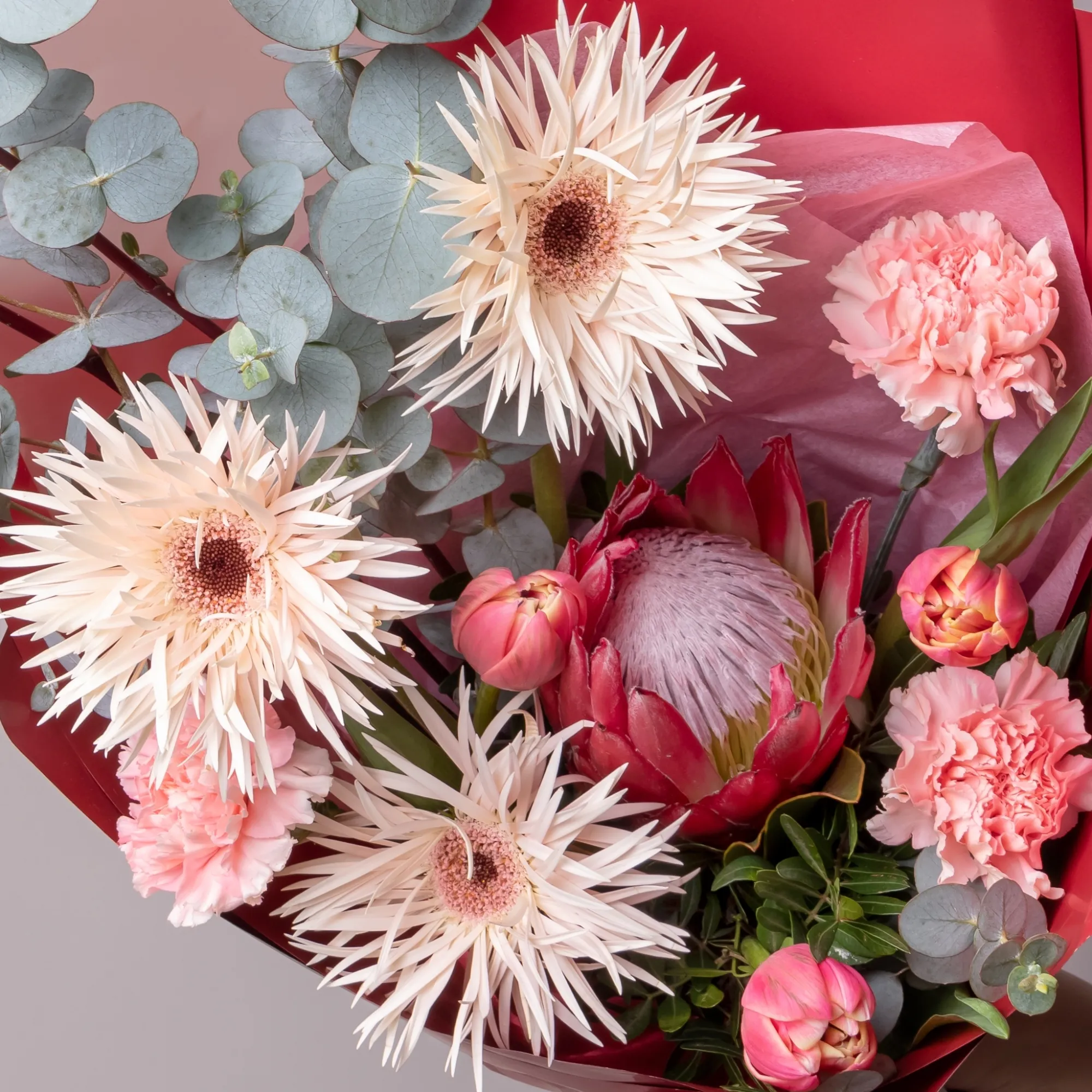 Гвоздика-3, Гербера-3, Тюльпан-3, Протея-1, Листья фисташки-3, Листья эвкалипта-5