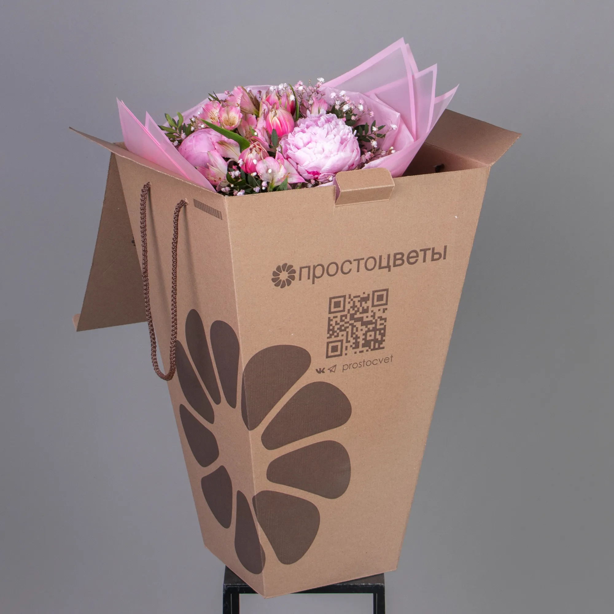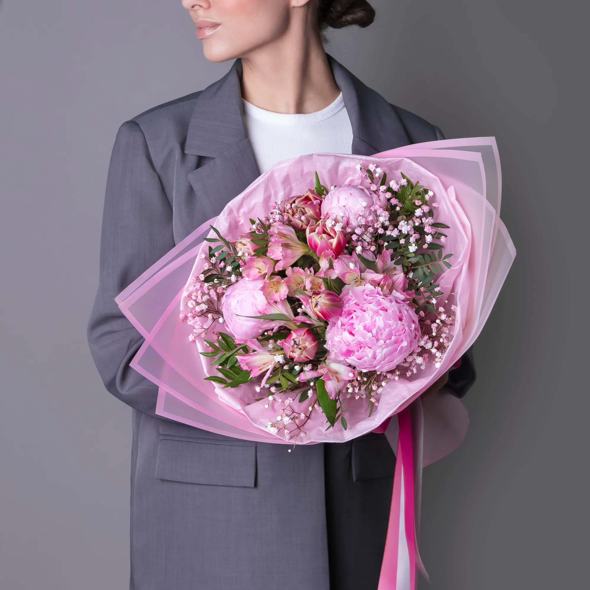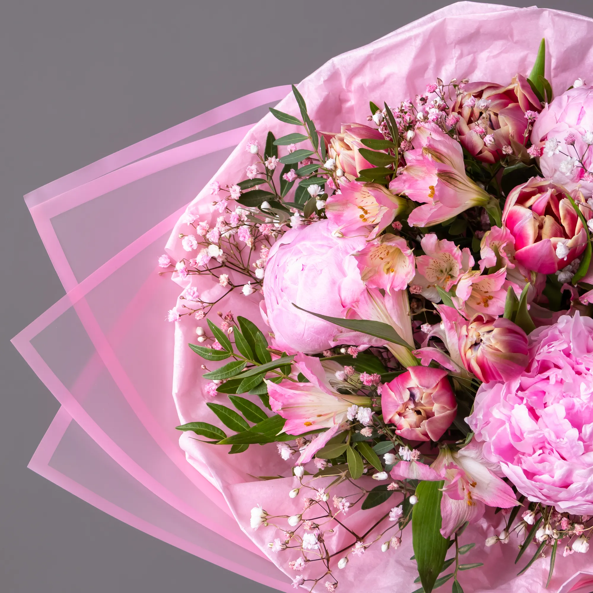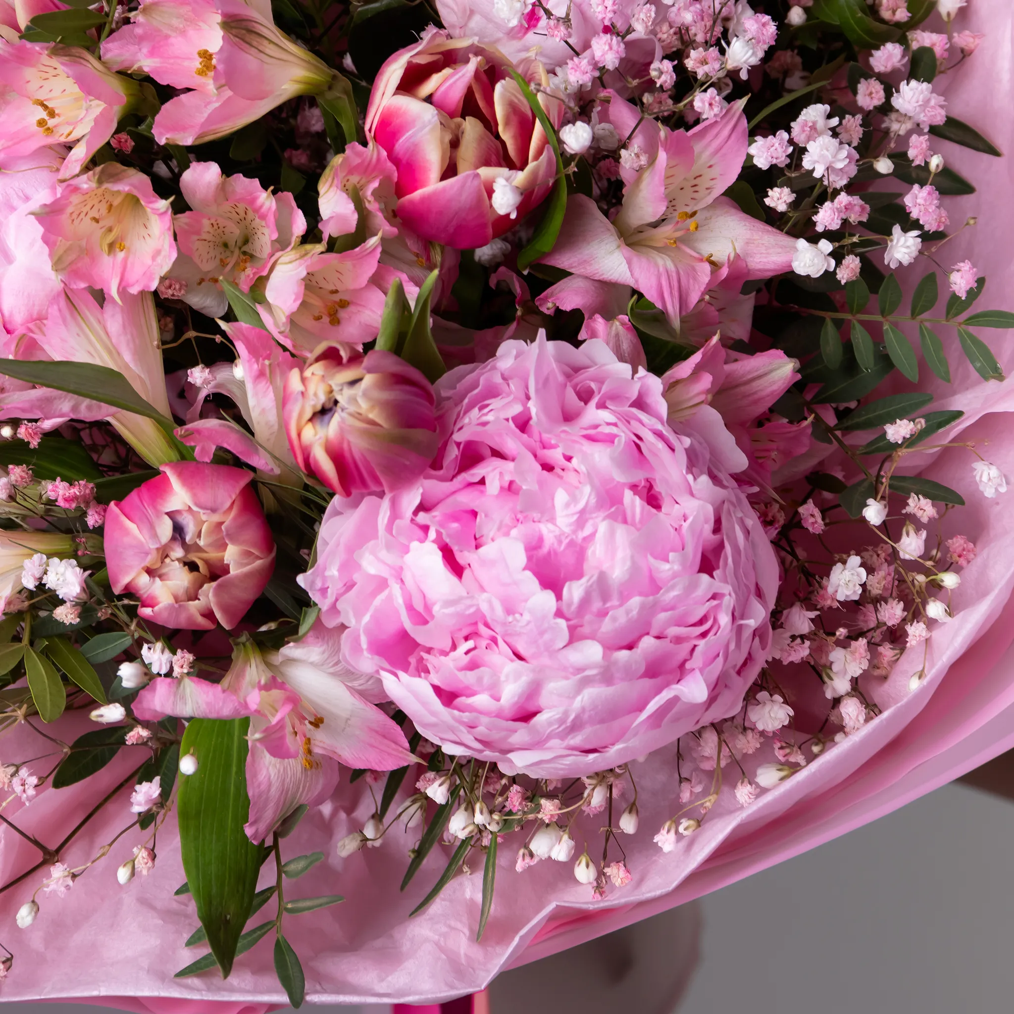 Пион, Тюльпан, Альстромерия, Гипсофила, Листья фисташки