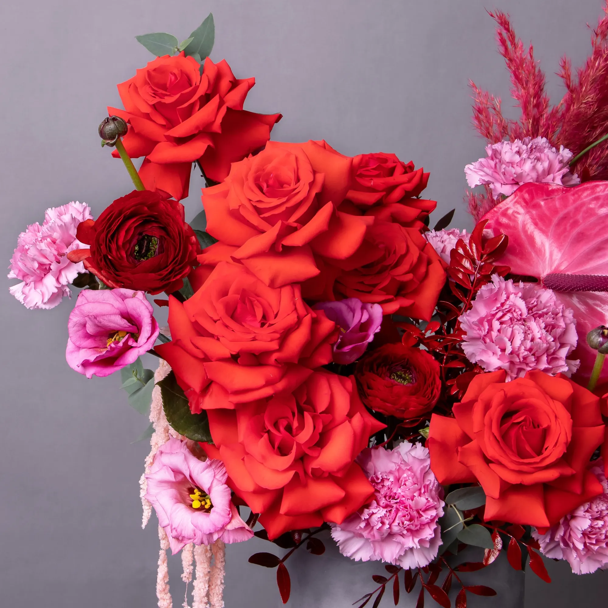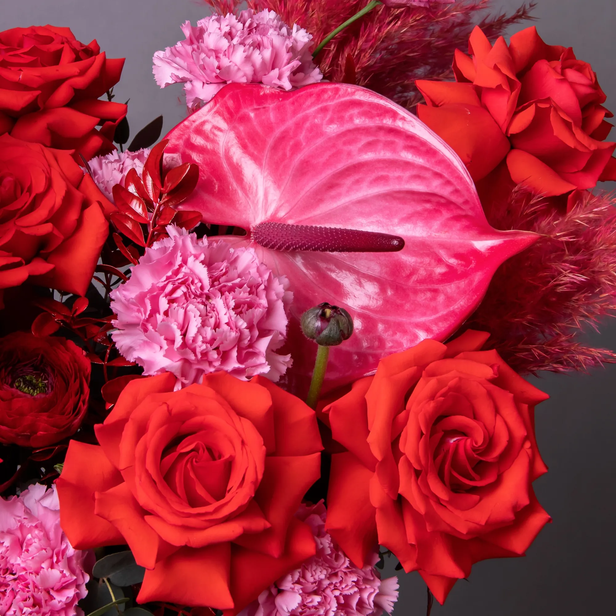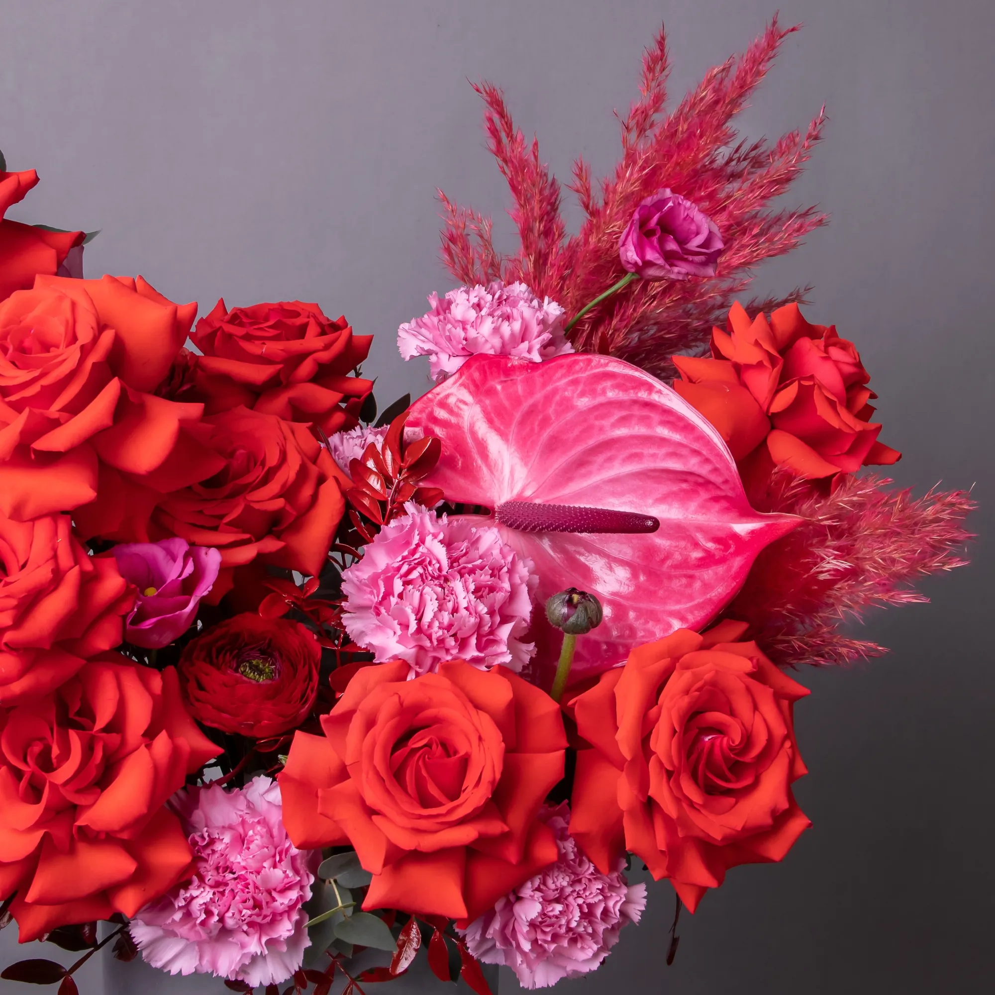 Гвоздика-7, Роза-10, Антуриум-1, Эустома-3, Ранункулюс-2, Листья фисташки-3, Листья эвкалипта-2