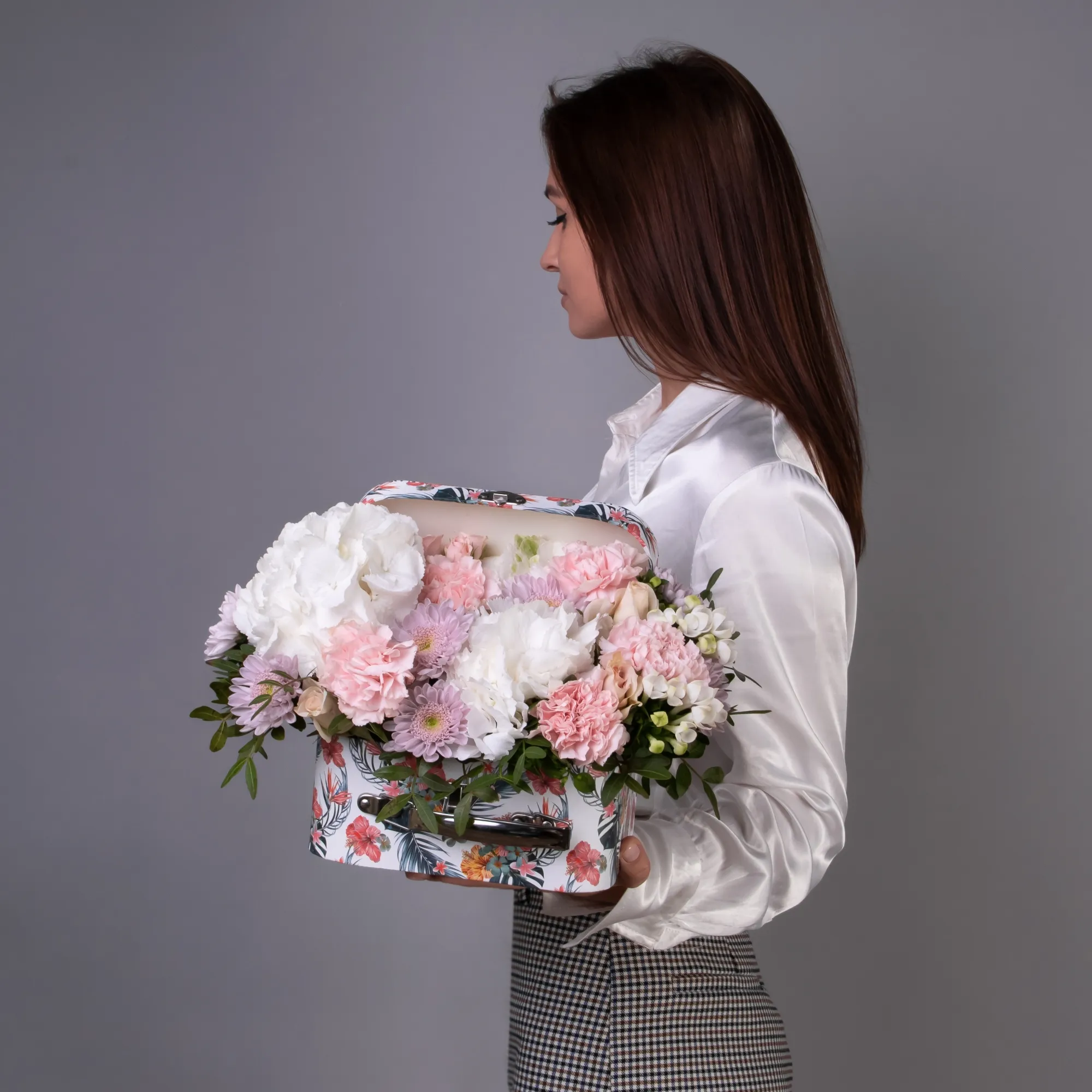 Цветы в составе данной композиции могу меняться, в зависимости от сезонности и задумки флориста-дизайнера.